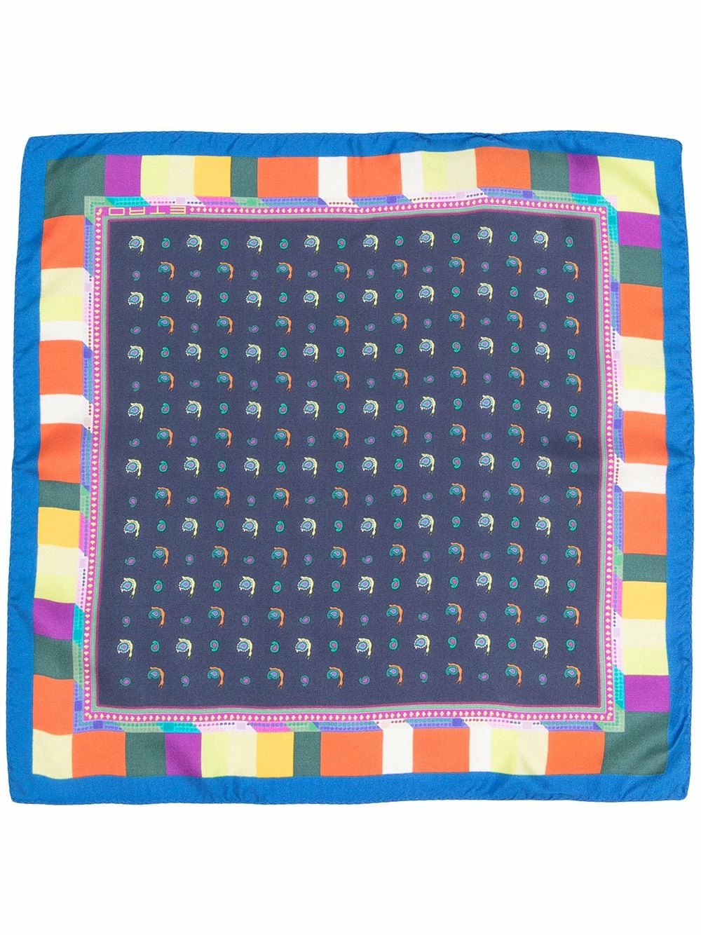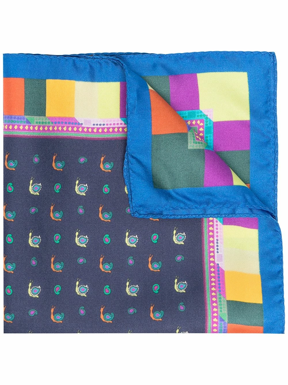 Design colour block, motif cachemire, forme carrée, bords finis. Matière : soie.