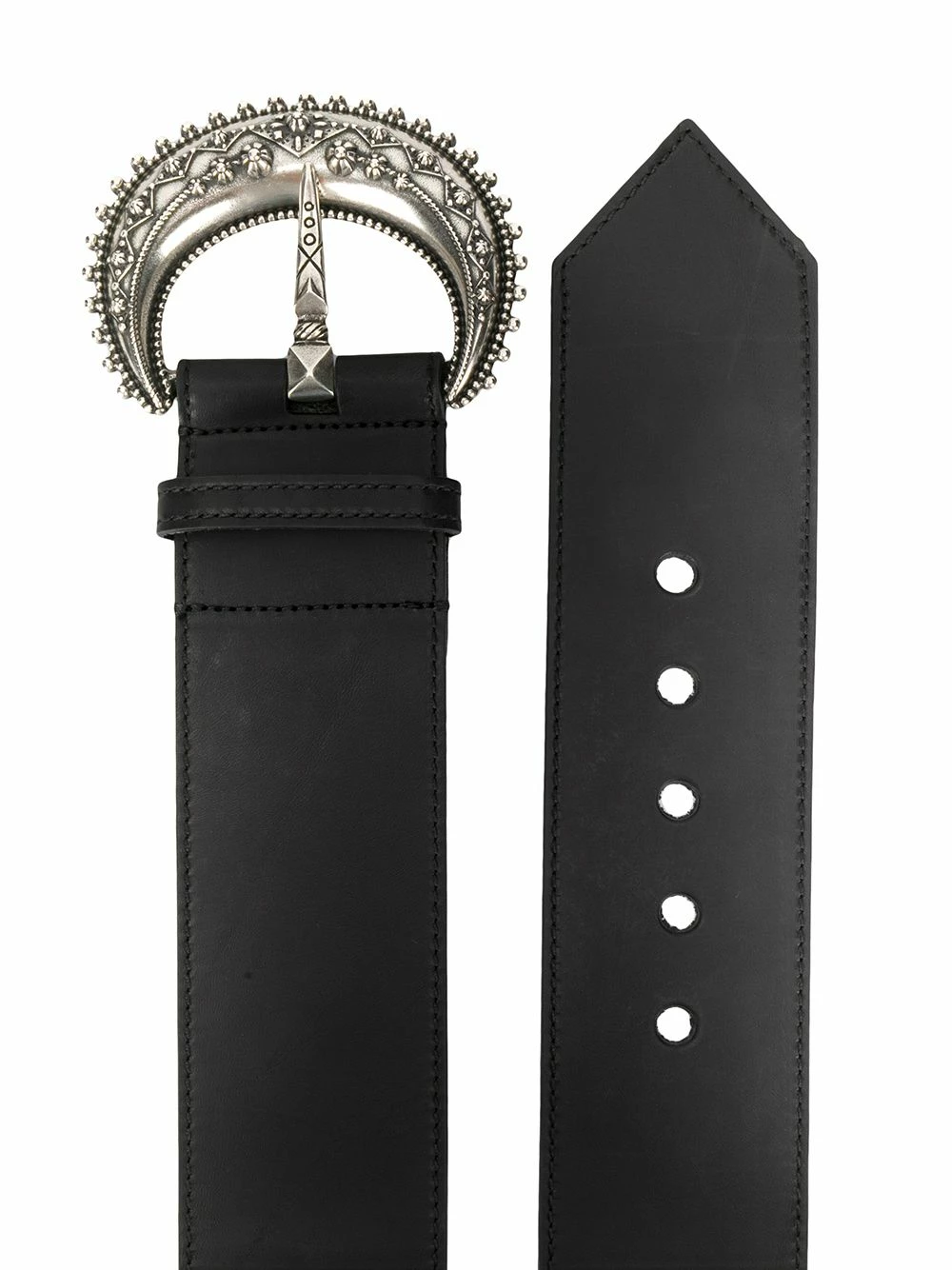 Ceinture à boucle embossée en cuir Etro avec détails argentés, longueur classique et design en pointe. Couleur : noir.