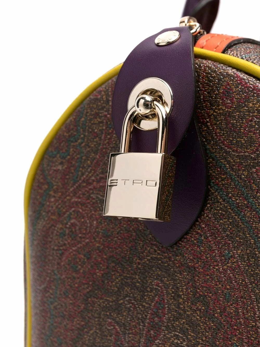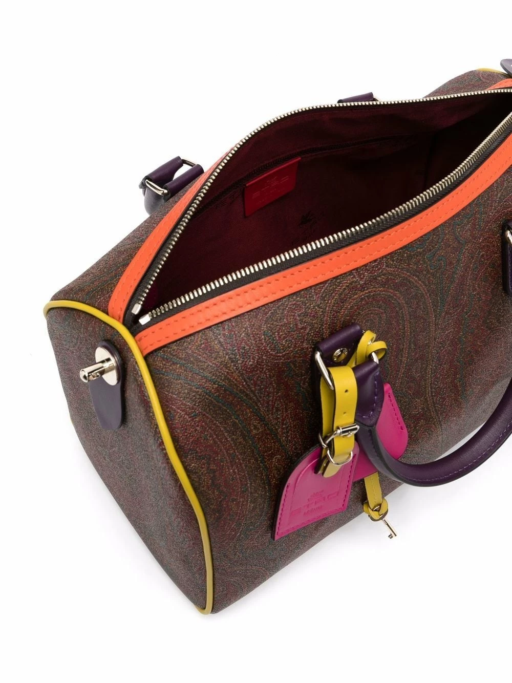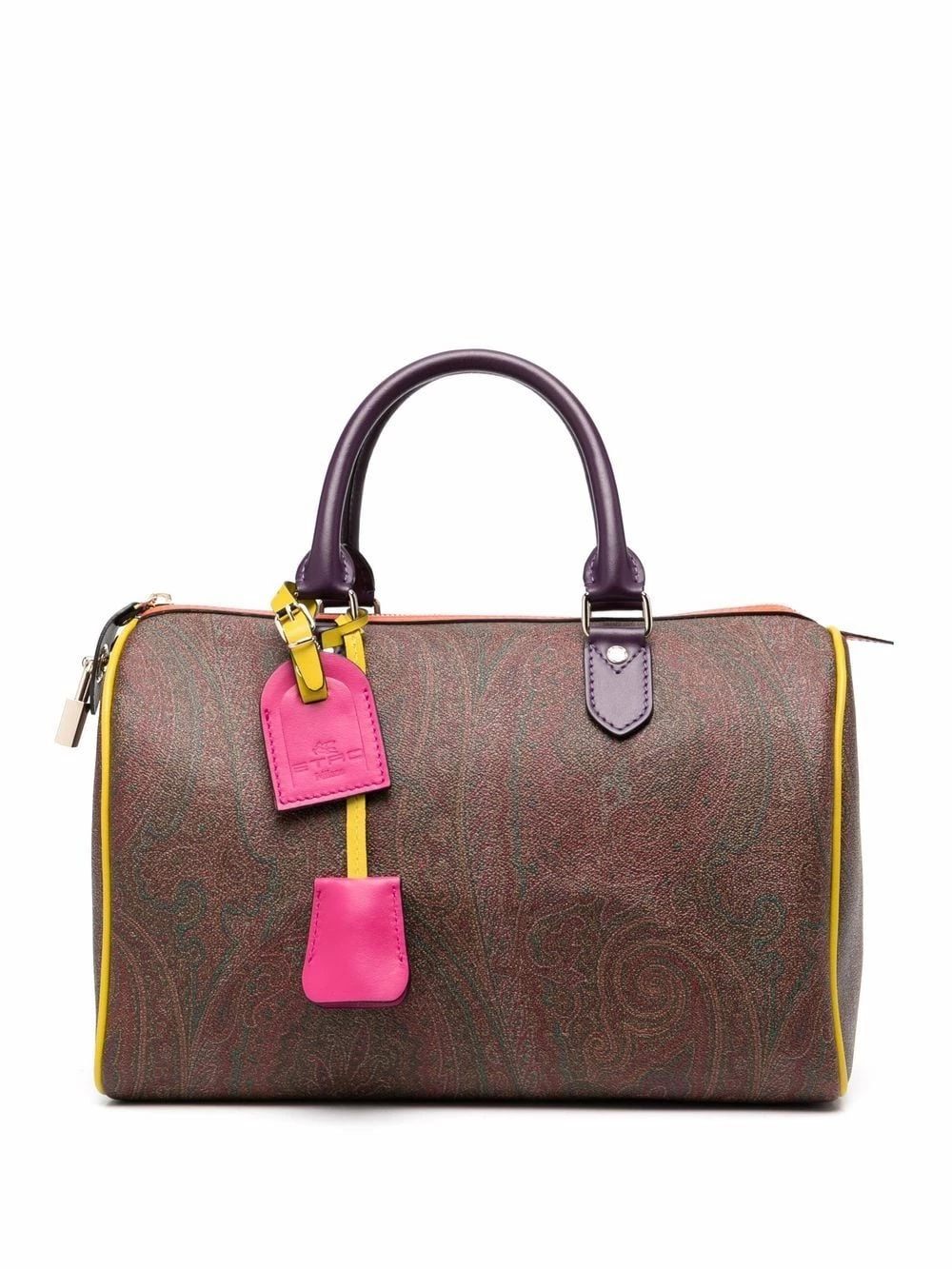 Motif cachemire, fermeture zippée sur le dessus, anses arrondies, étiquette en cuir. Couleur : marron.