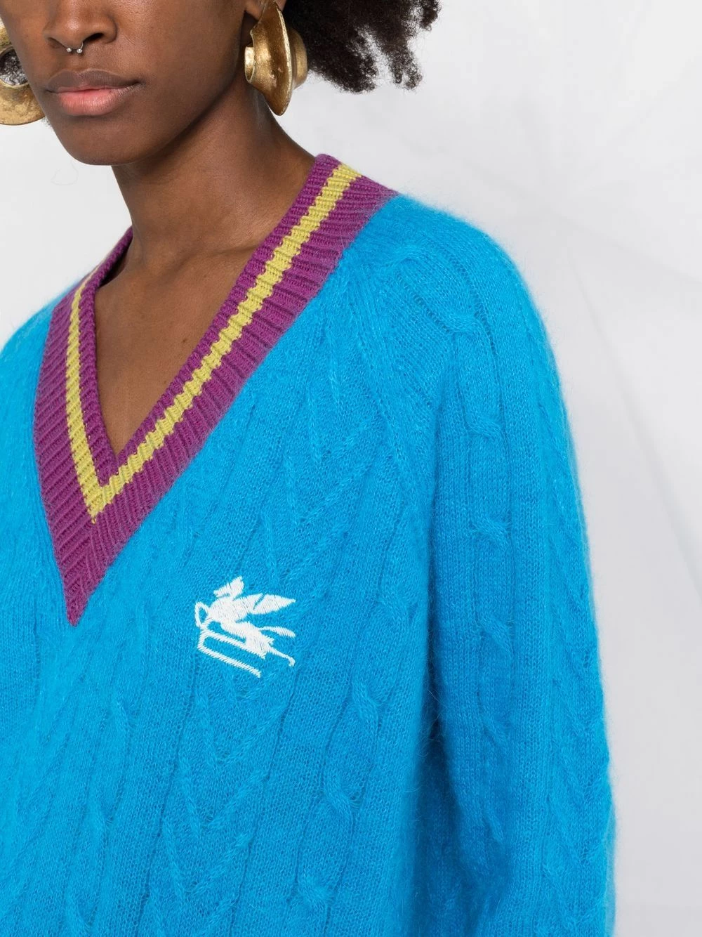 Tricot torsadé, détail nervuré, logo brodé sur la poitrine, bordures rayées, col v, manches longues.