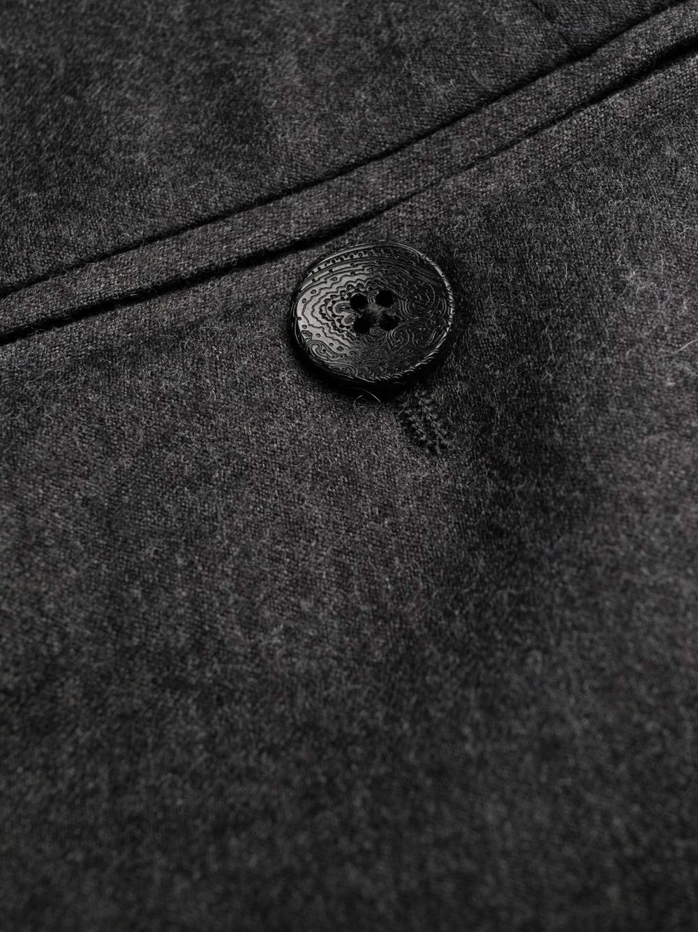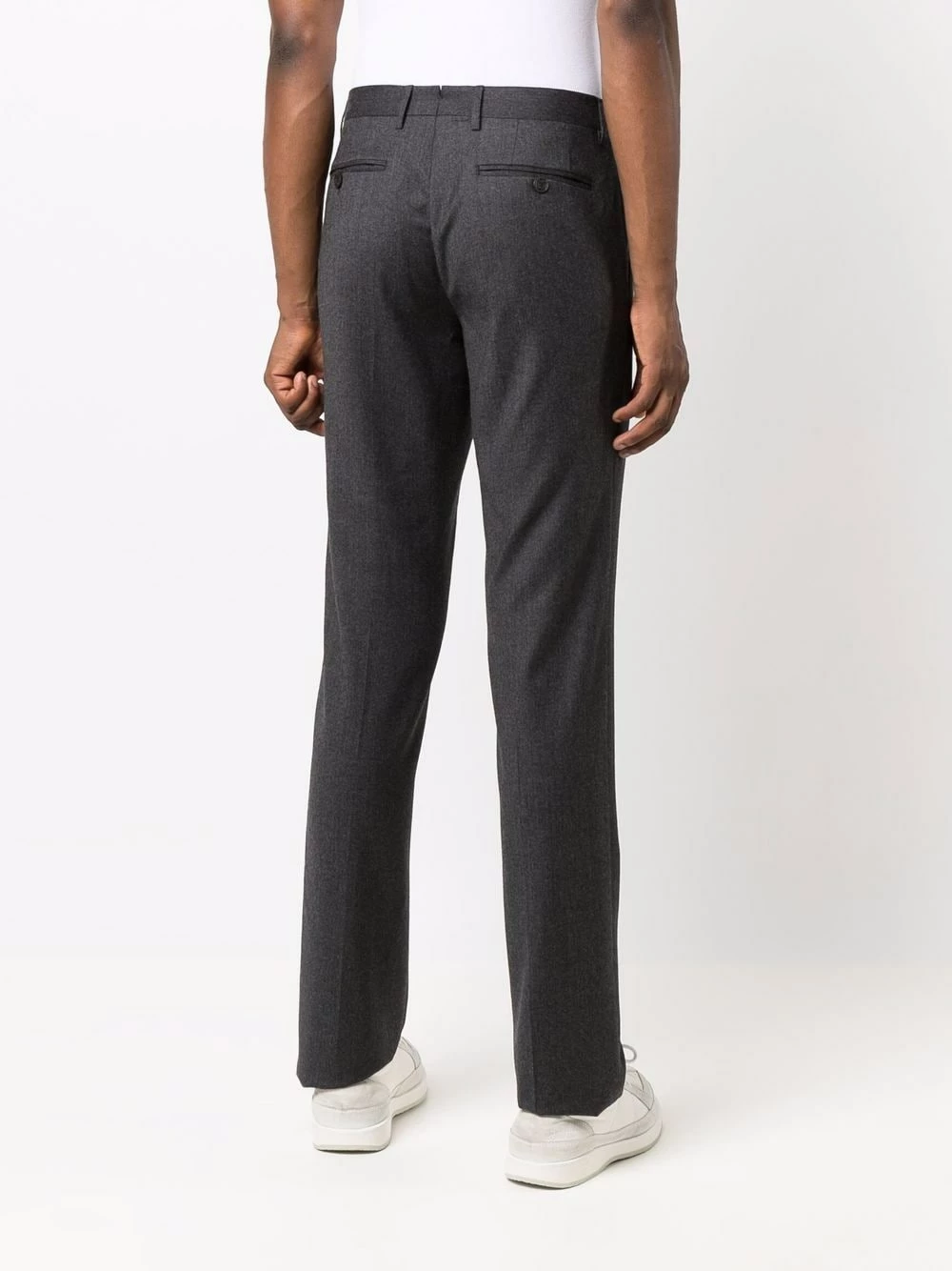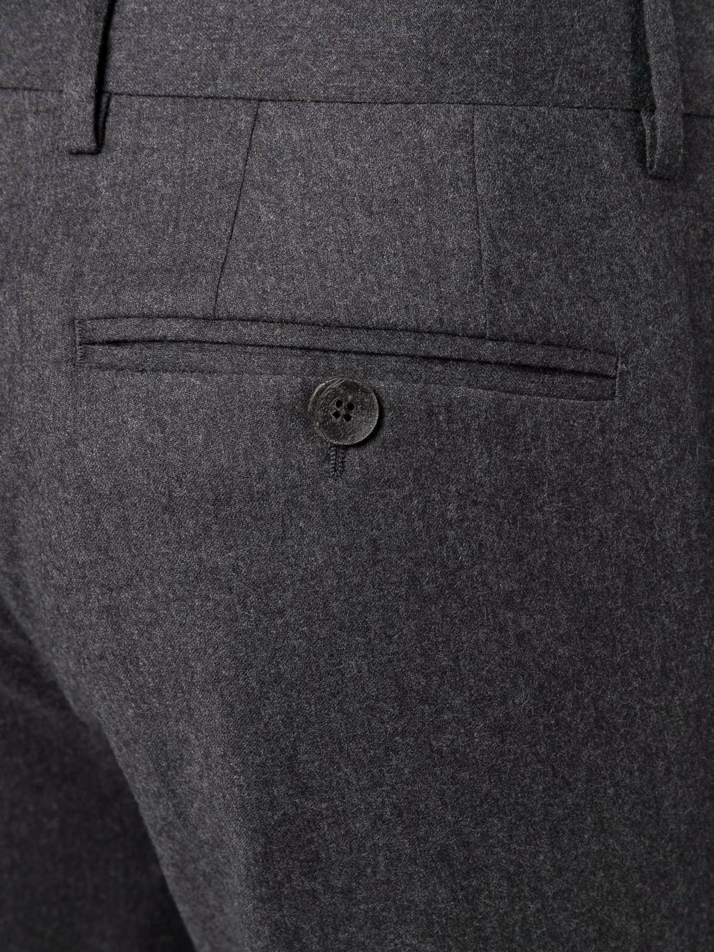 Passants de ceinture, fermeture dissimulée sur le devant, poches arrière passepoilées, coupe droite. Matière : laine.
