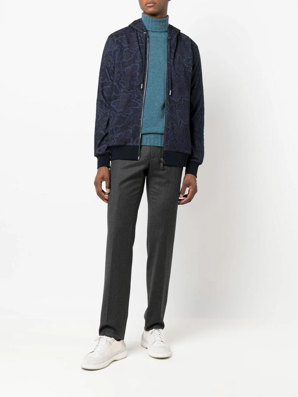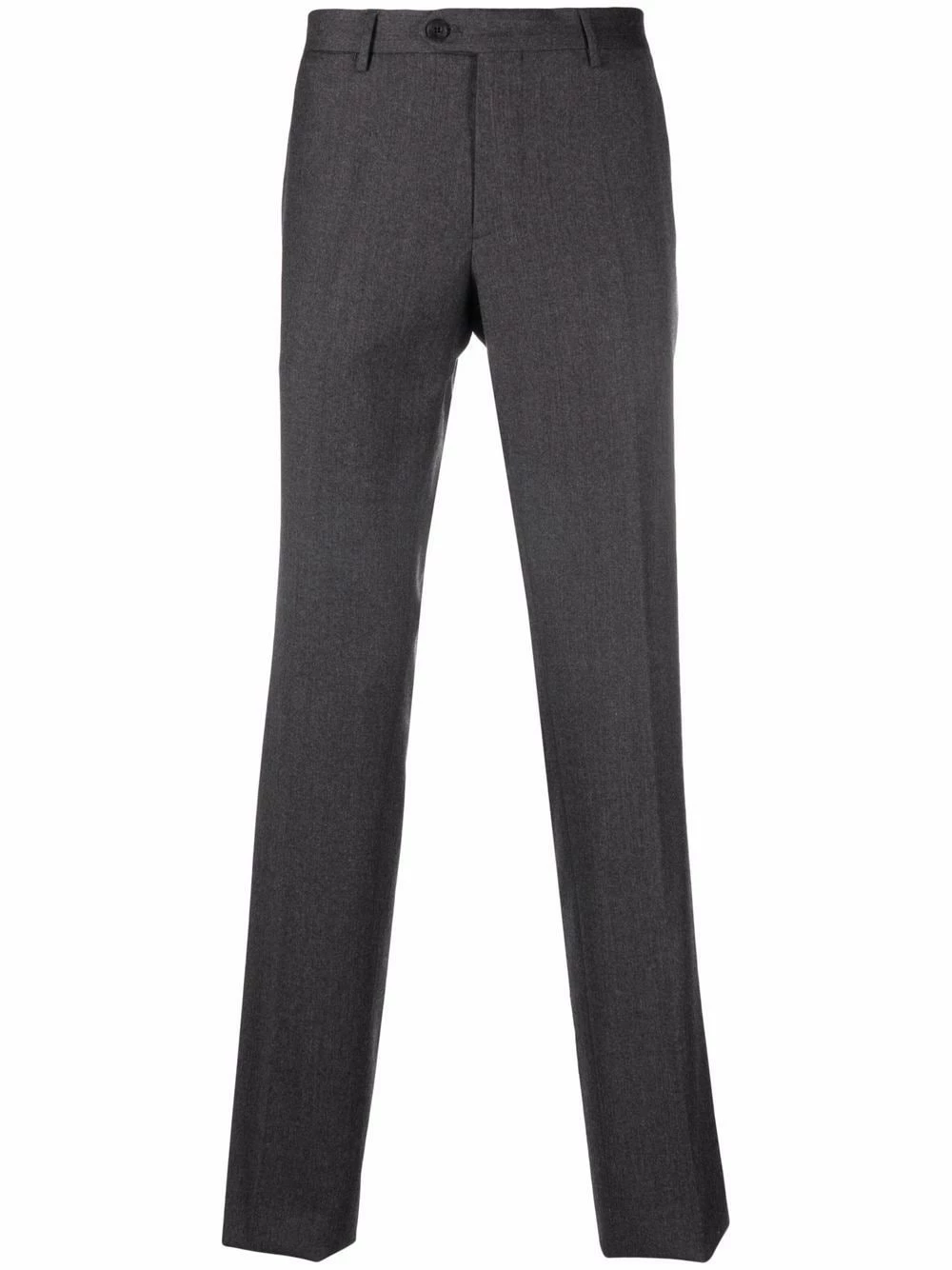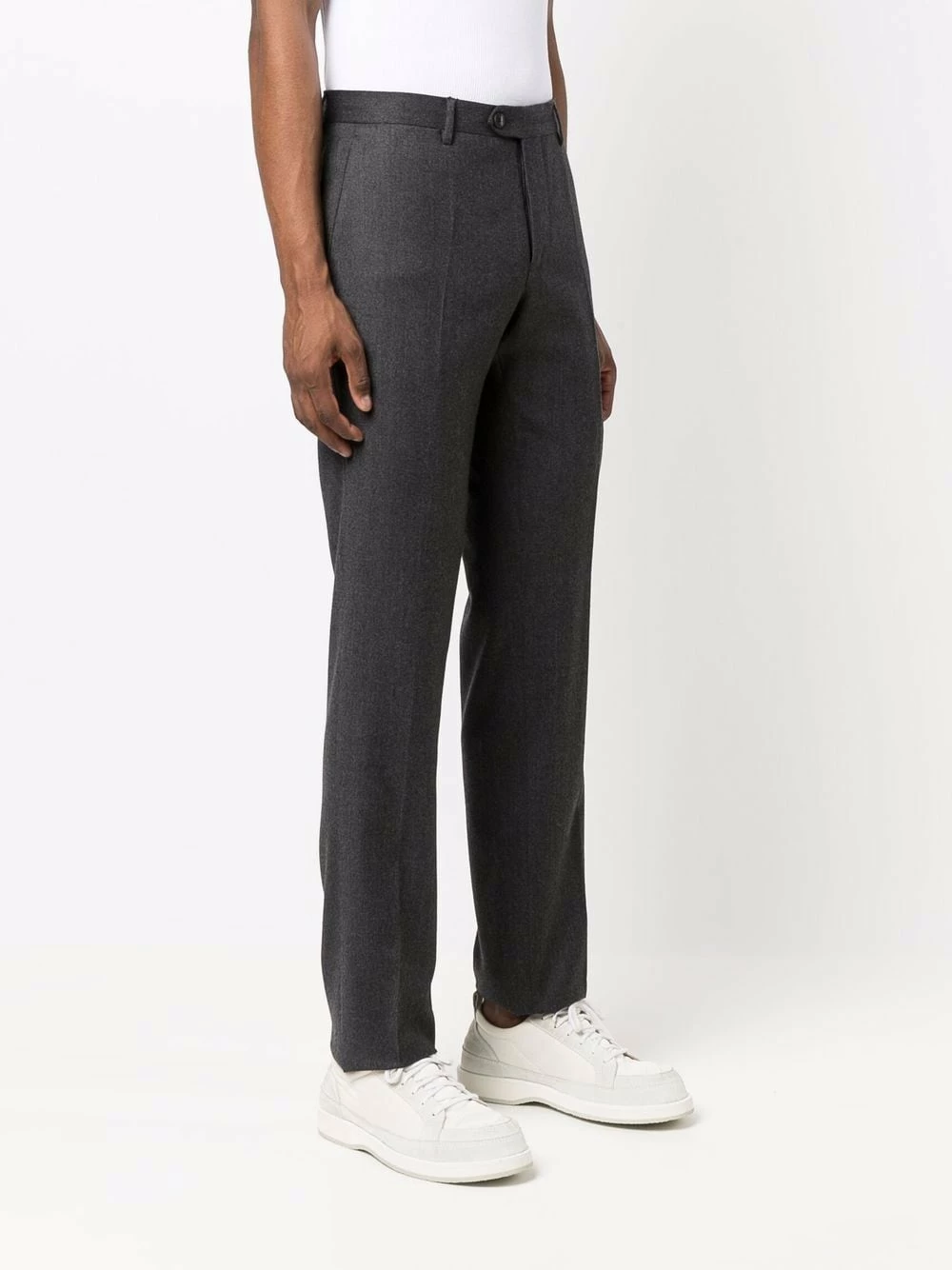 Passants de ceinture, fermeture dissimulée sur le devant, poches arrière passepoilées, coupe droite. Matière : laine.