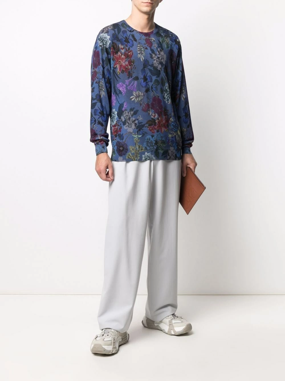 Motif de fleurs, maille fine, encolure ras du cou, manches longues, poignets nervurés, ourlet nervuré.