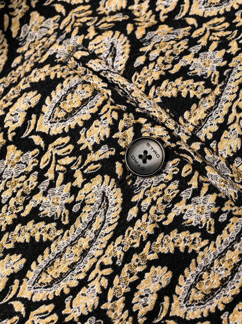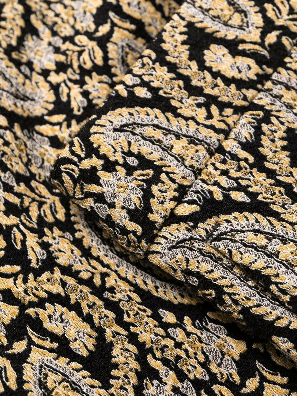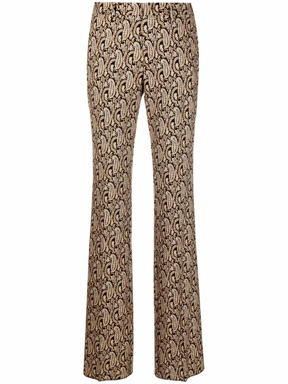 Motif cachemire, taille haute, deux poches latérales fendues, poches arrière passepoilées, passants de ceinture, fermeture dissimulée sur le devant.