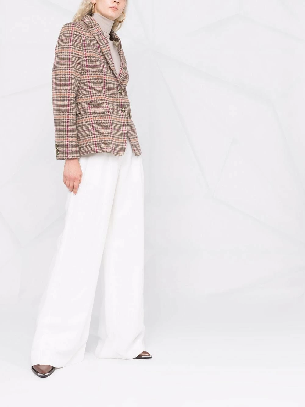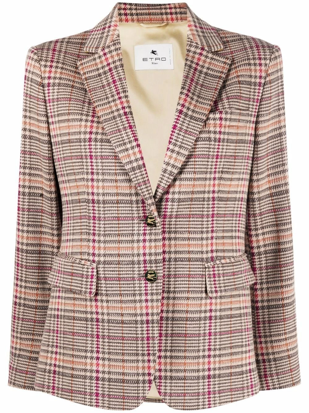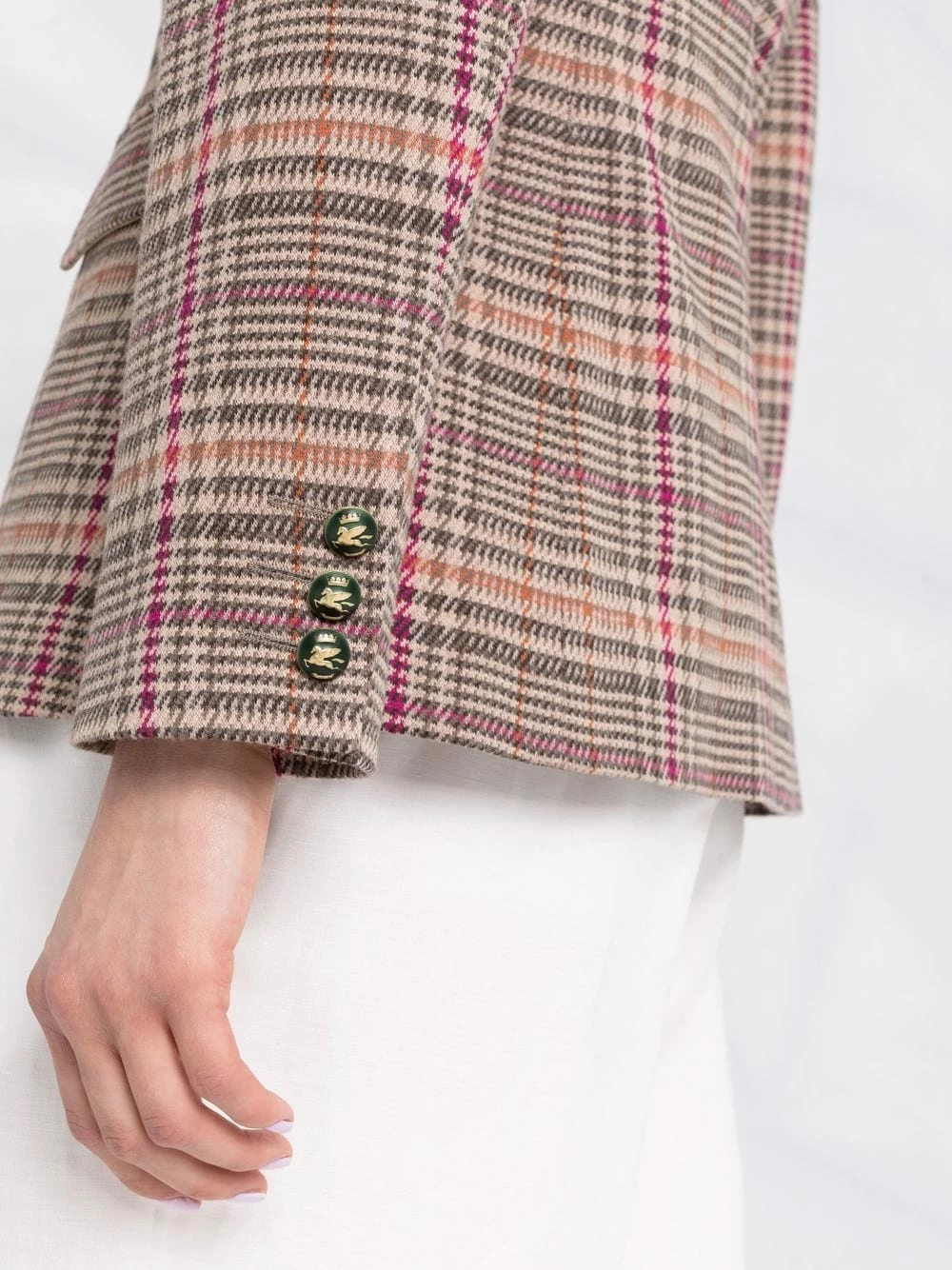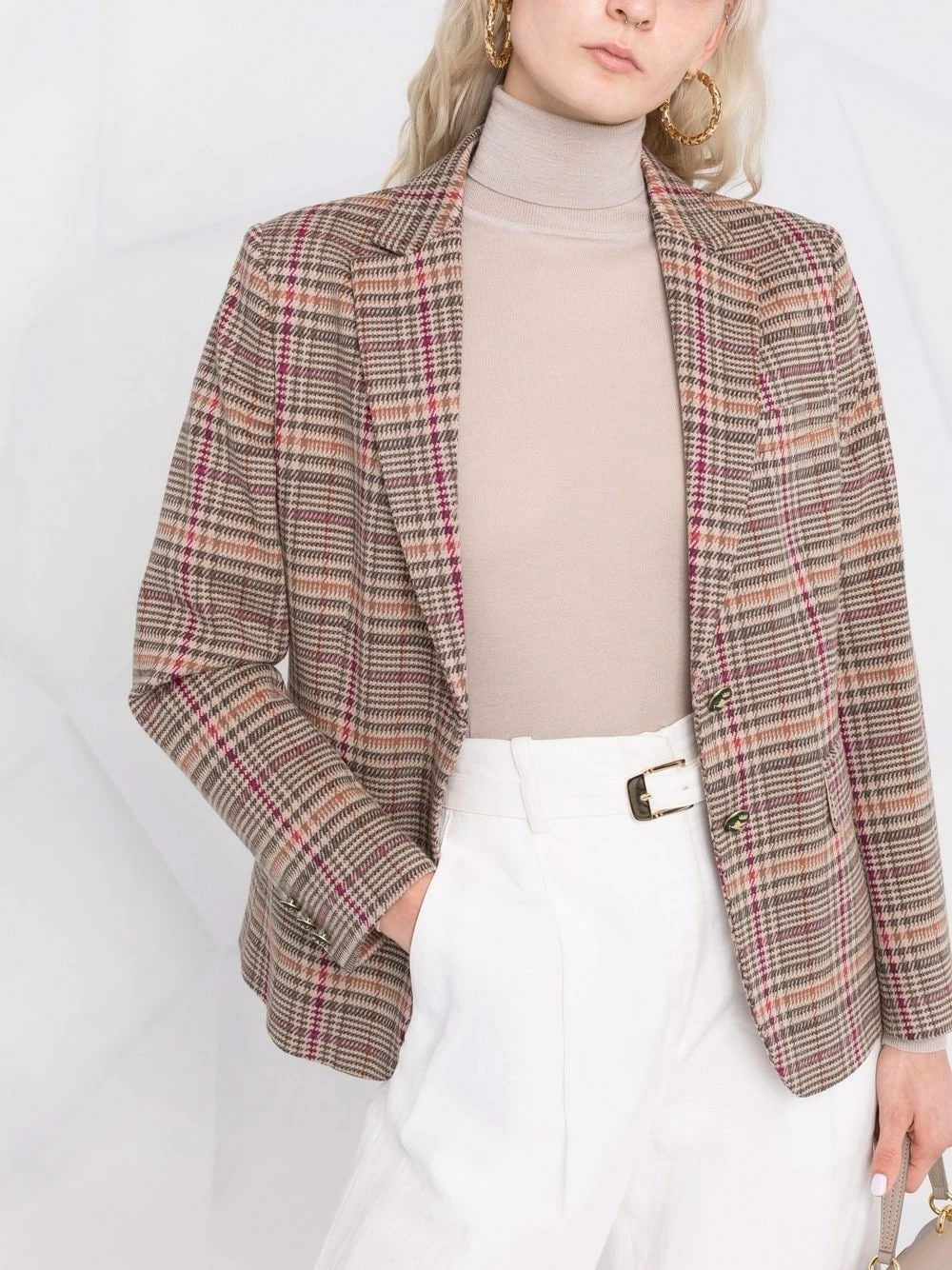 Carreaux, revers crantés, boutonnière sur le devant, manches longues, poche passepoilée sur la poitrine, pinces, deux poches à rabat sur le devant. Couleur : multicolore. Matière : laine.