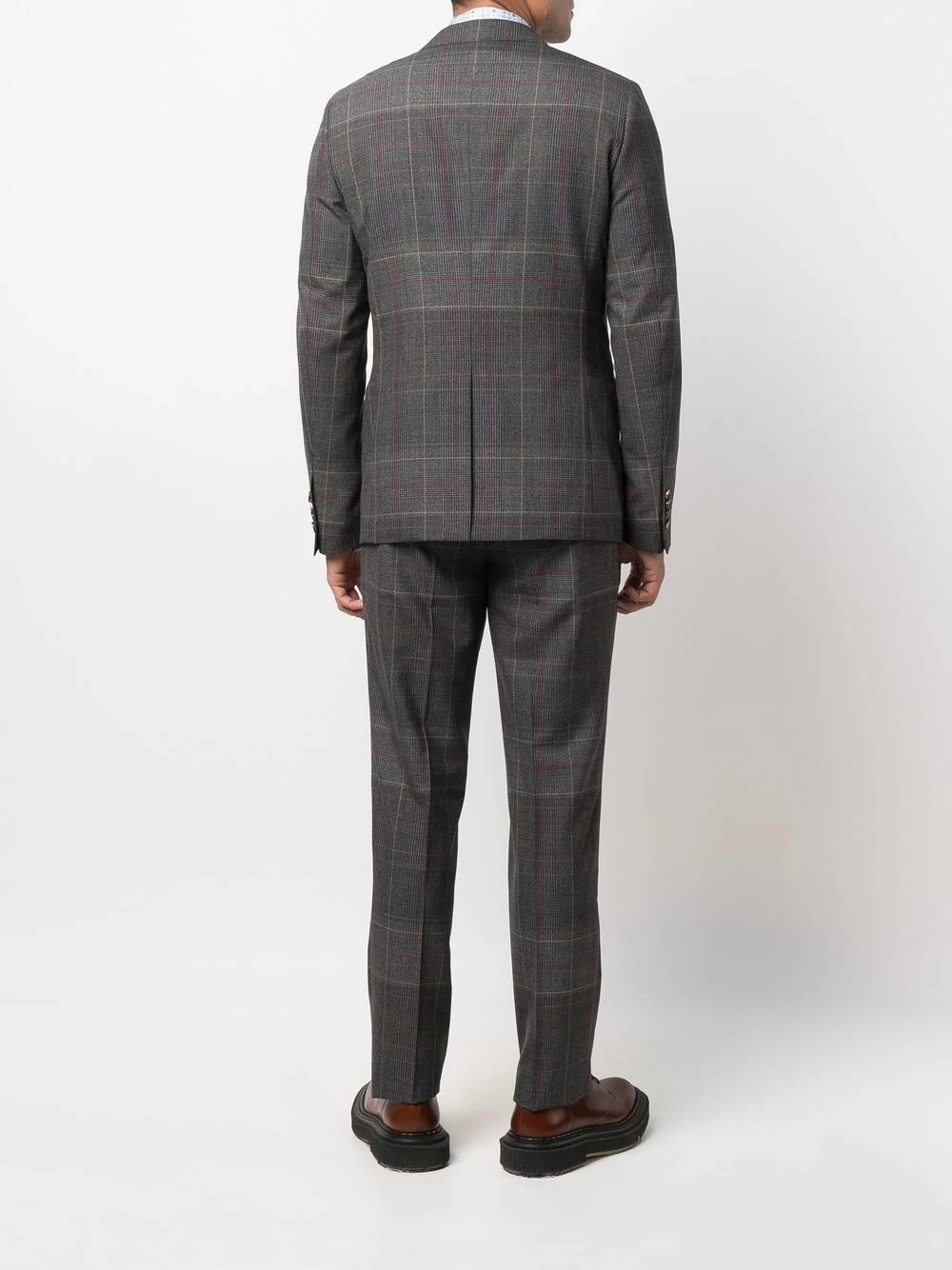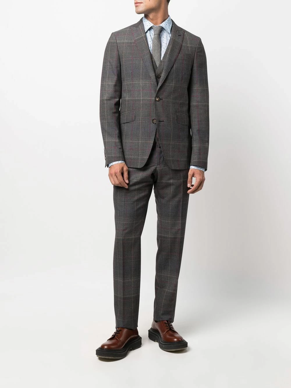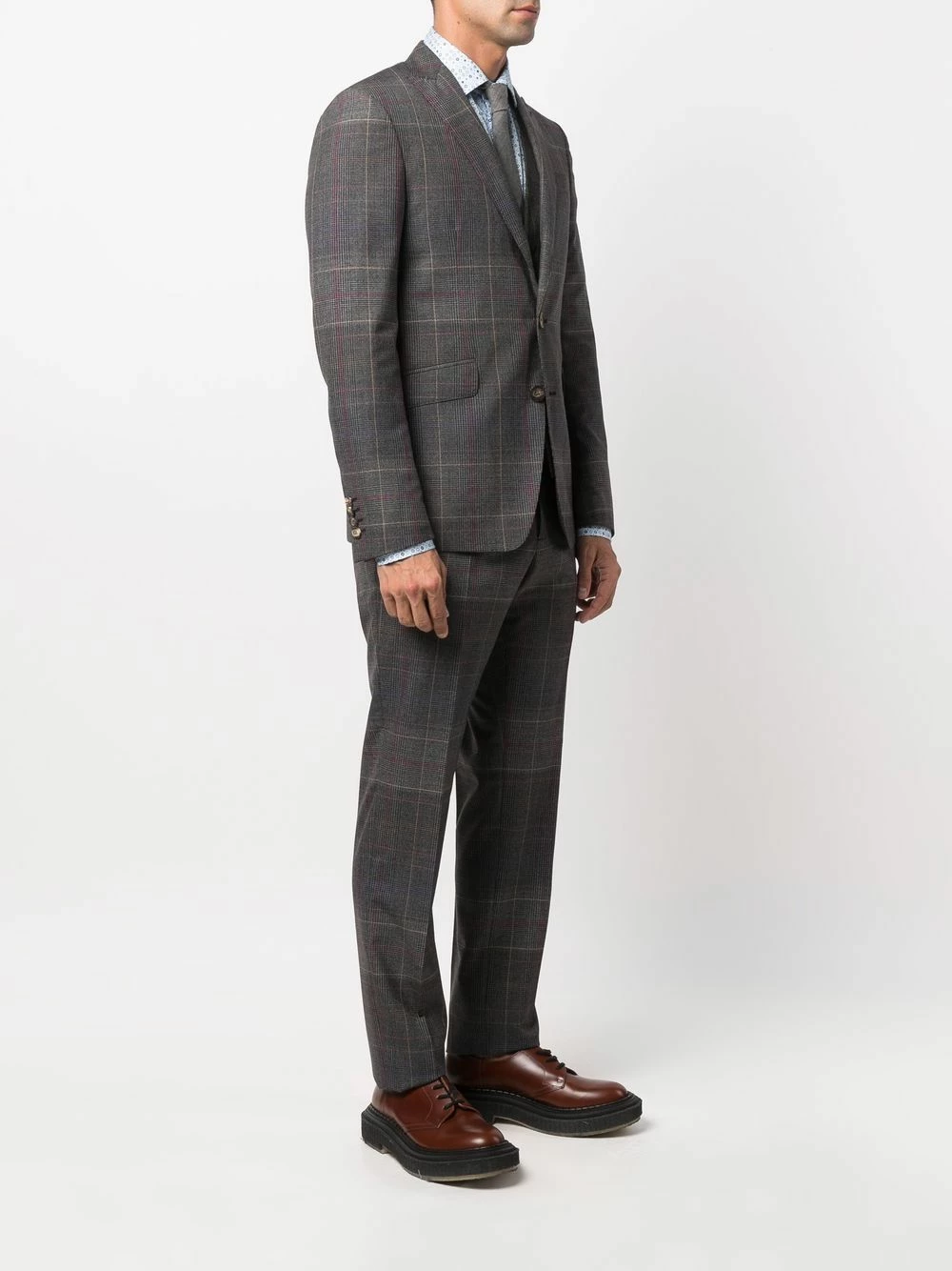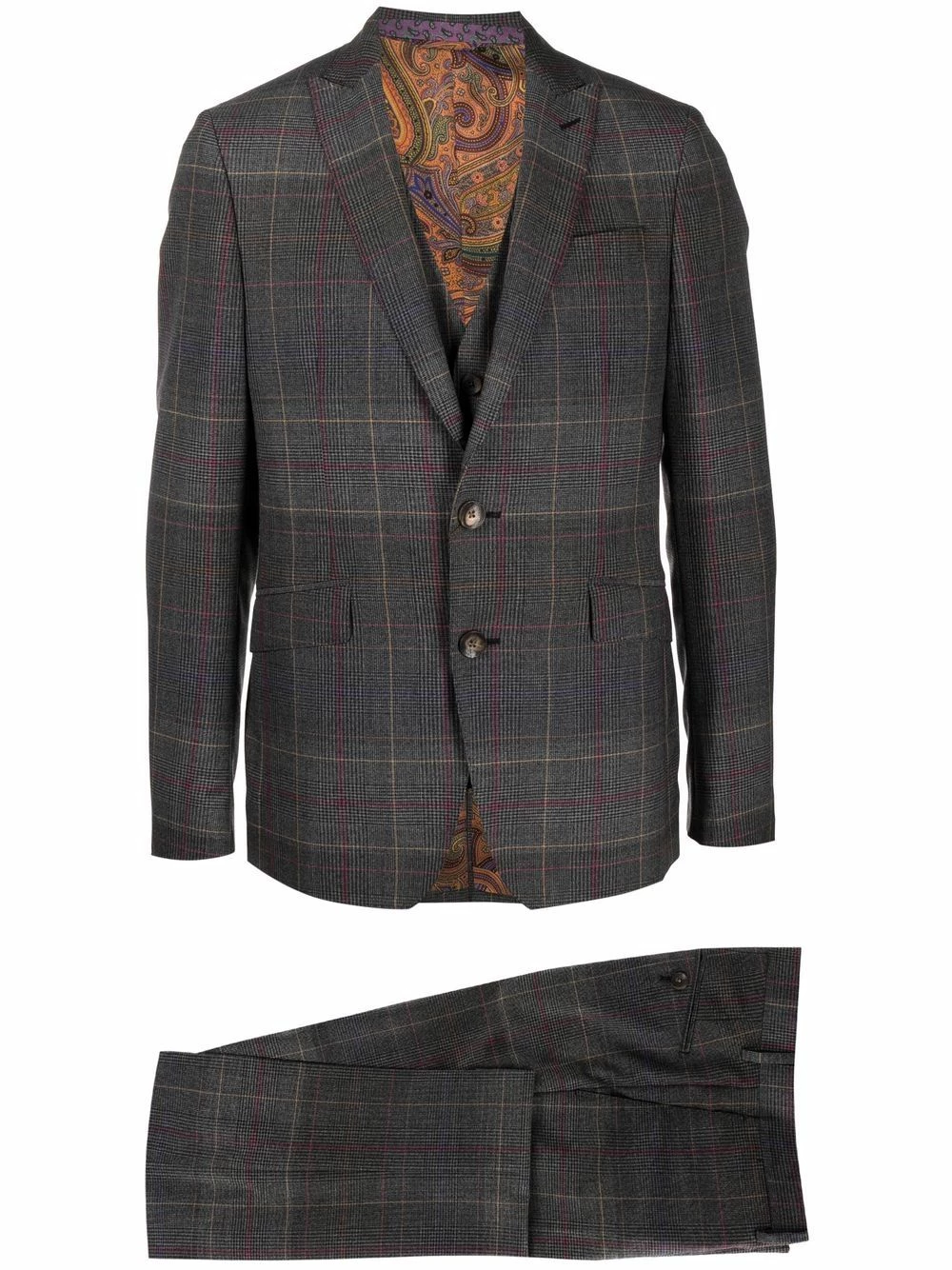 Poignets boutonnés, revers classiques, poche passepoilée sur la poitrine, boutonnière sur le devant, manches longues, motif cachemire, fermeture à zip et boutons sur le devant, poche intérieure, poche arrière fendue, coupe droite, fente arrière. Couleur : gris. Matière : laine.