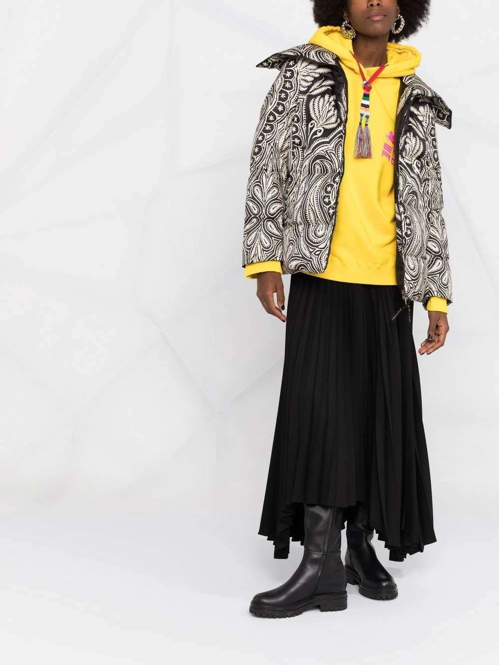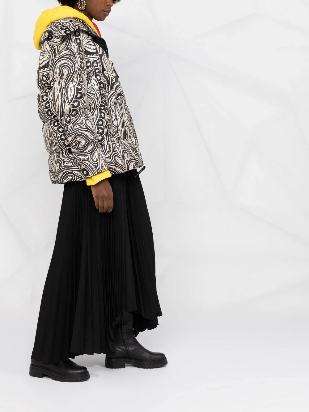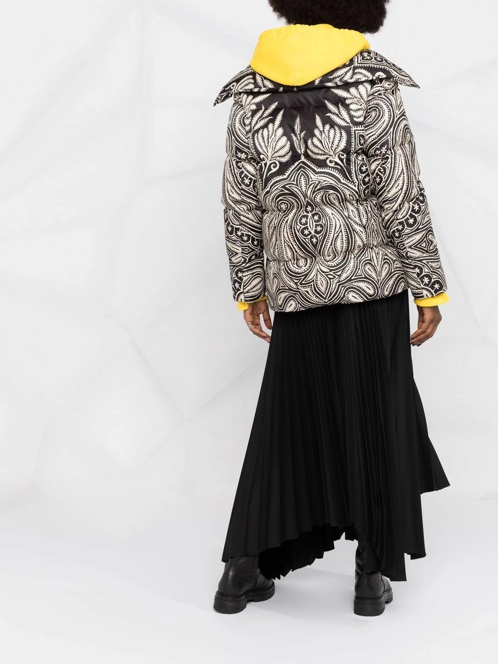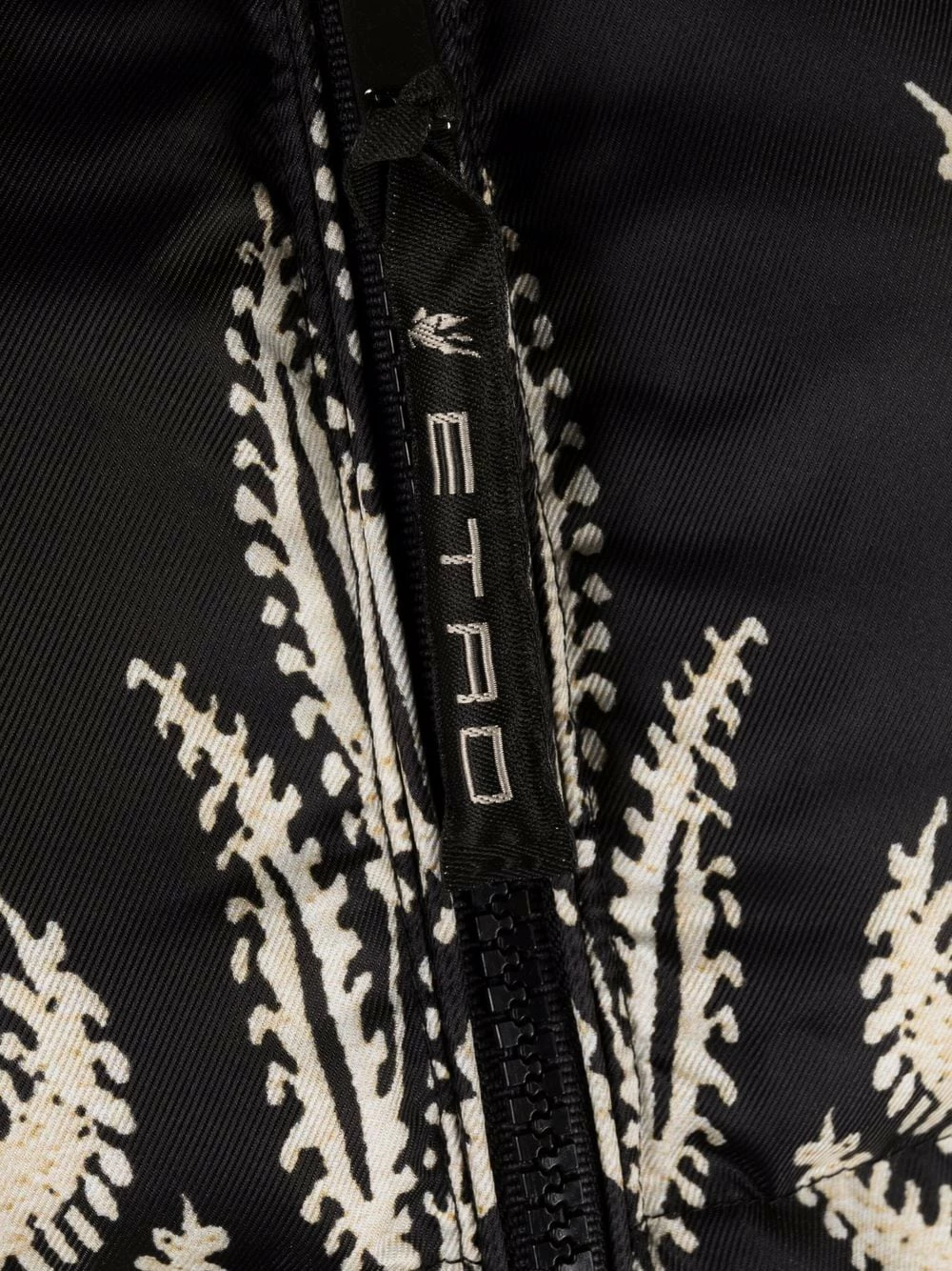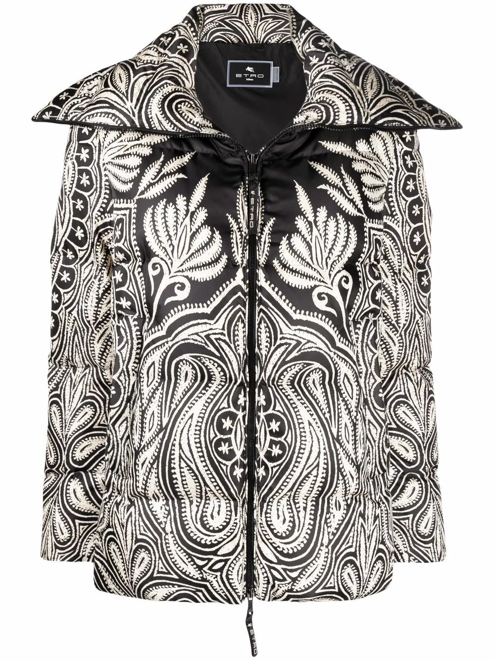 Modèle bicolore, jacquard à motifs, design matelassé, col italien, manches longues, fermeture zippée devant, deux poches latérales fendues. Matière : duvet.