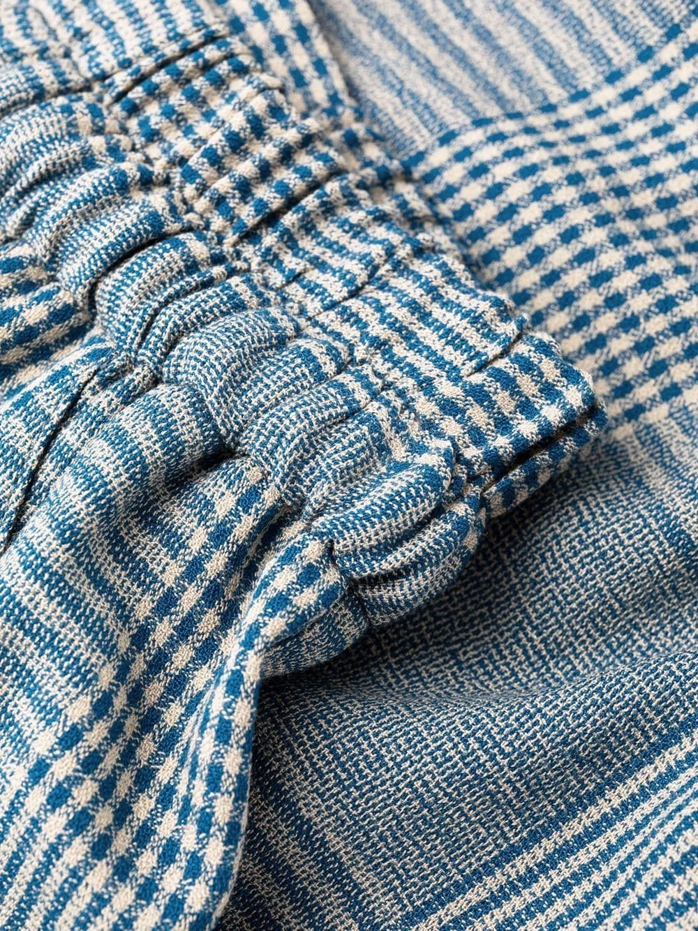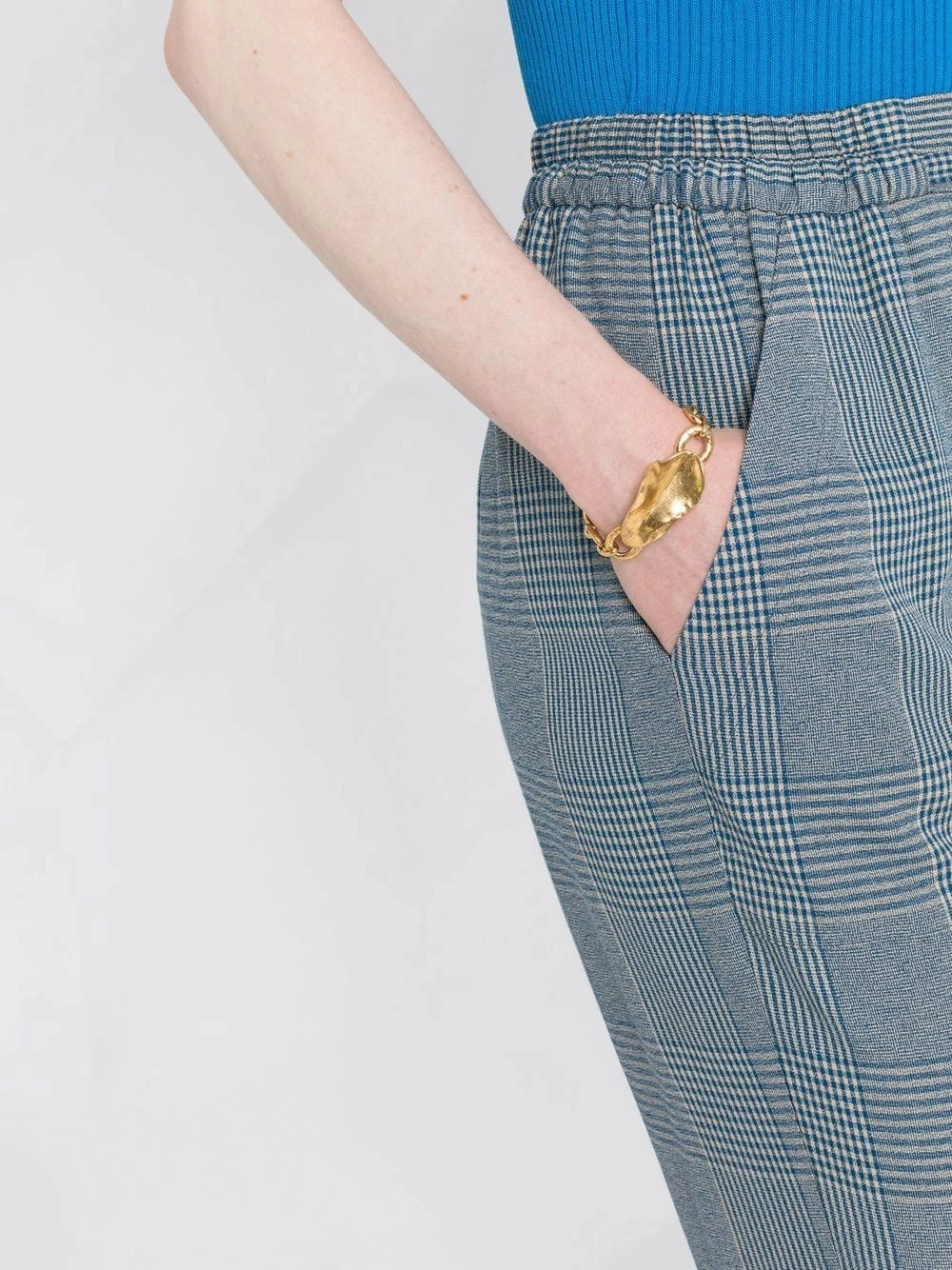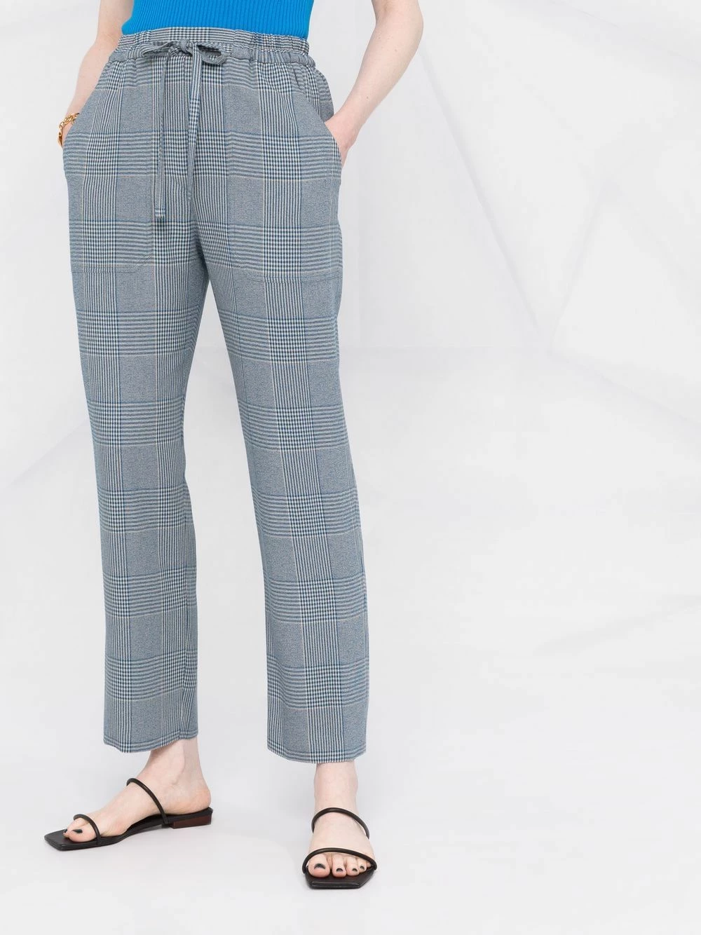 Taille haute, taille élastique à lien de resserrage, poches latérales fendues, coupe droite. Couleur : bleu.