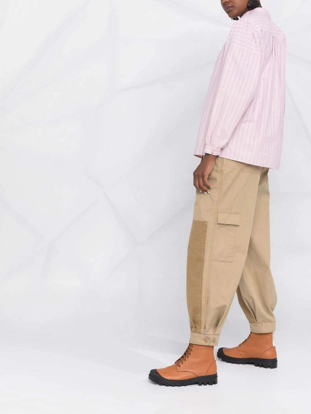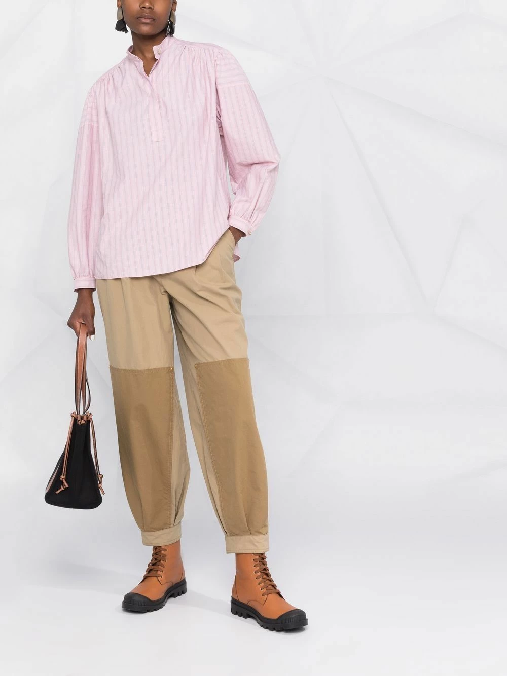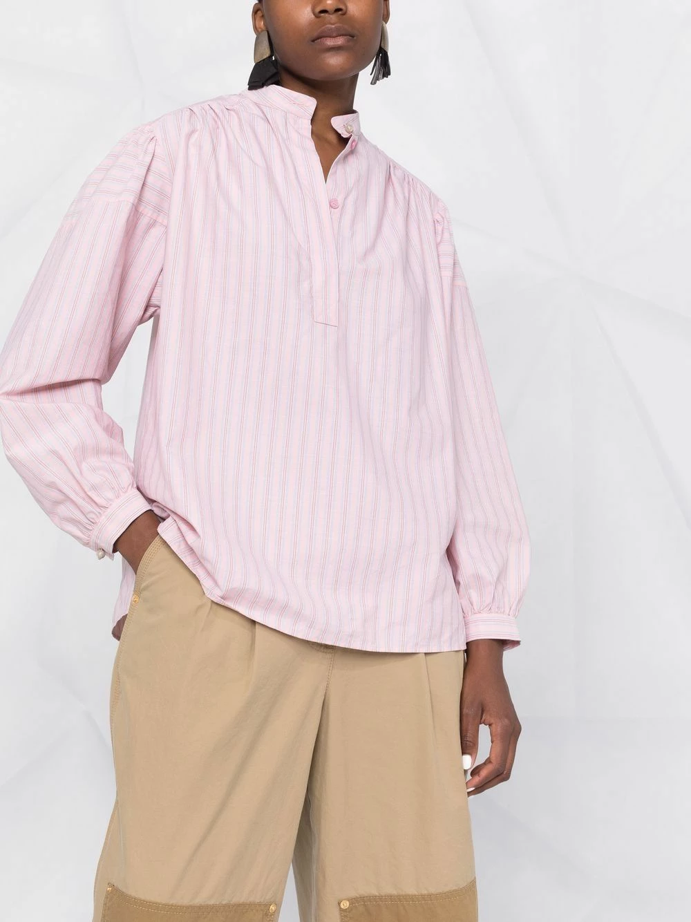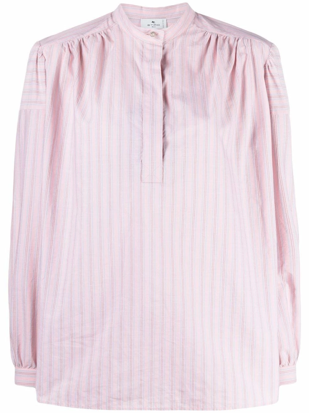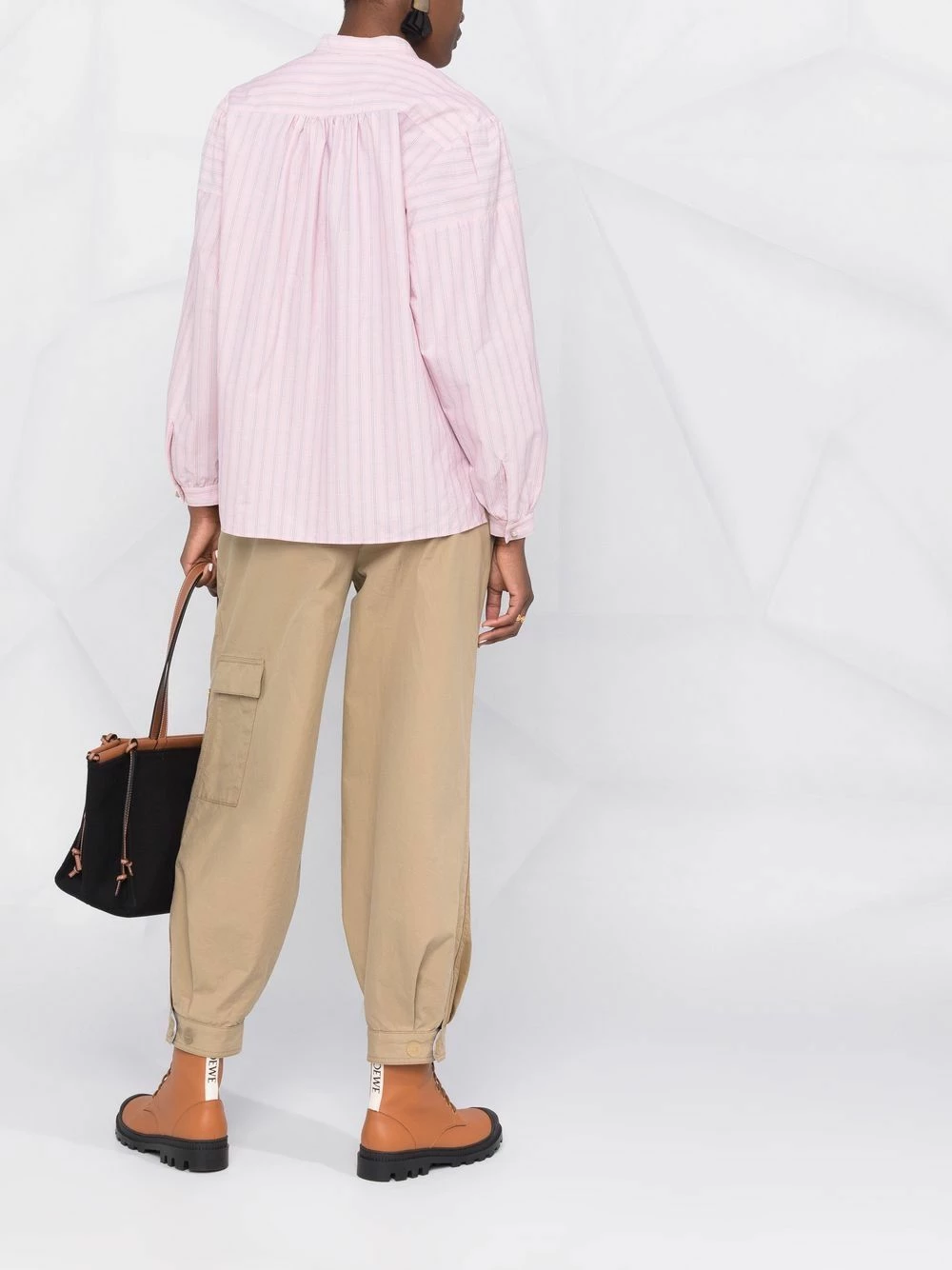 Détail de rayure latérale, design sans col, boutonnière sur le devant, manches longues, ourlet incurvé. Matière : coton.