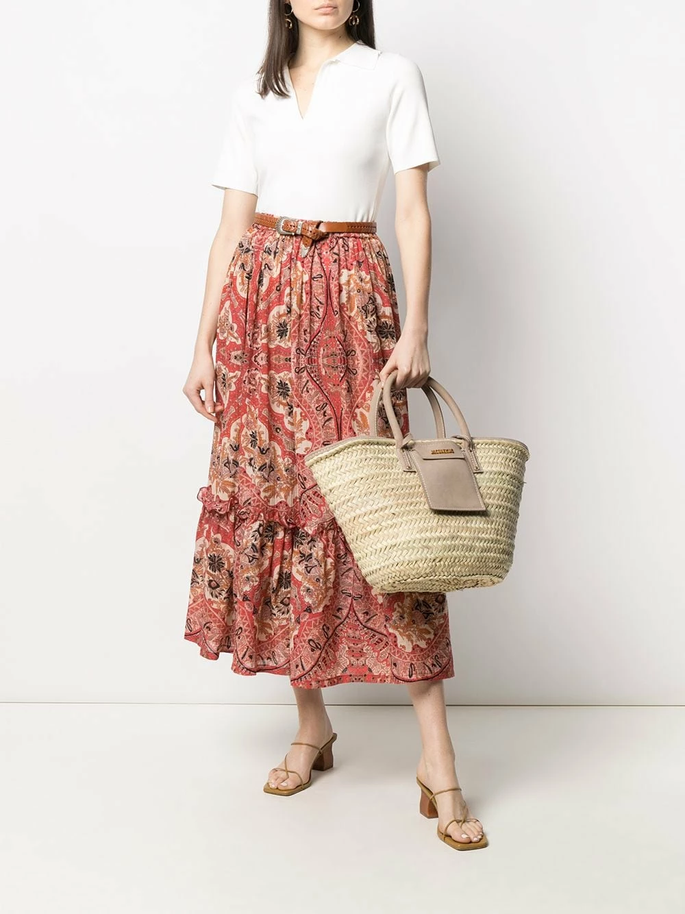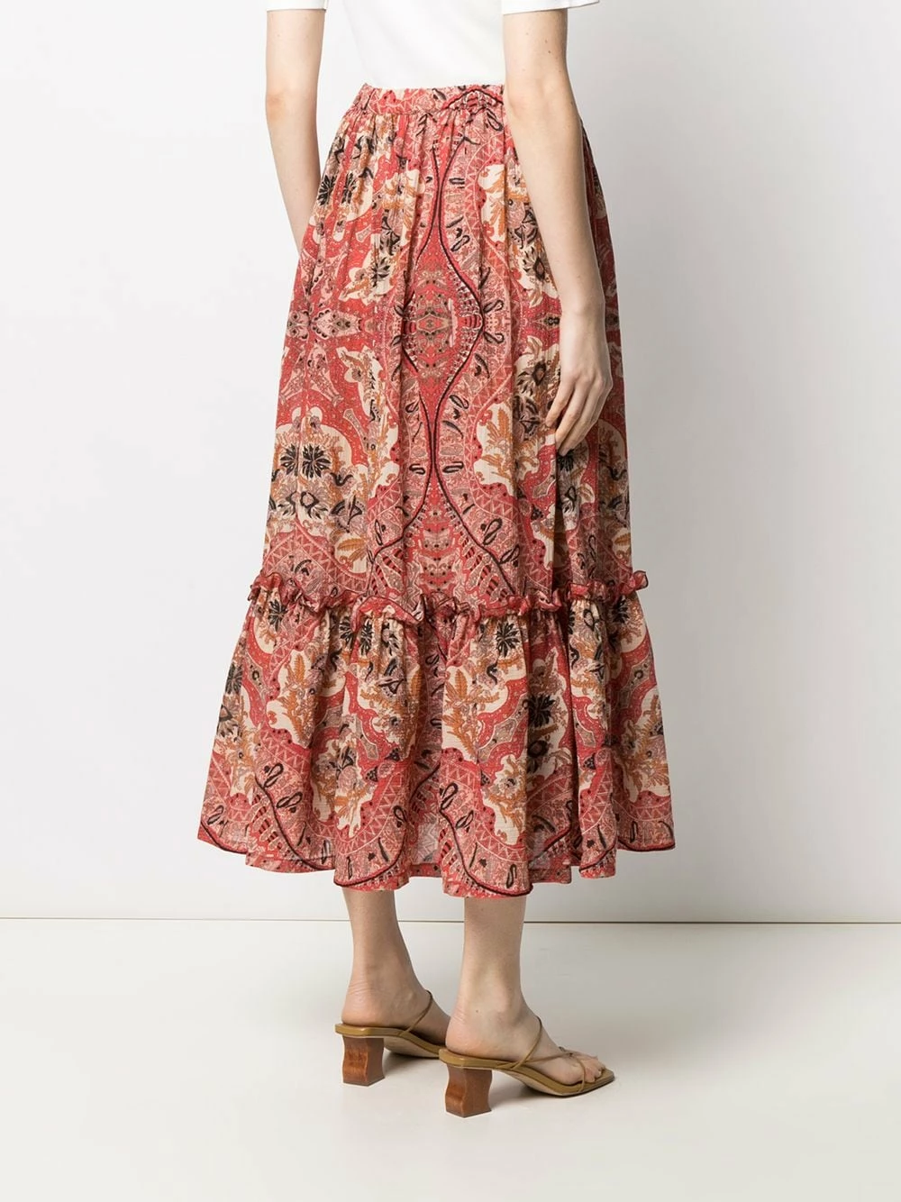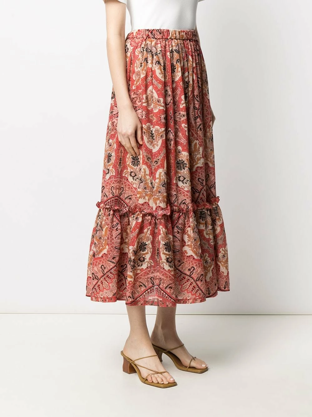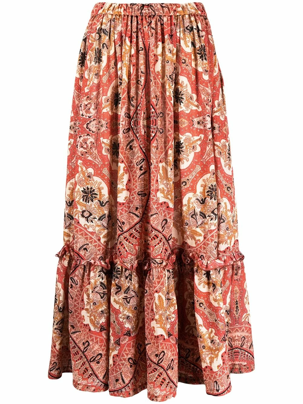 Design de volants superposés, motif cachemire, ceinture élastique, coupe mi-longue. Couleur : Rouge. Matière : coton.
