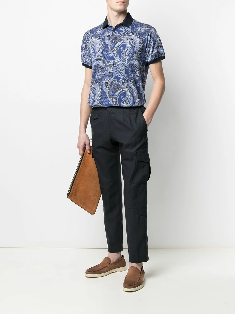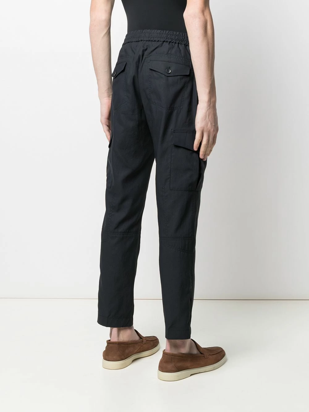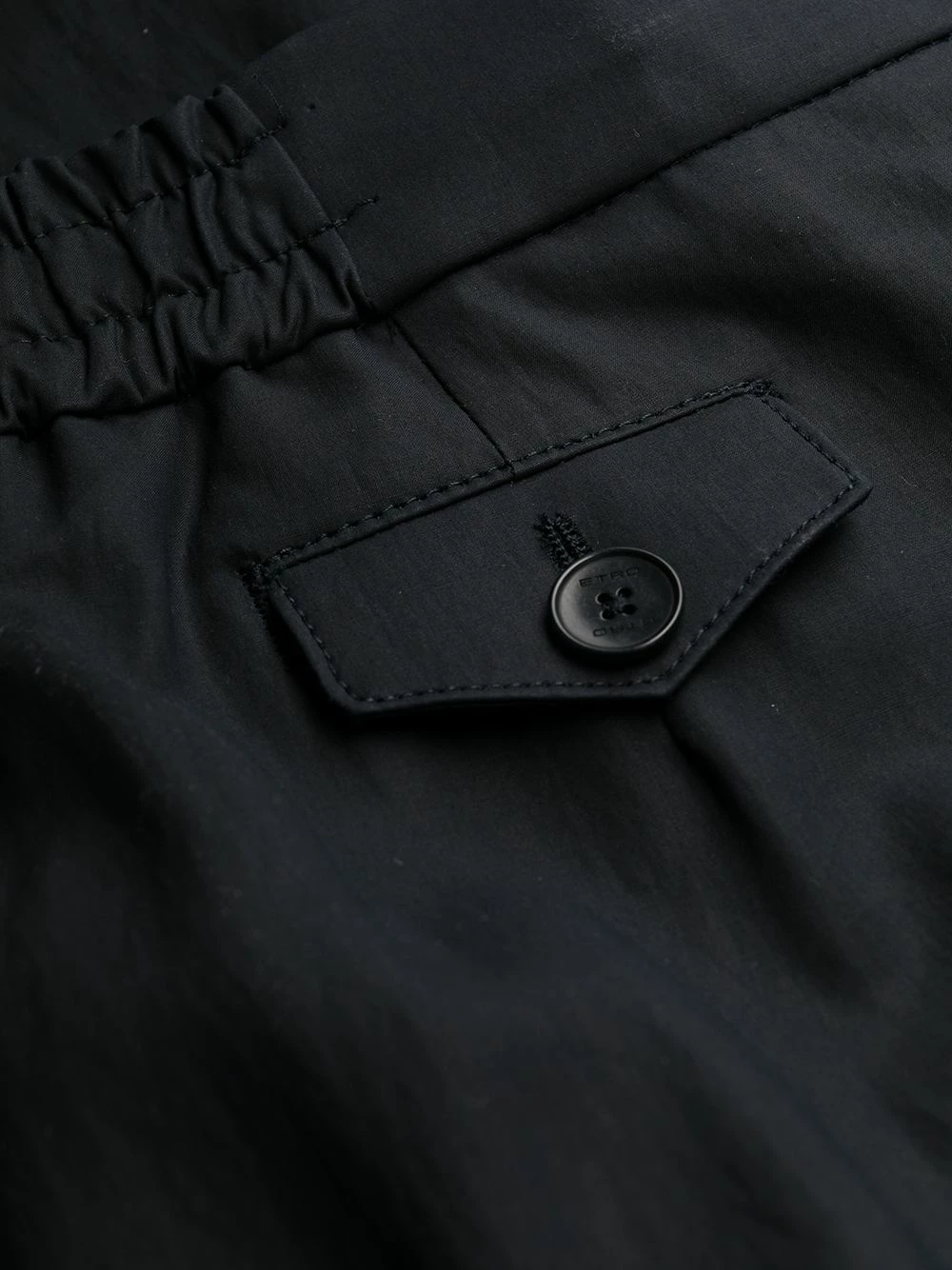 Ceinture élastique, deux poches latérales passepoilées, poches arrière à rabat, coupe droite. Matière : coton.