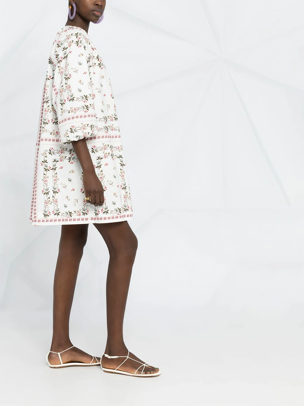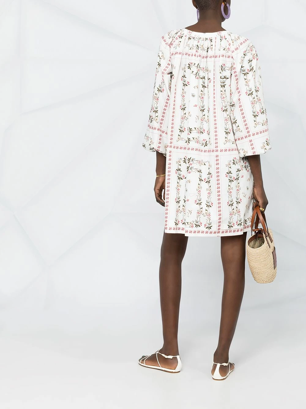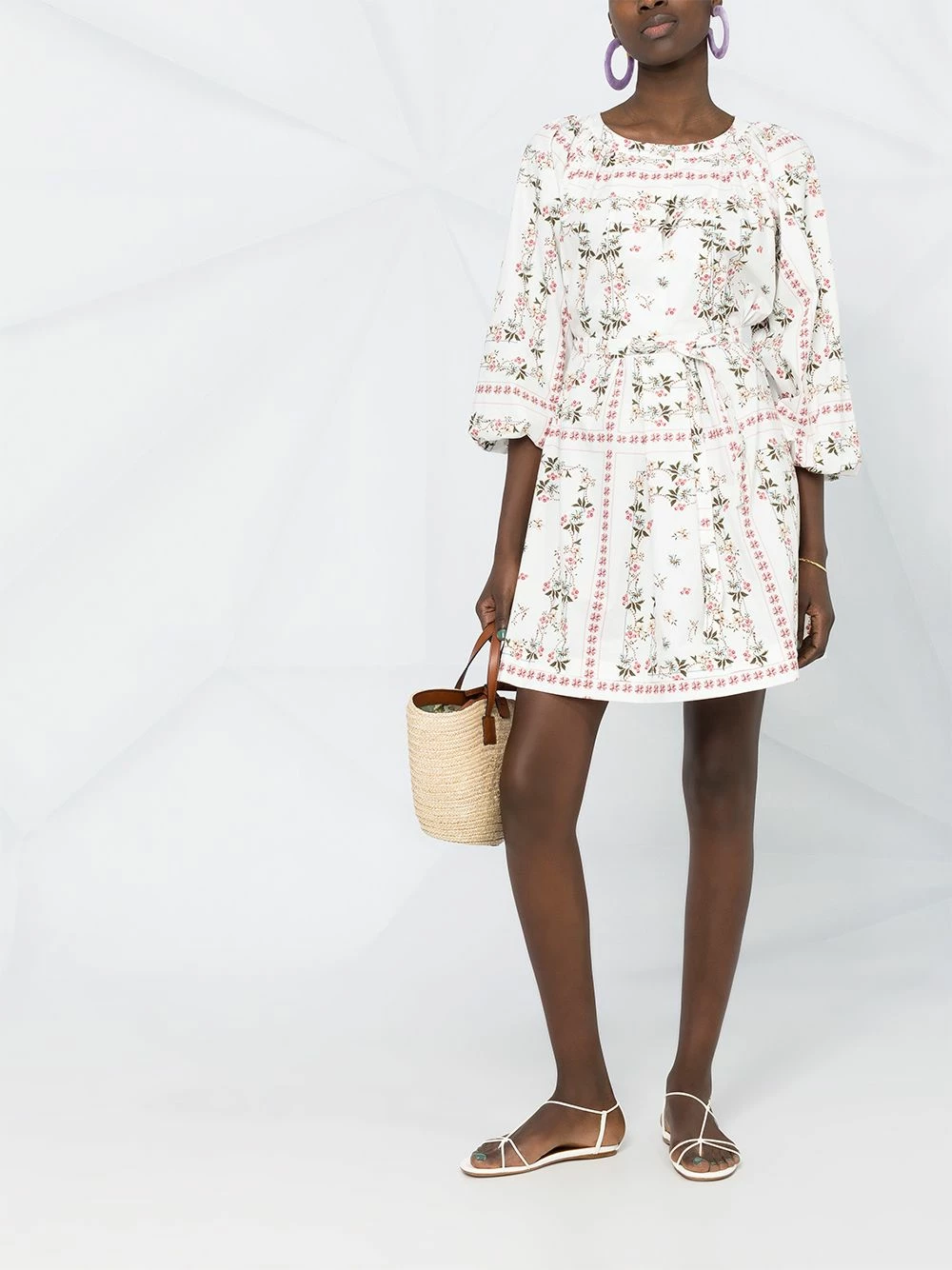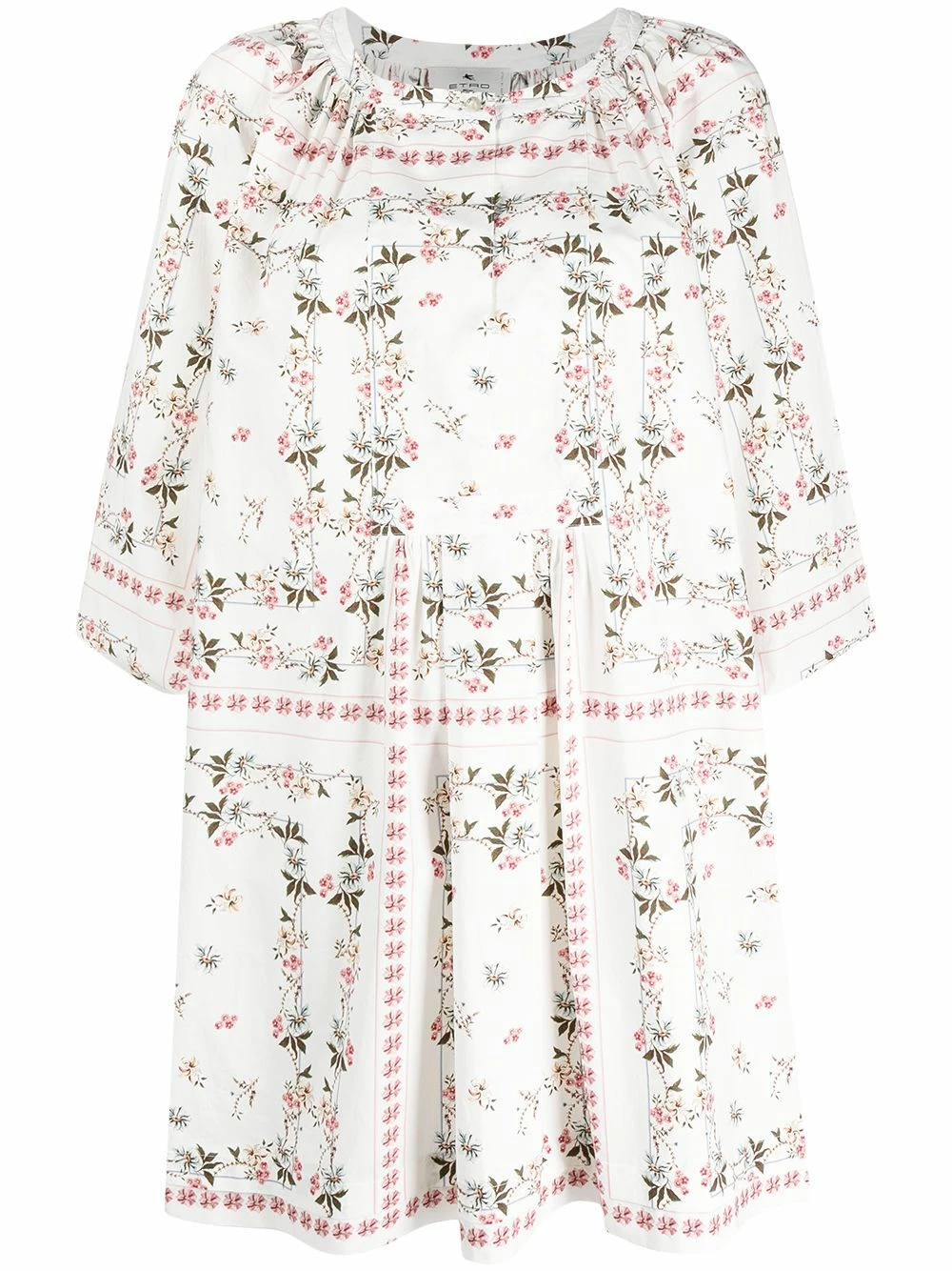 Motif de fleurs, encolure ronde, coupe évasée, ourlet droit. Couleur : blanc.