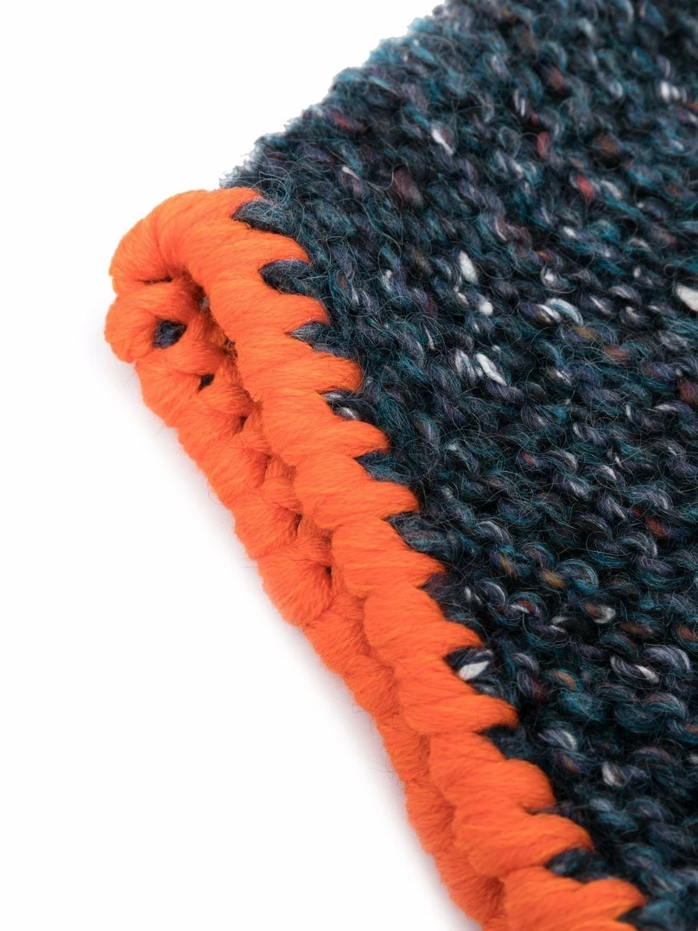 Construction en crochet, bordure contrastante, bords frangés.