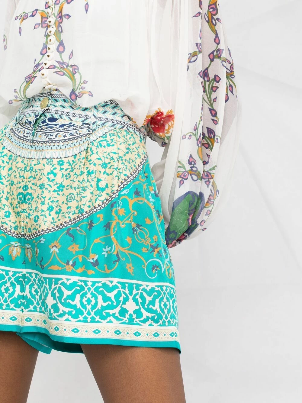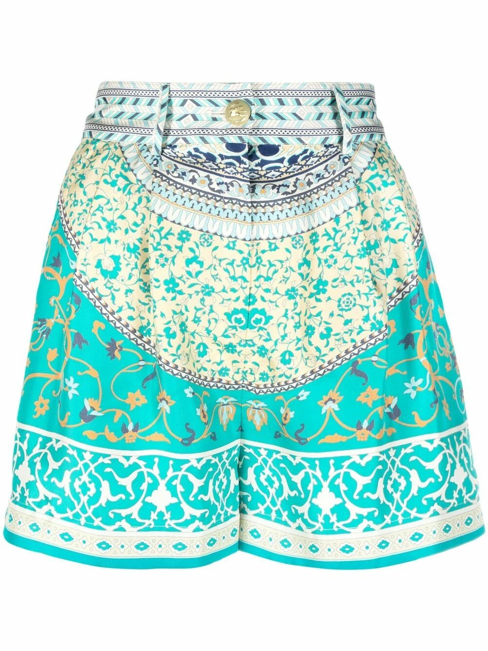 Motif cachemire, boutons dorés à détails embossés, taille haute, passants de ceinture, fermeture boutonnée. Matière : soie.