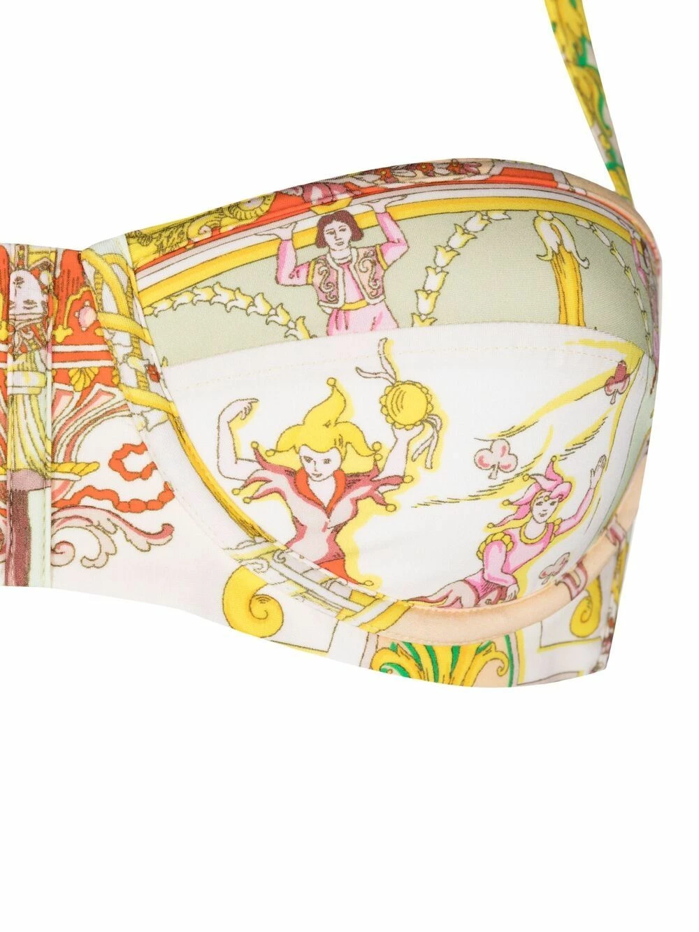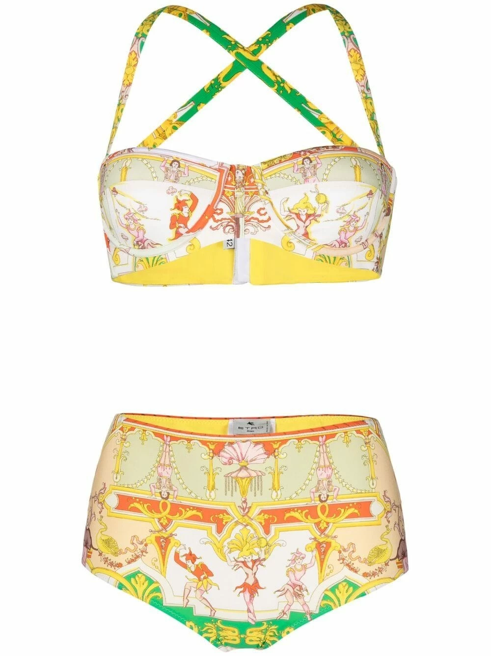 Détail de brides croisées, taille haute, construction stretch. Couleur : jaune. Veillez à essayer les maillot de bain par-dessus vos propres sous-vêtements.
