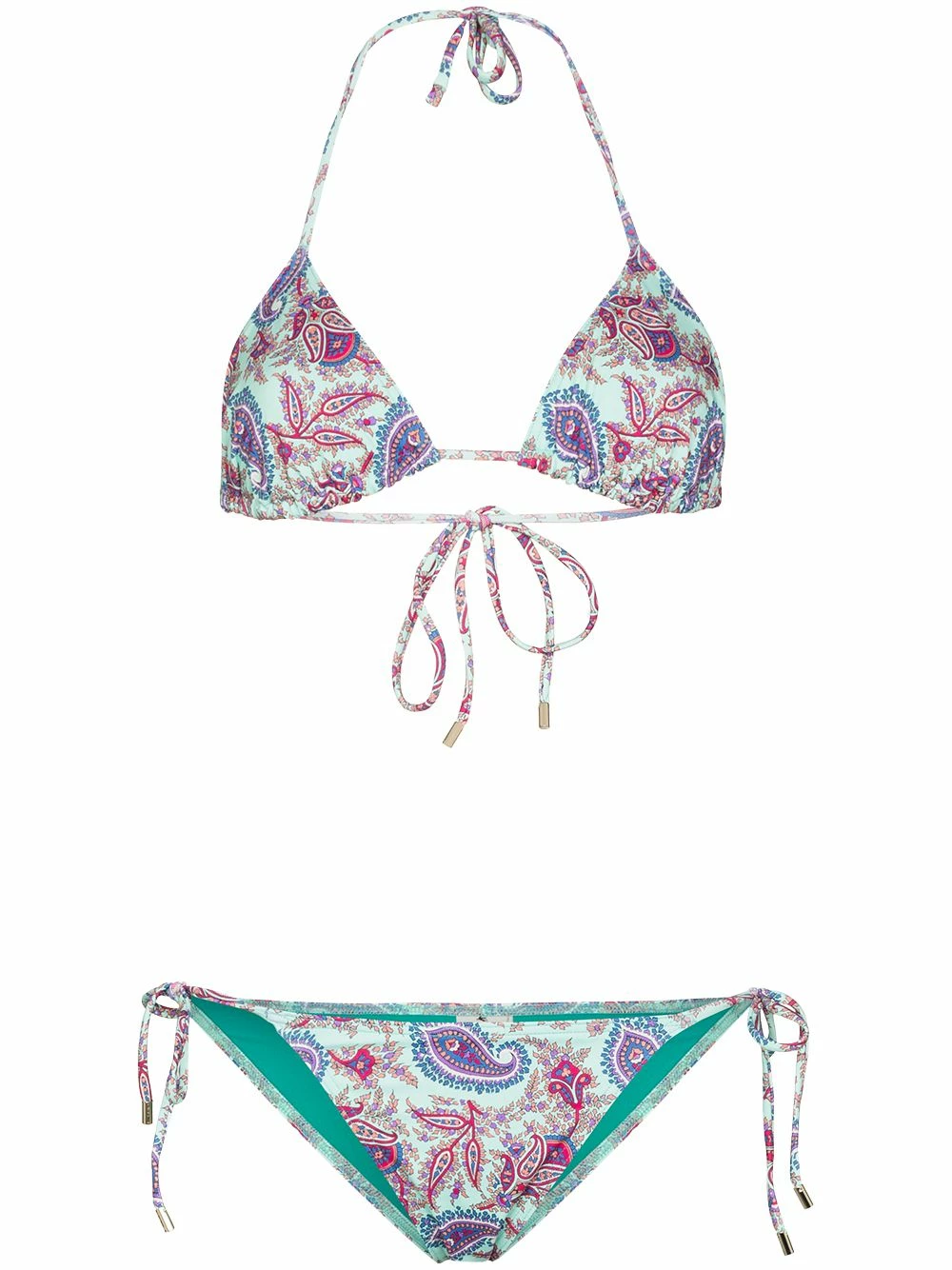 Motif cachemire, bonnets triangles, fermeture dos-nu à nouer, fermeture nouée au dos, bas à fermeture à nouer. Veillez à essayer les maillot de bain par-dessus vos propres sous-vêtements.