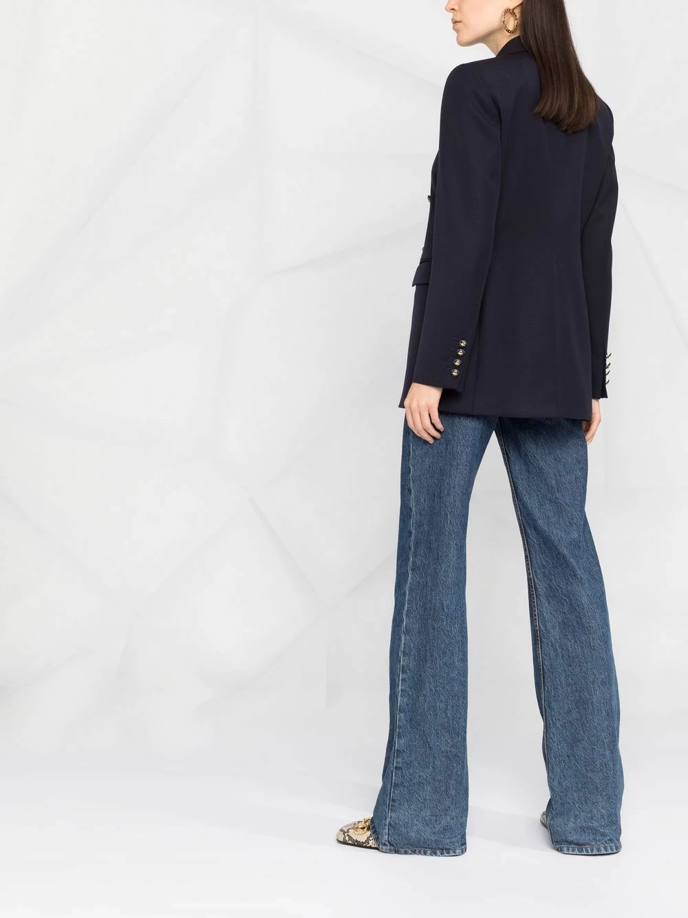 Larges revers crantés, poche passepoilée sur la poitrine, boutonnière croisée, poches devant à rabat, manches longues, ourlet droit. Couleur : bleu.