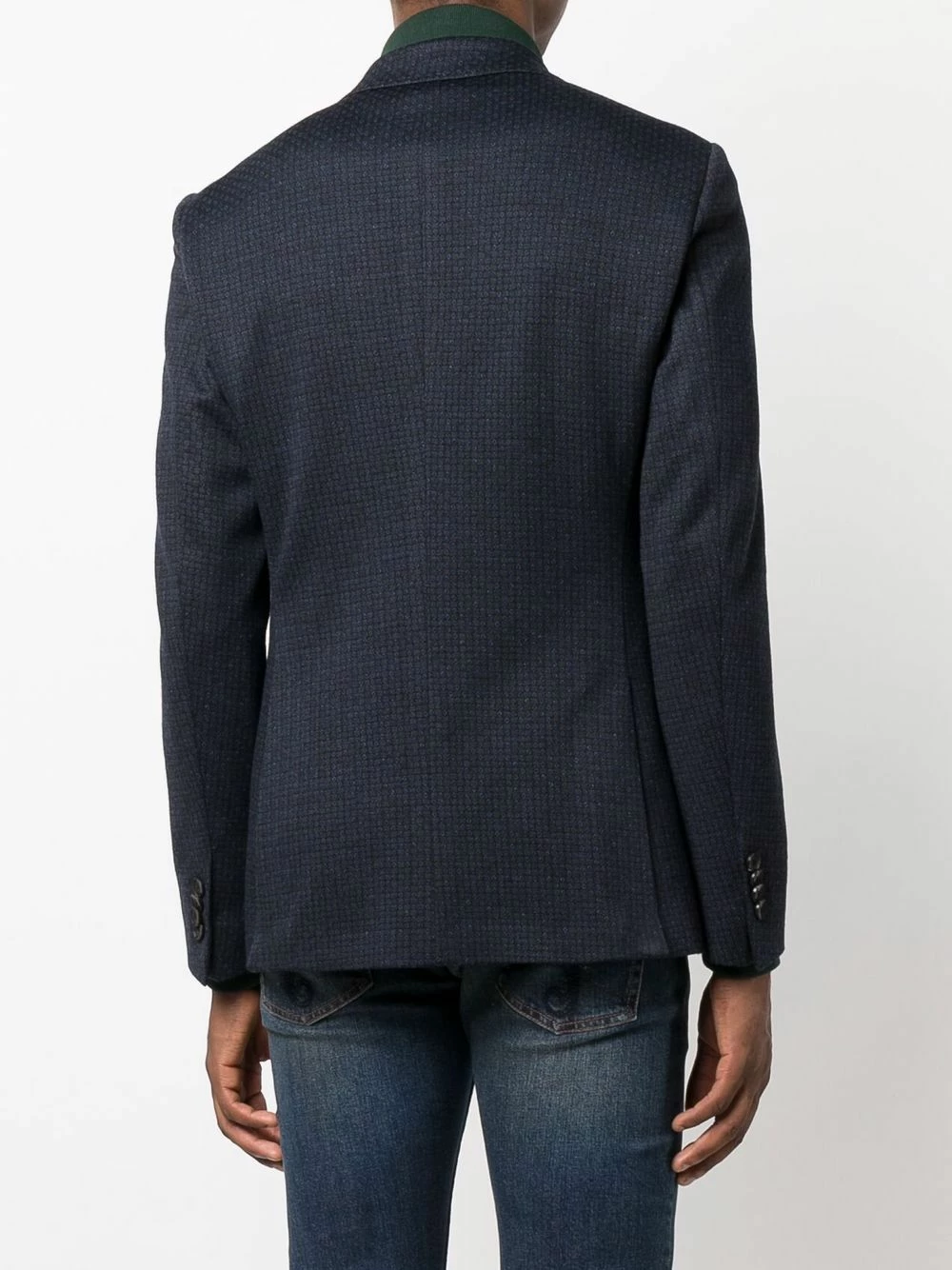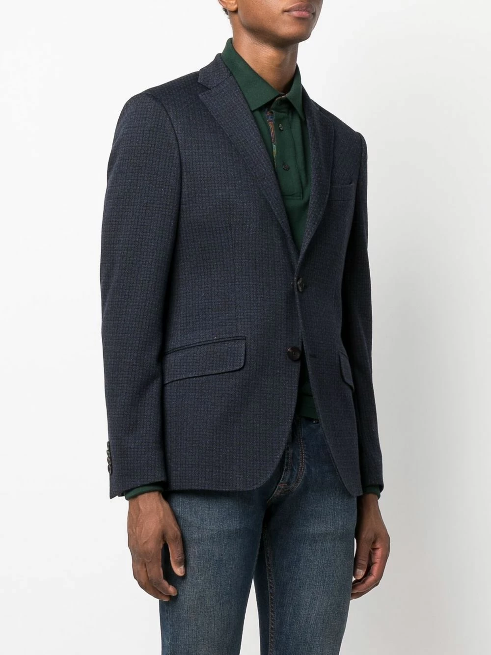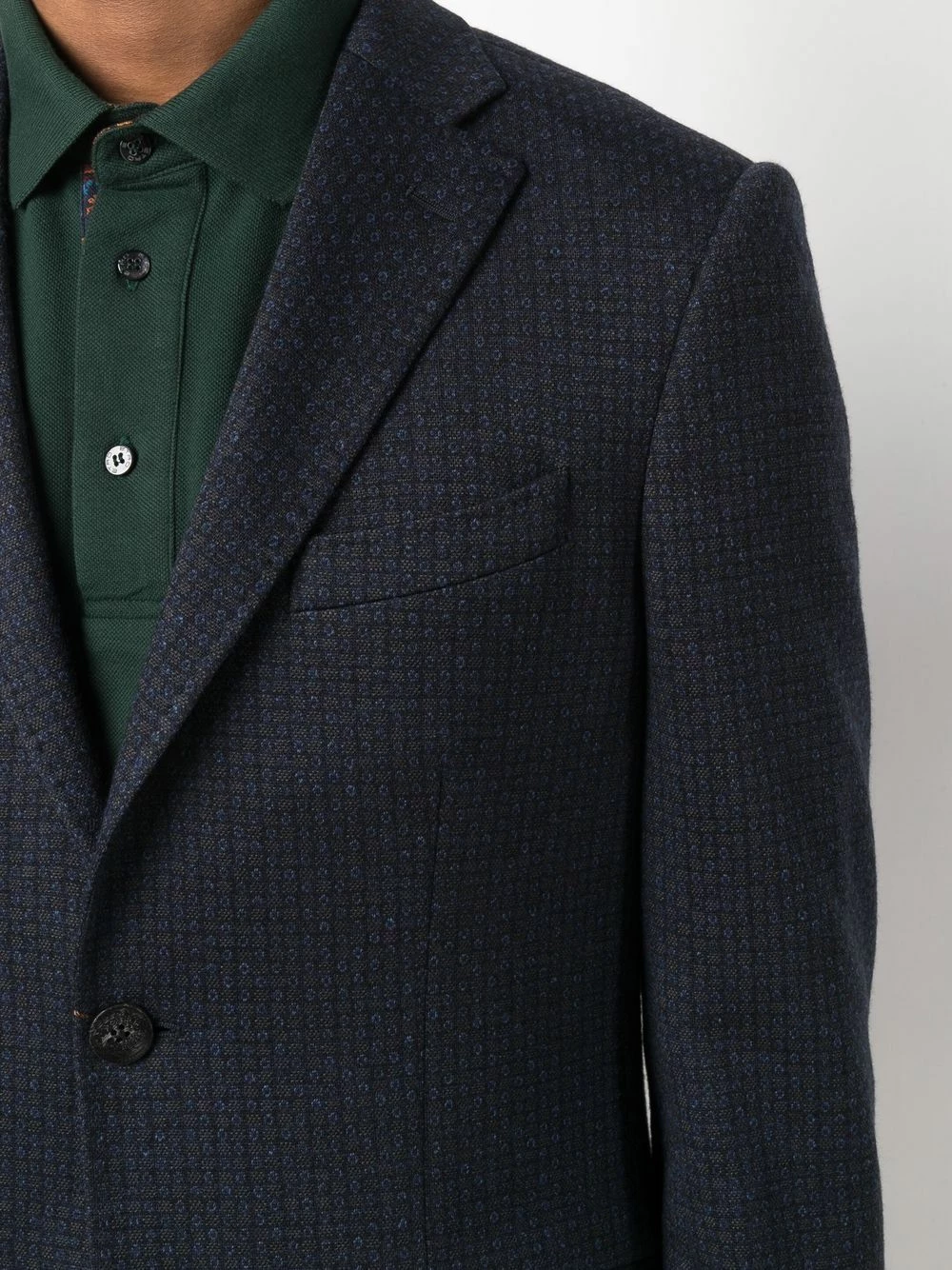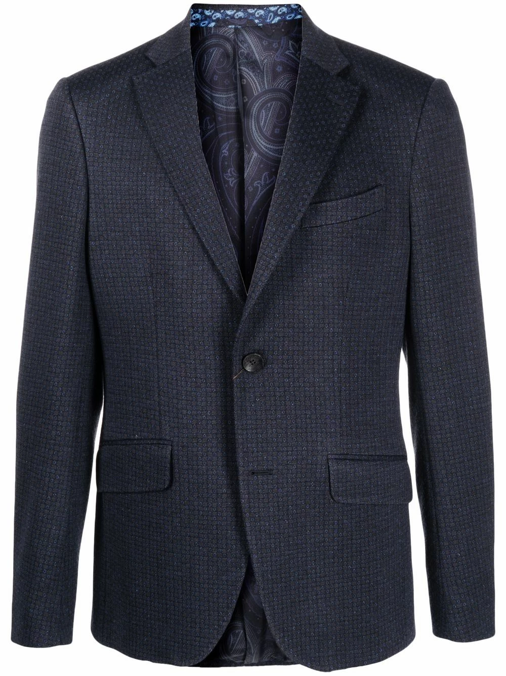 Revers crantés, doublure à fleurs, boutonnière sur le devant, poches devant à rabat, manches longues. Couleur : bleu.