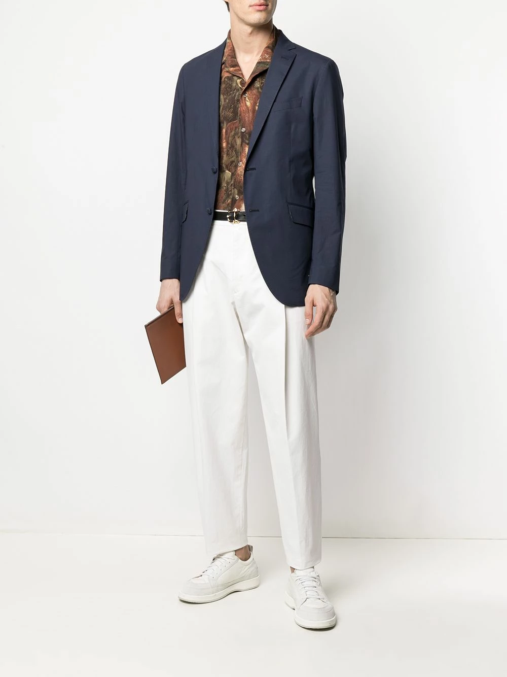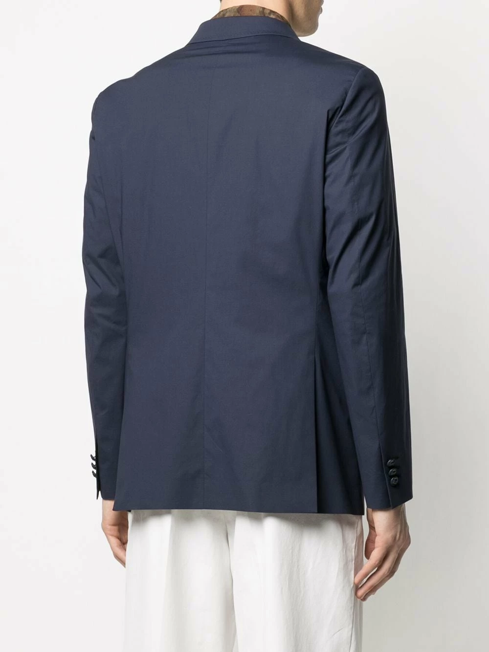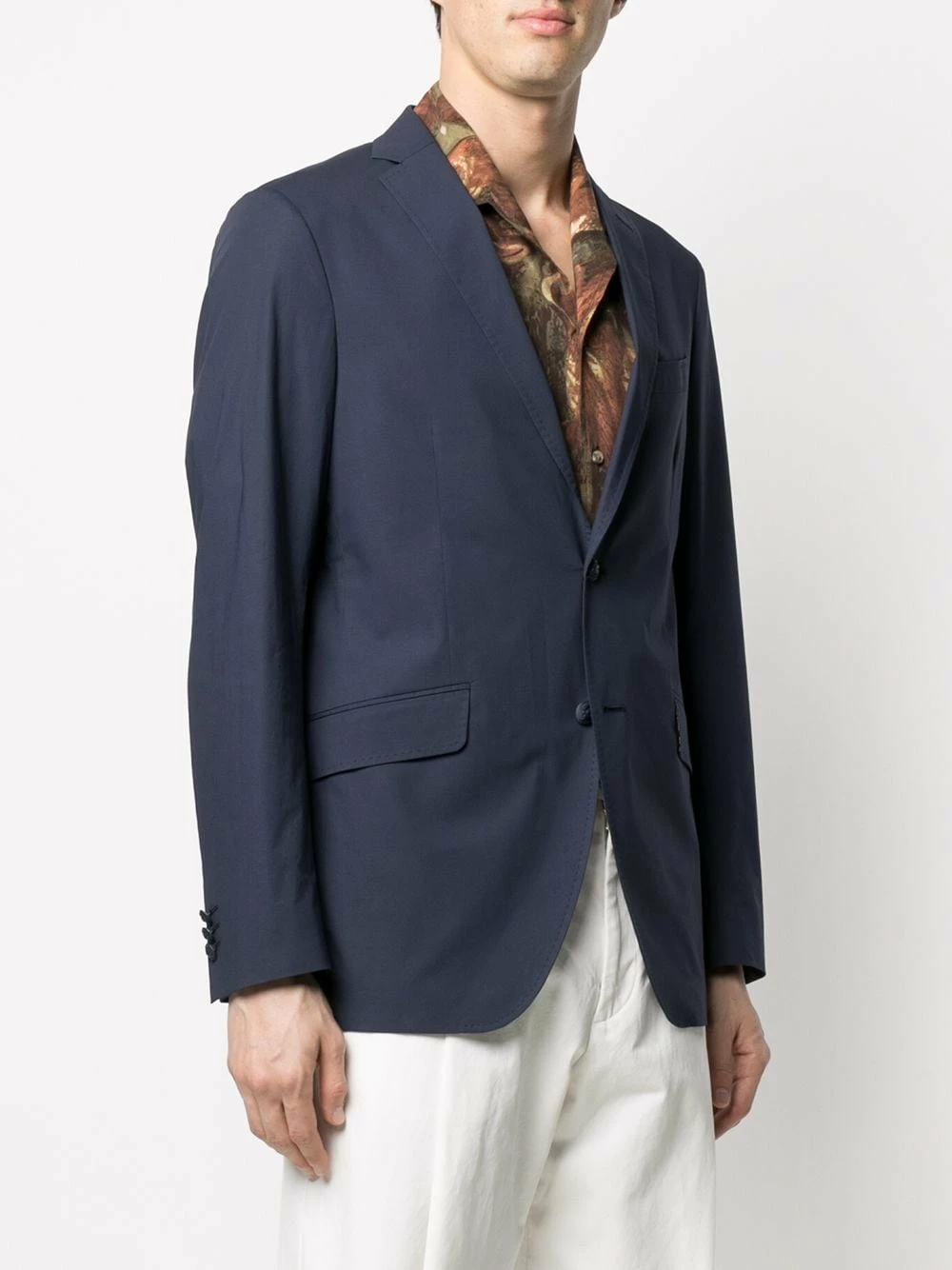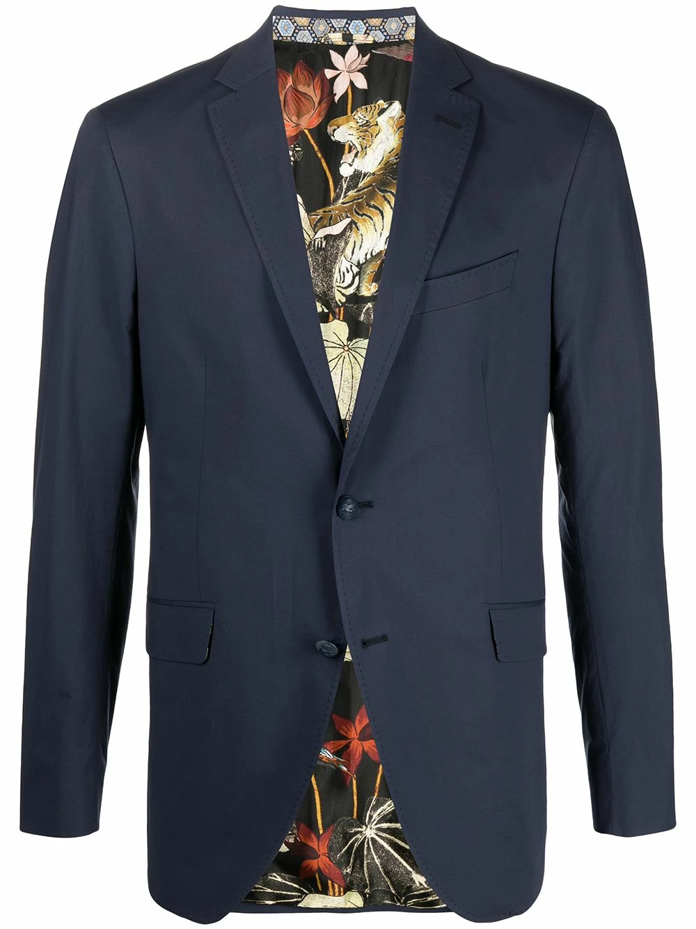 Coupe ajustée, revers classiques, fermeture boutonnée, manches longues, poche passepoilée sur la poitrine, deux poches latérales à rabat.