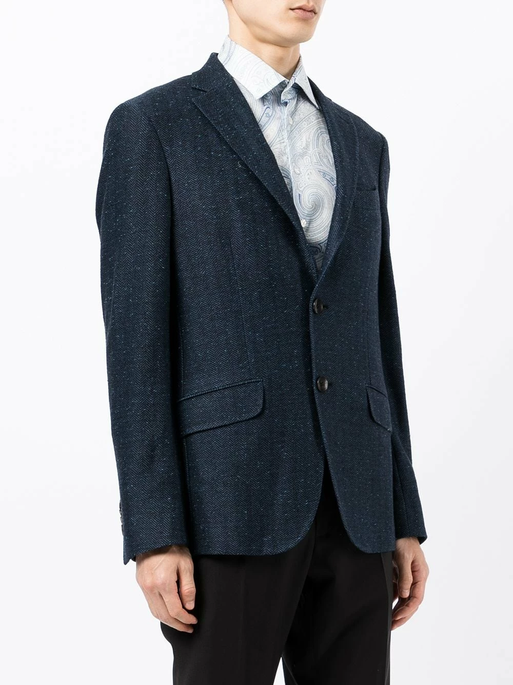 Revers classiques, boutonnière sur le devant, manches longues, poche passepoilée sur la poitrine, deux poches à rabat sur le devant. Couleur : bleu. Matière : lin.