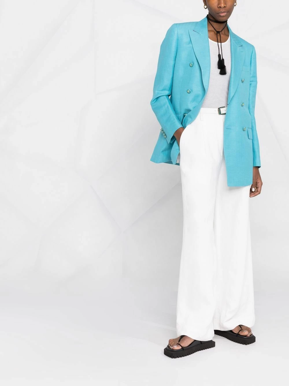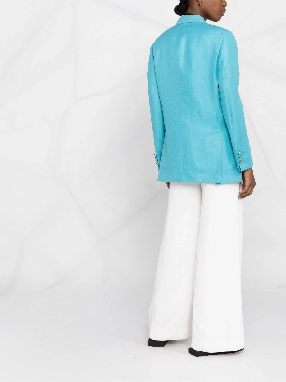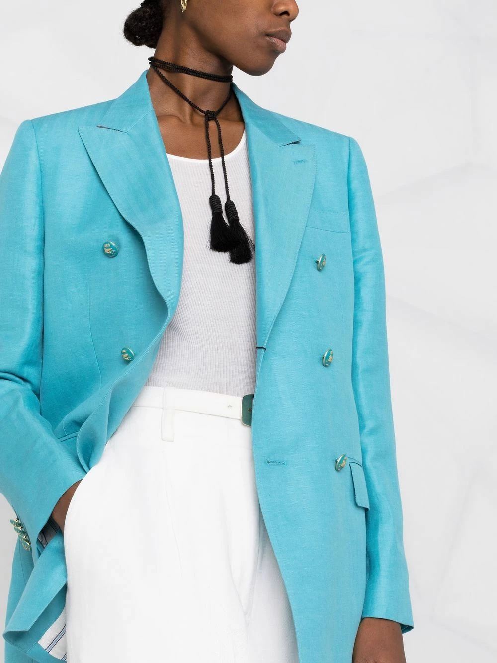 Revers pointus, manches longues, boutonnière sur le devant, poche passepoilée sur la poitrine, pinces, deux poches à rabat sur le devant. Couleur : bleu.