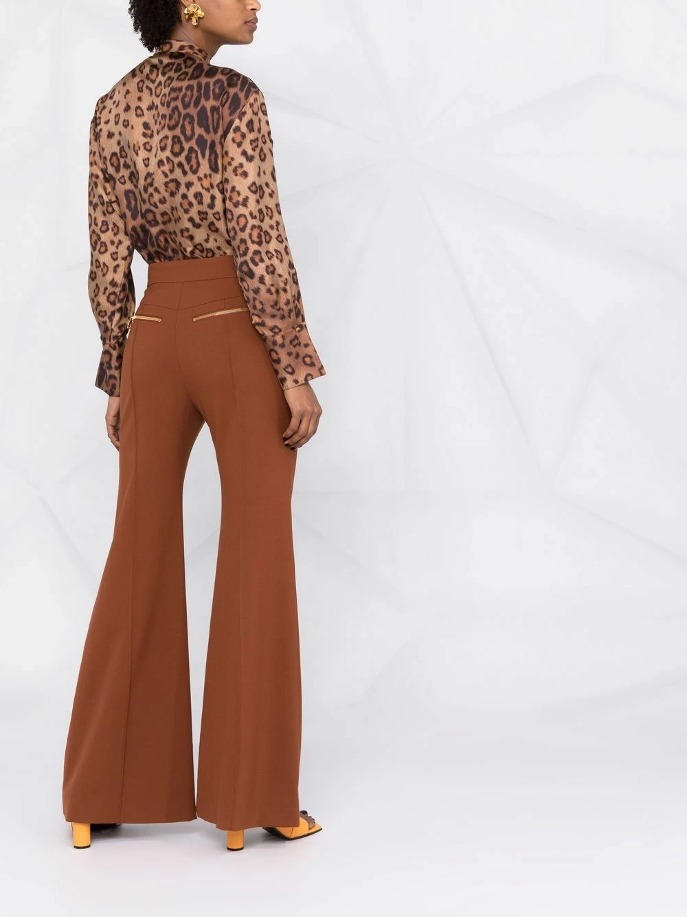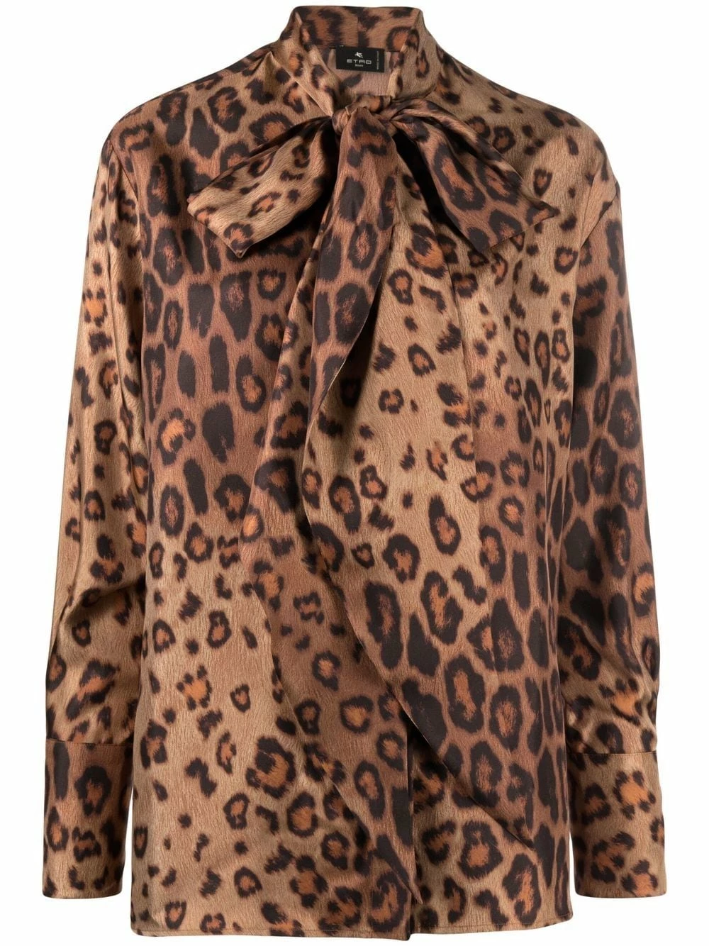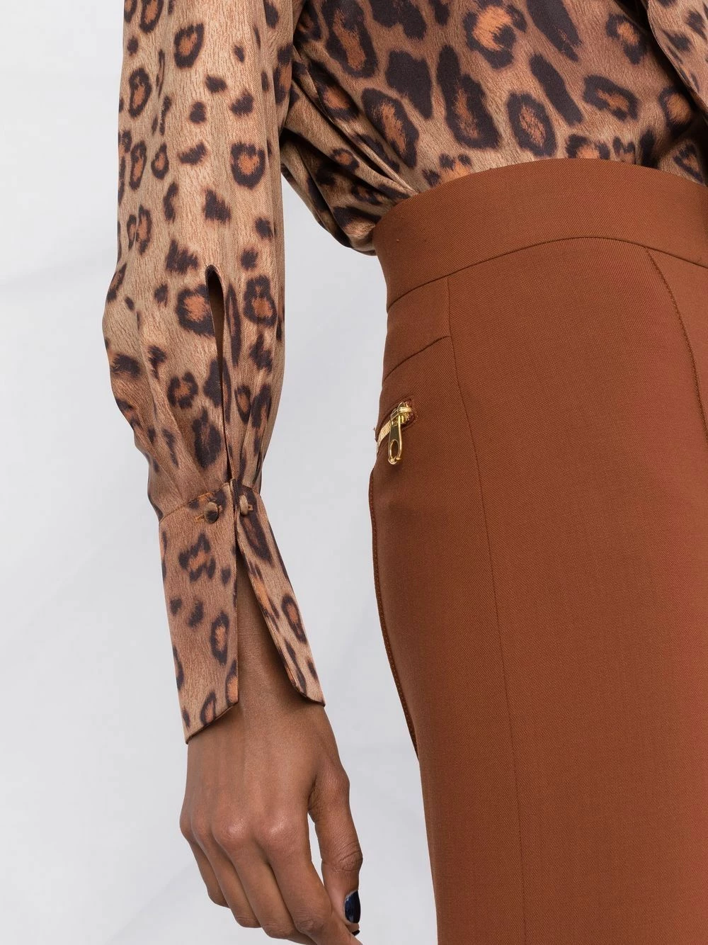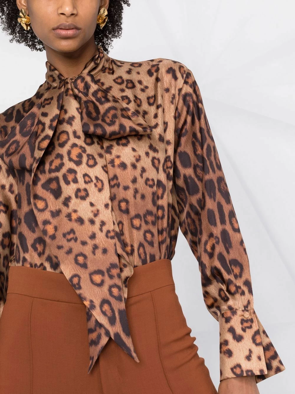 Imprimé léopard, col lavallière, manches longues, ourlet incurvé. Matière : soie.