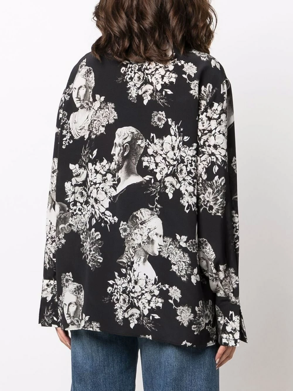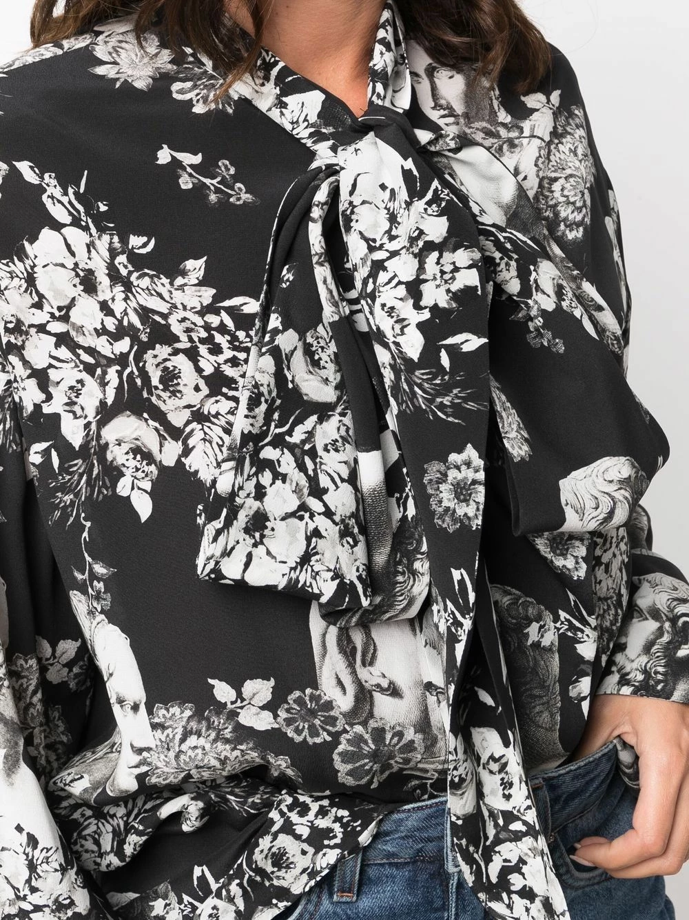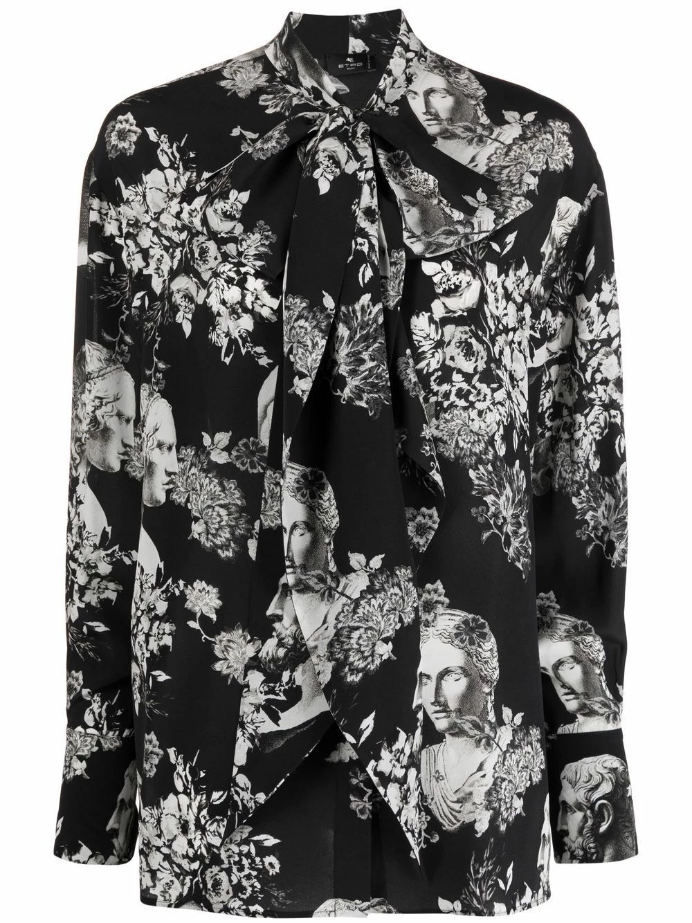 Imprimé graphique intégral, col lavallière, manches longues, ourlet droit. Matière : soie.