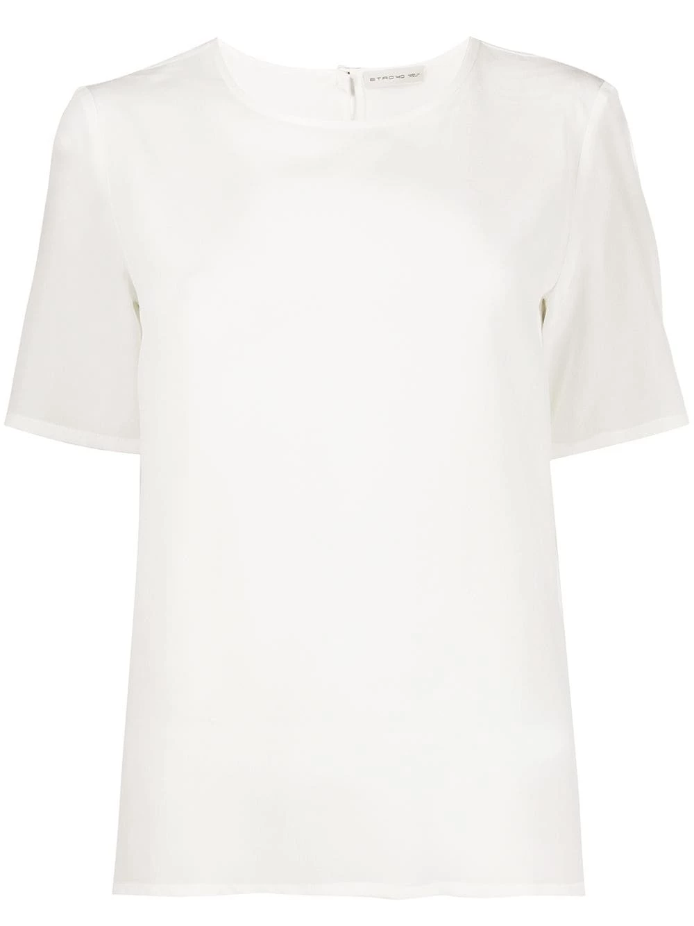 Blouse en soie à effet métallisé Etro avec encolure ronde, boutonnière au dos, manches courtes et ourlet droit. Couleur : blanc.