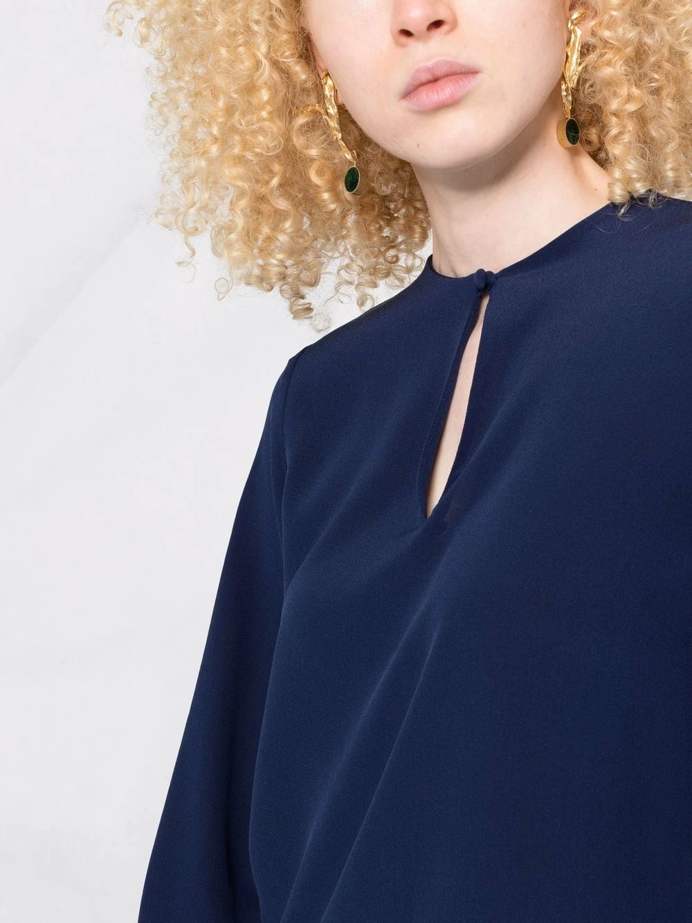 Col à ouverture goutte d’eau, boutonnière sur le devant, manches longues, poignets boutonnés, fentes latérales. Matière : soie.