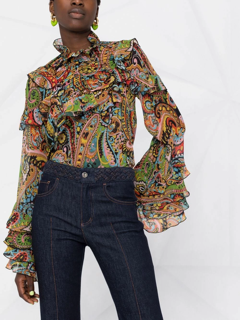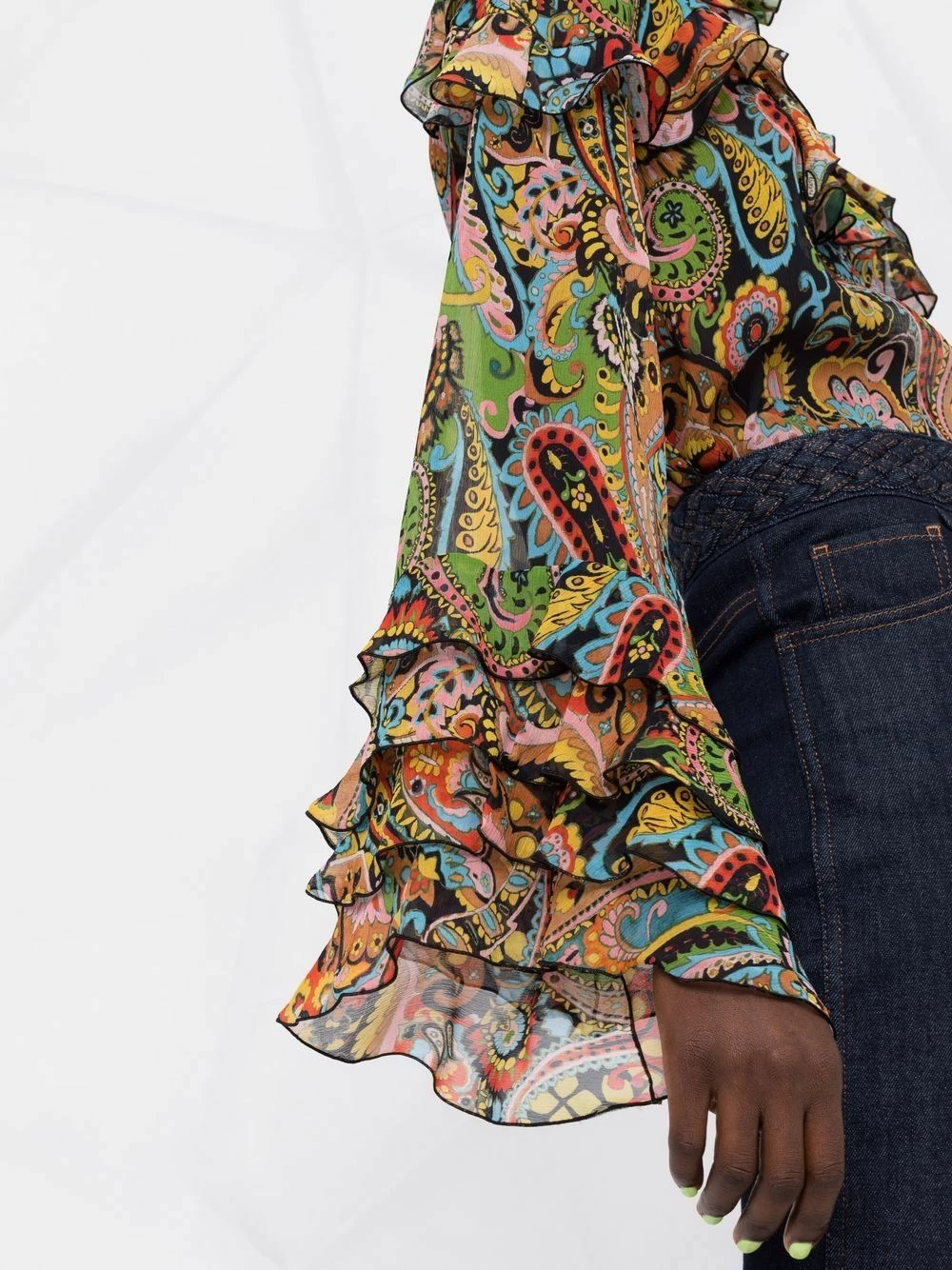 Structure légère, motif cachemire, design évasé, détails smockés, col montant volanté, manches longues, poignets évasés. Matière : soie.