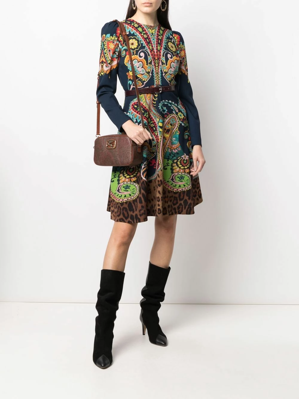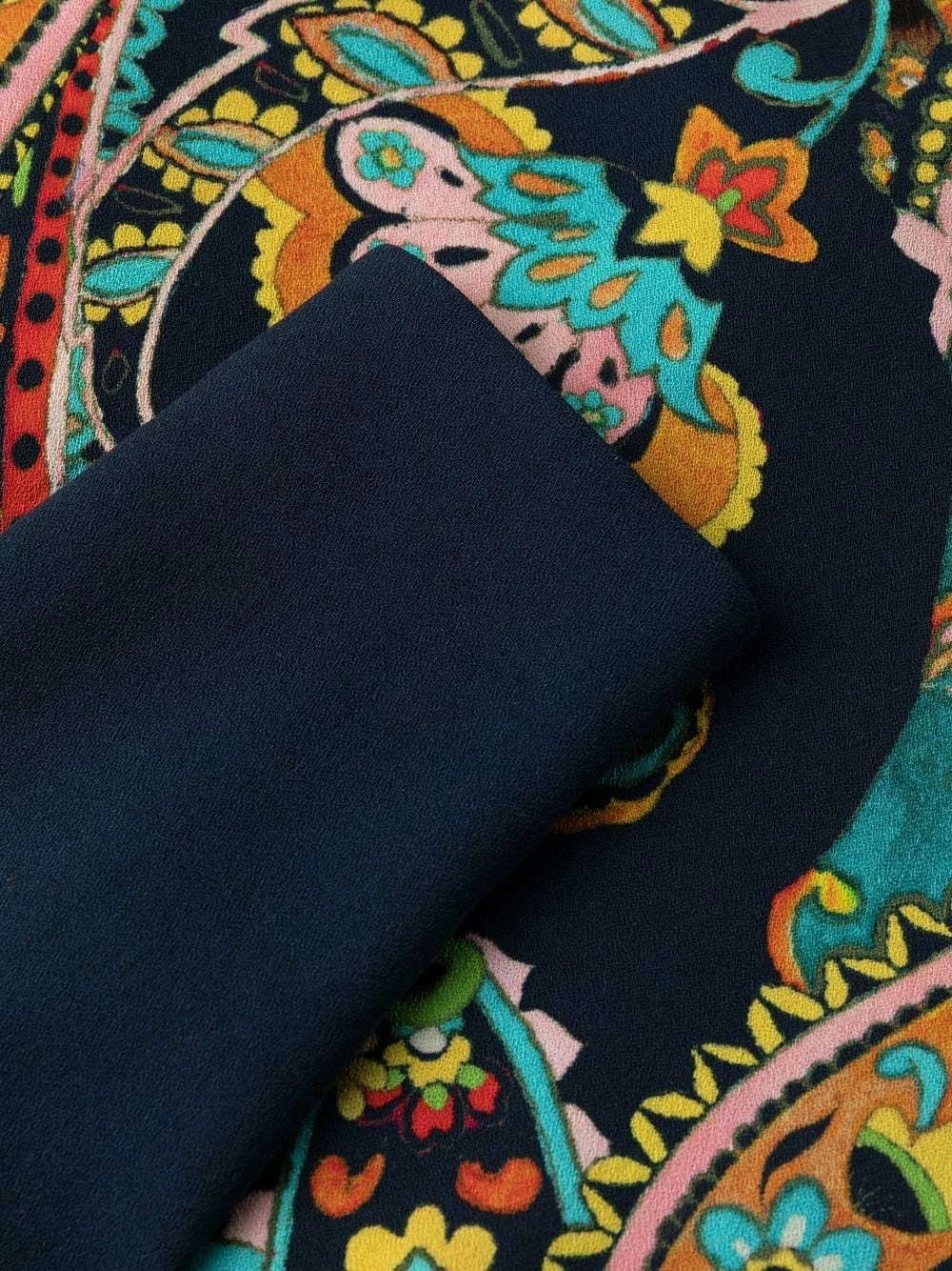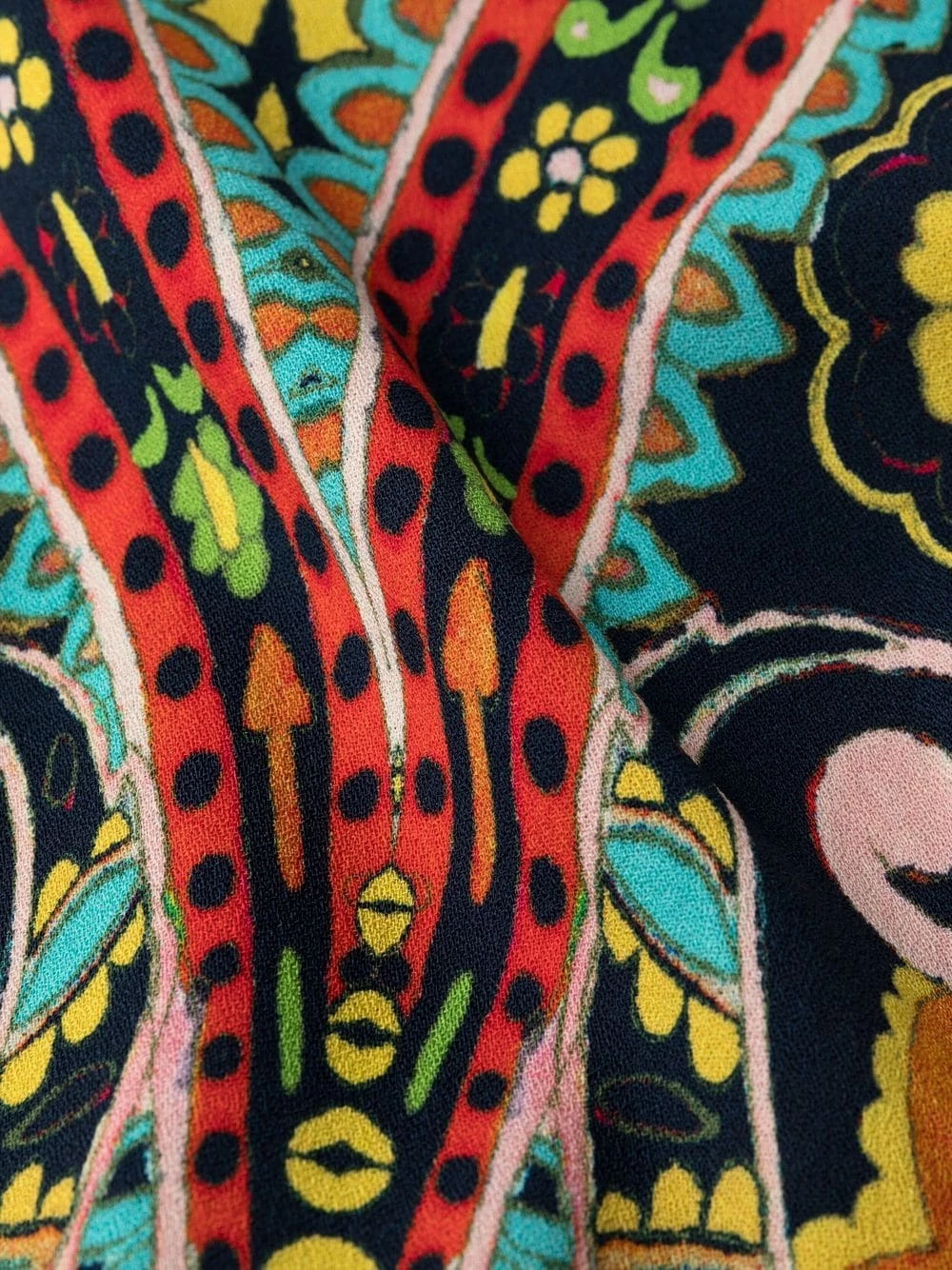 Mélange d’imprimés, encolure ronde, manches longues, ourlet évasé. Matière : laine.
