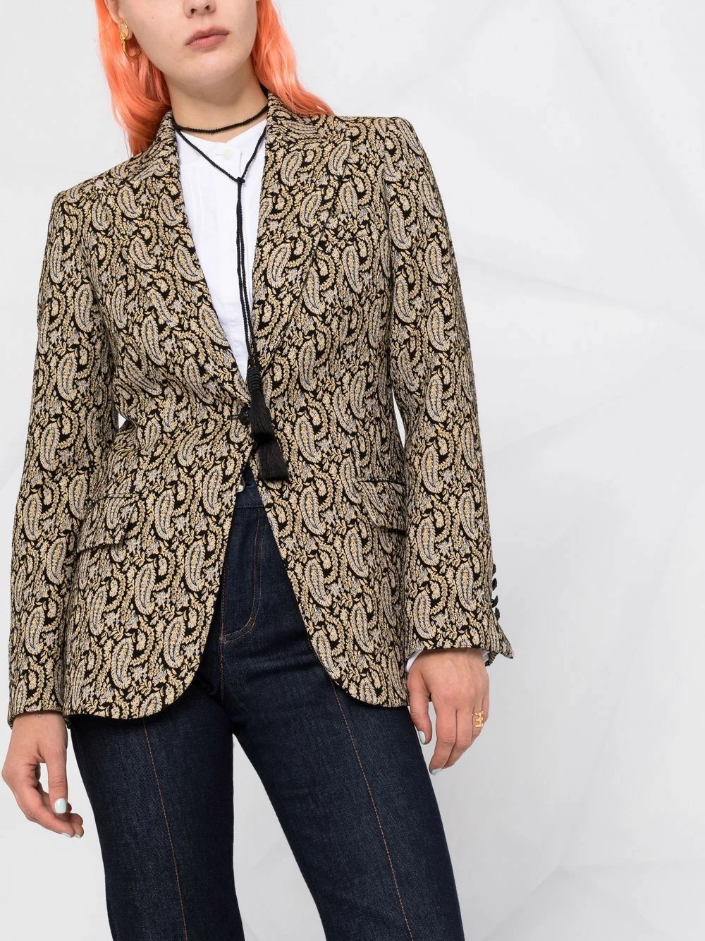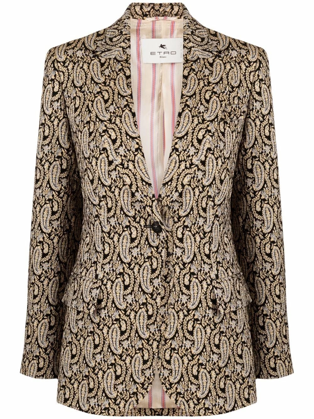 Tissage métallisé, motif cachemire, revers classiques, boutonnière sur le devant, manches longues, deux poches à rabat sur le devant. Matière : laine.