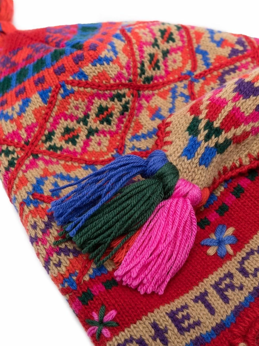 Broderies, design en maille, détail de pompon. Couleur : rose. Matière : laine.