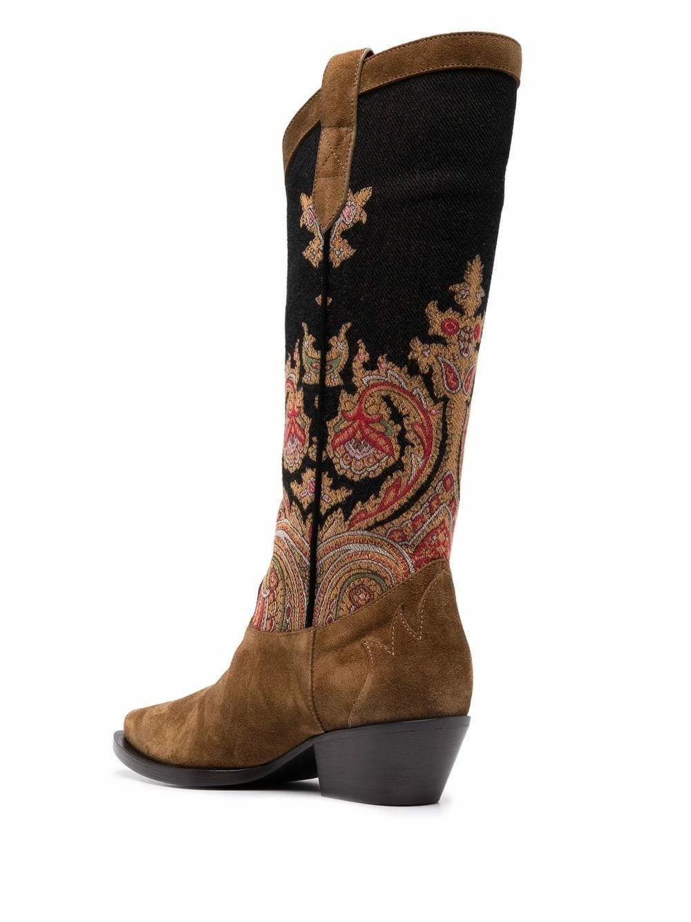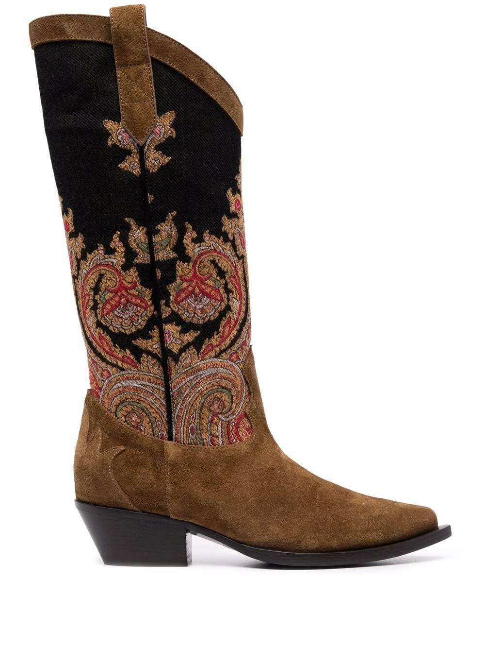 Motif cachemire, empiècement en daim, à enfiler, bout pointu, ouverture à double languette, petit talon. Matière : cuir.