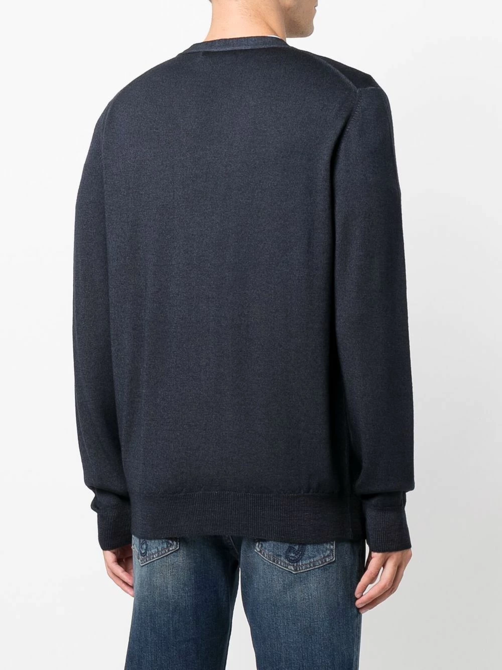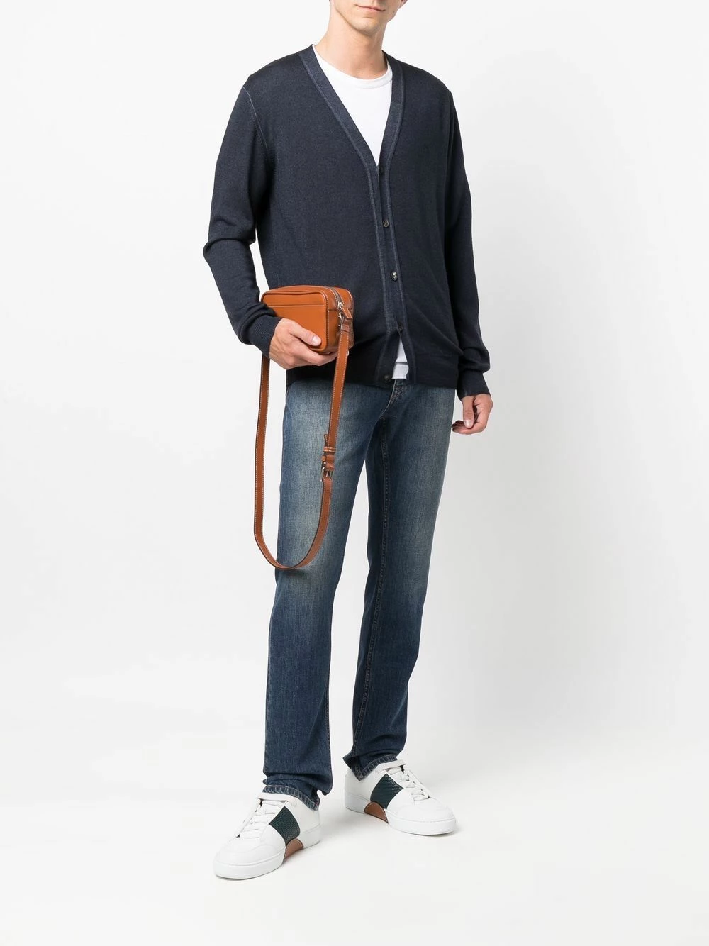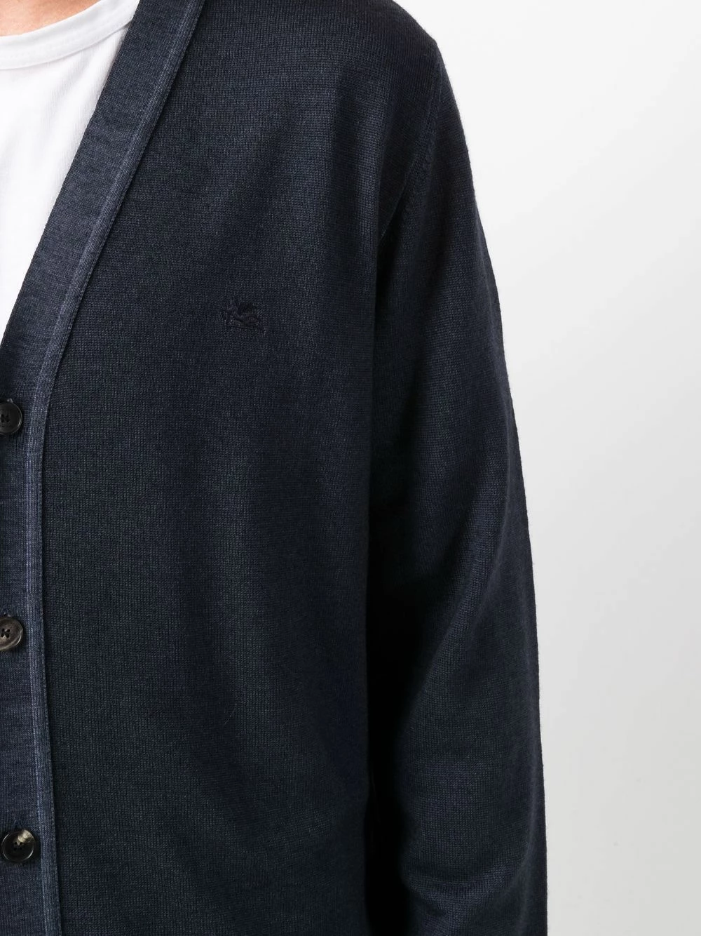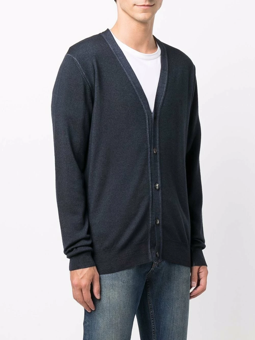 Bordure contrastante, col v, boutonnière sur le devant, manches longues, ourlet droit. Matière : laine vierge.
