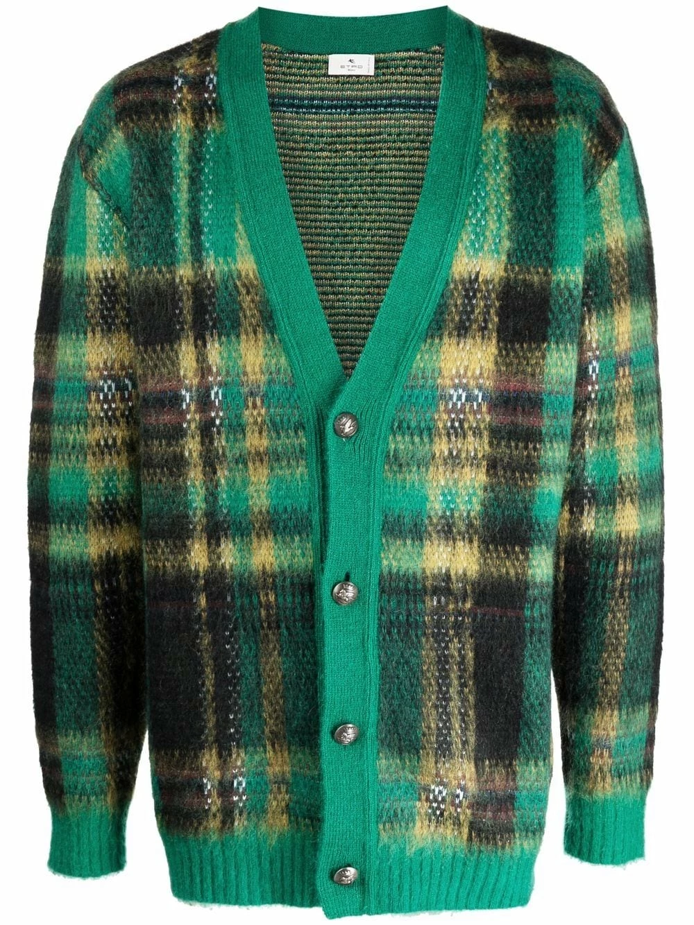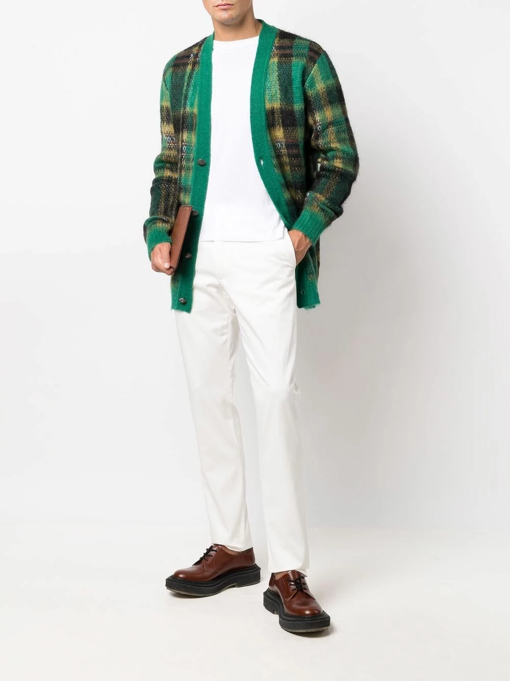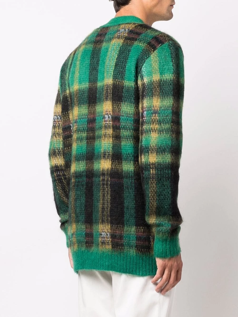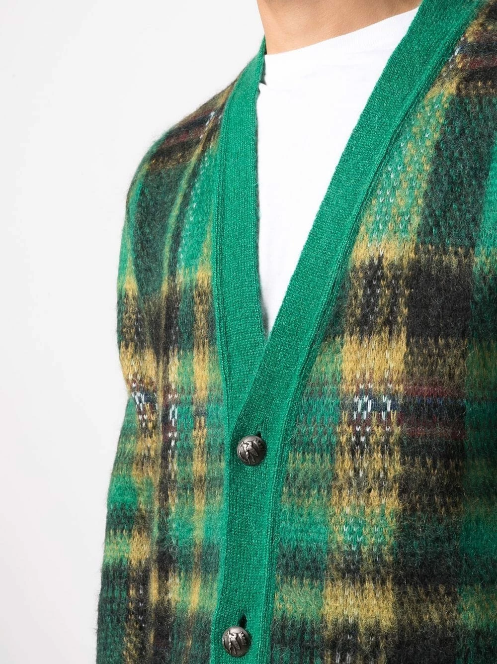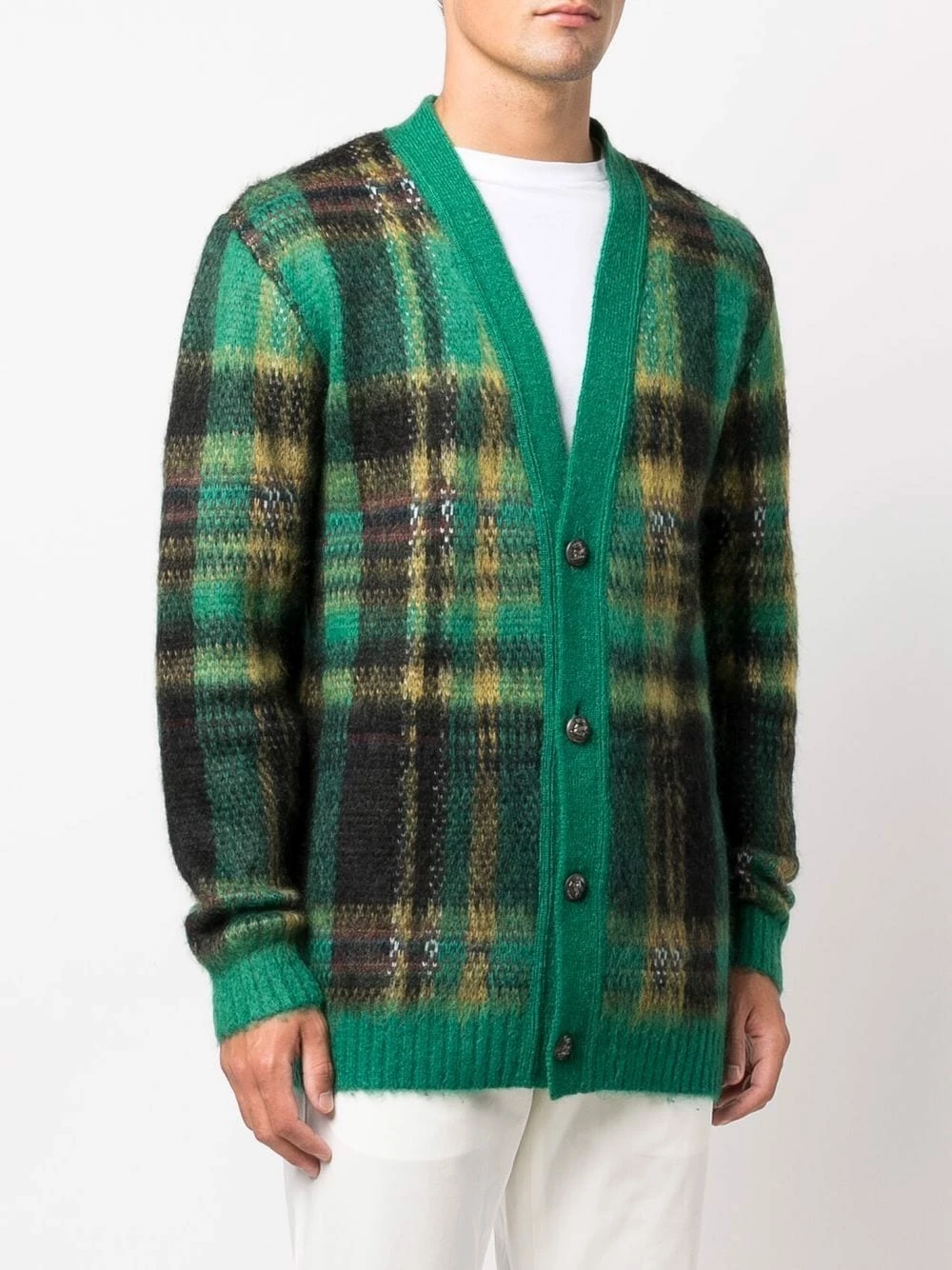 Motif tartan, motif intarsia, bord en maille côtelée, col v, manches longues, boutonnière sur le devant.