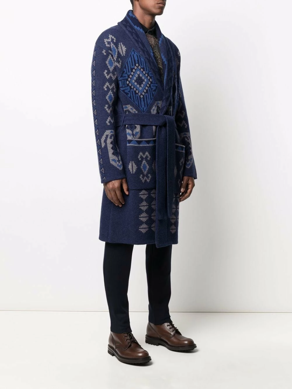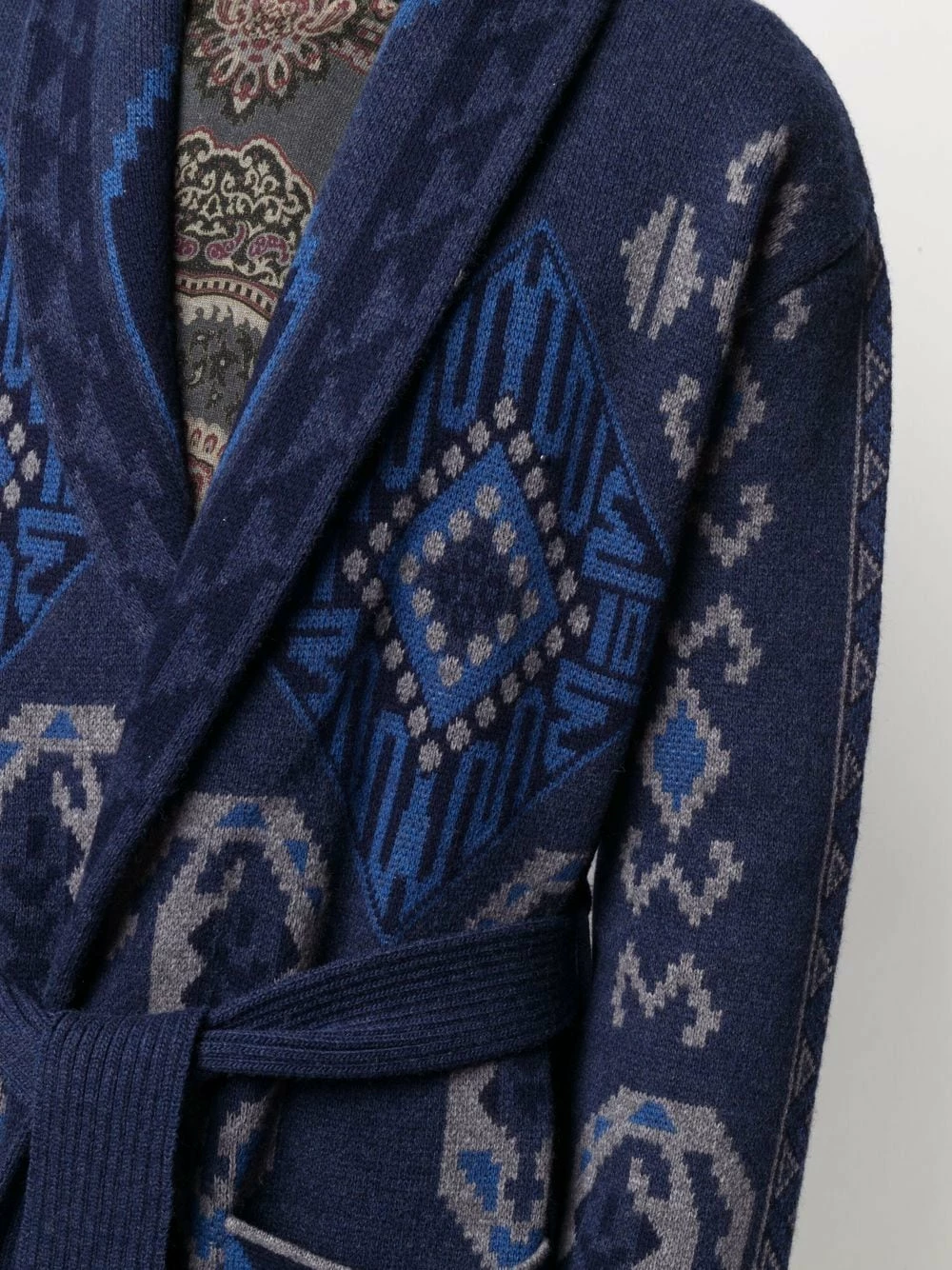 Motif intarsia, col châle, taille ceinturée, effet d’épaules descendues, manches longues, deux poches plaquées avant. Matière : laine.