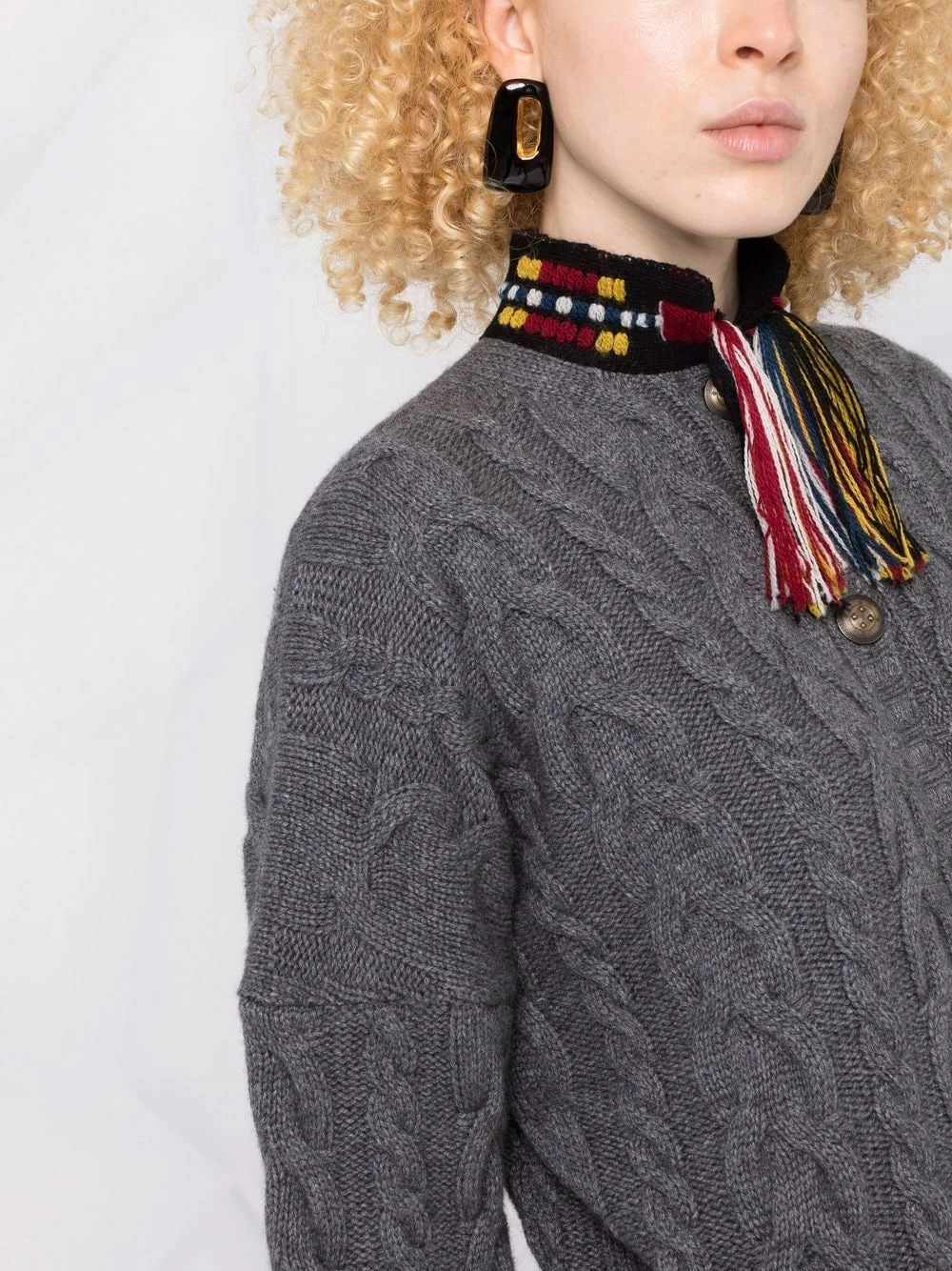 Tricot torsadé, détail de pompon, bordures brodées, boutonnière sur le devant, manches longues, ourlet droit, coupe courte. Couleur : gris.