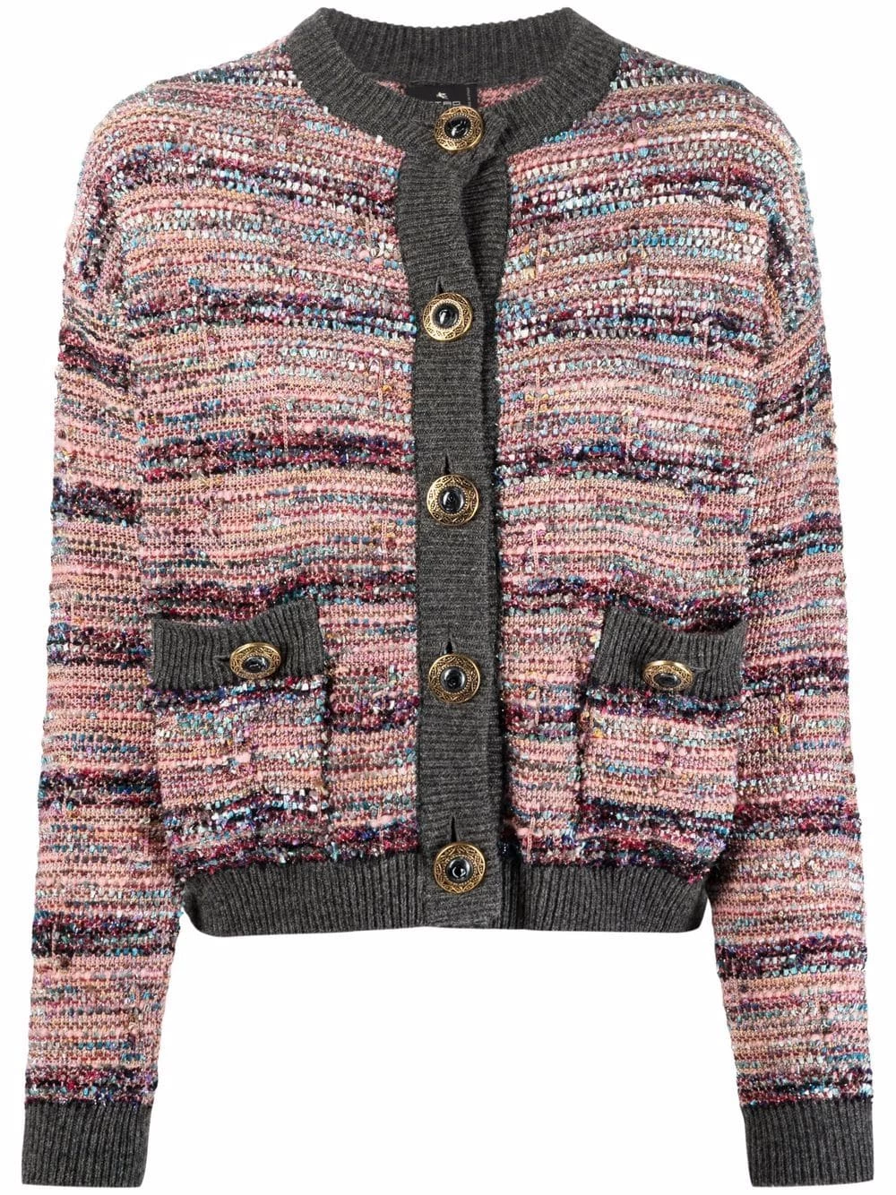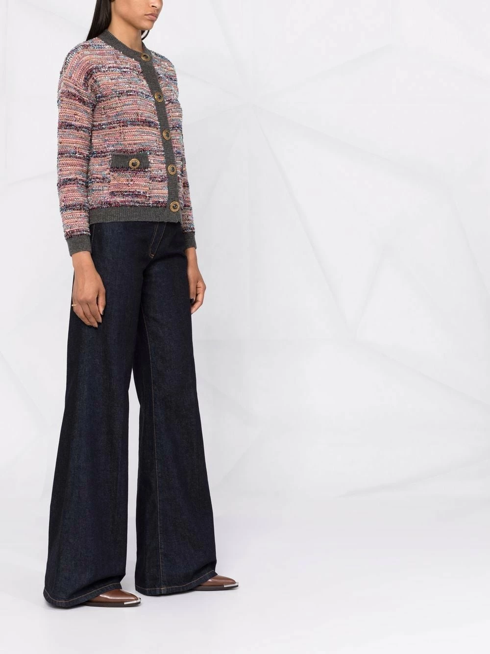 Maille épaisse, encolure ronde, boutons dorés à détails embossés, manches longues, deux poches plaquées avant, poignets élastiqués, ourlet élastiqué.