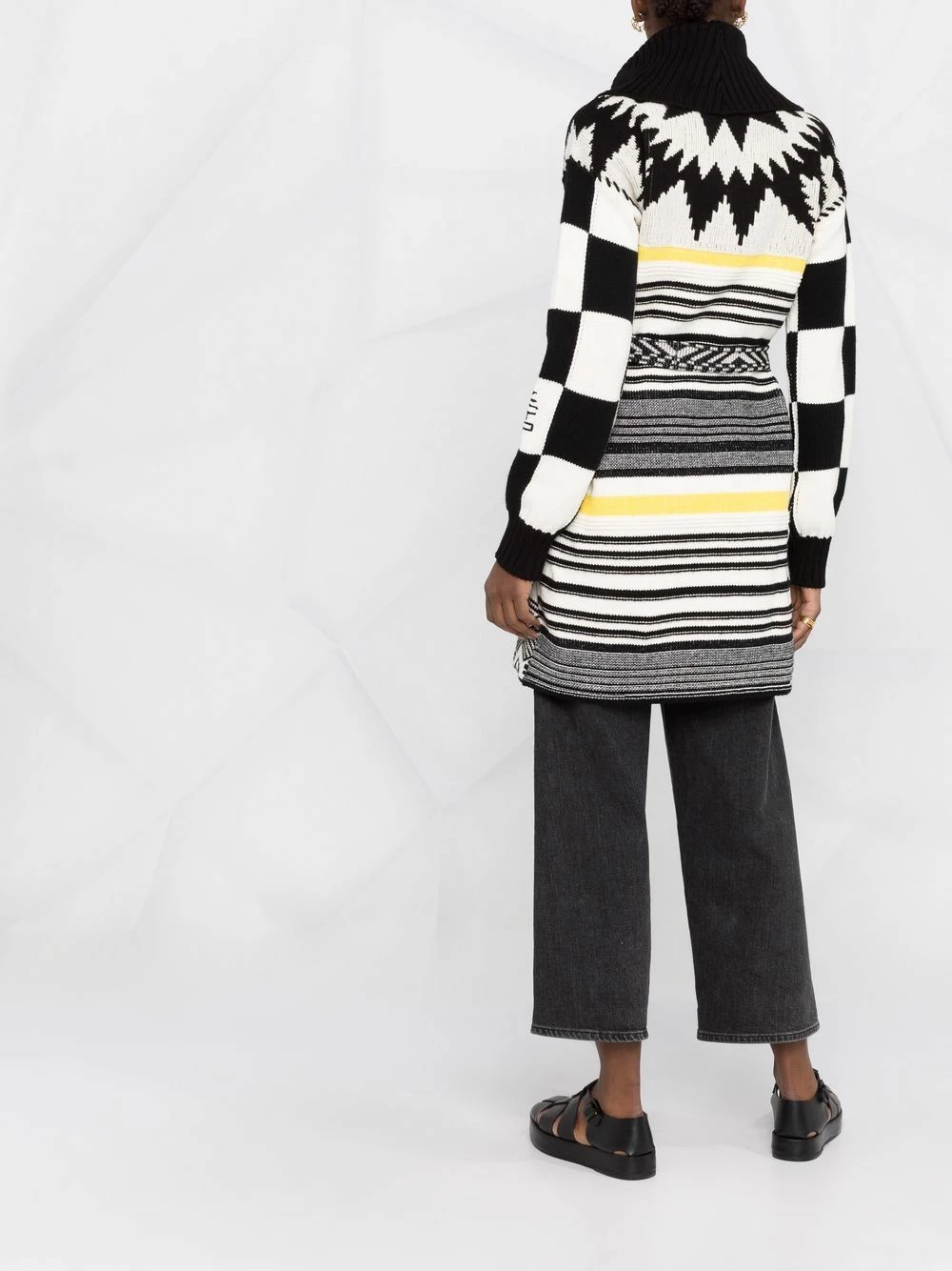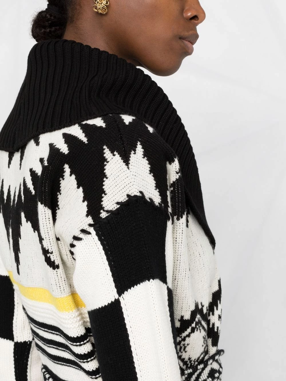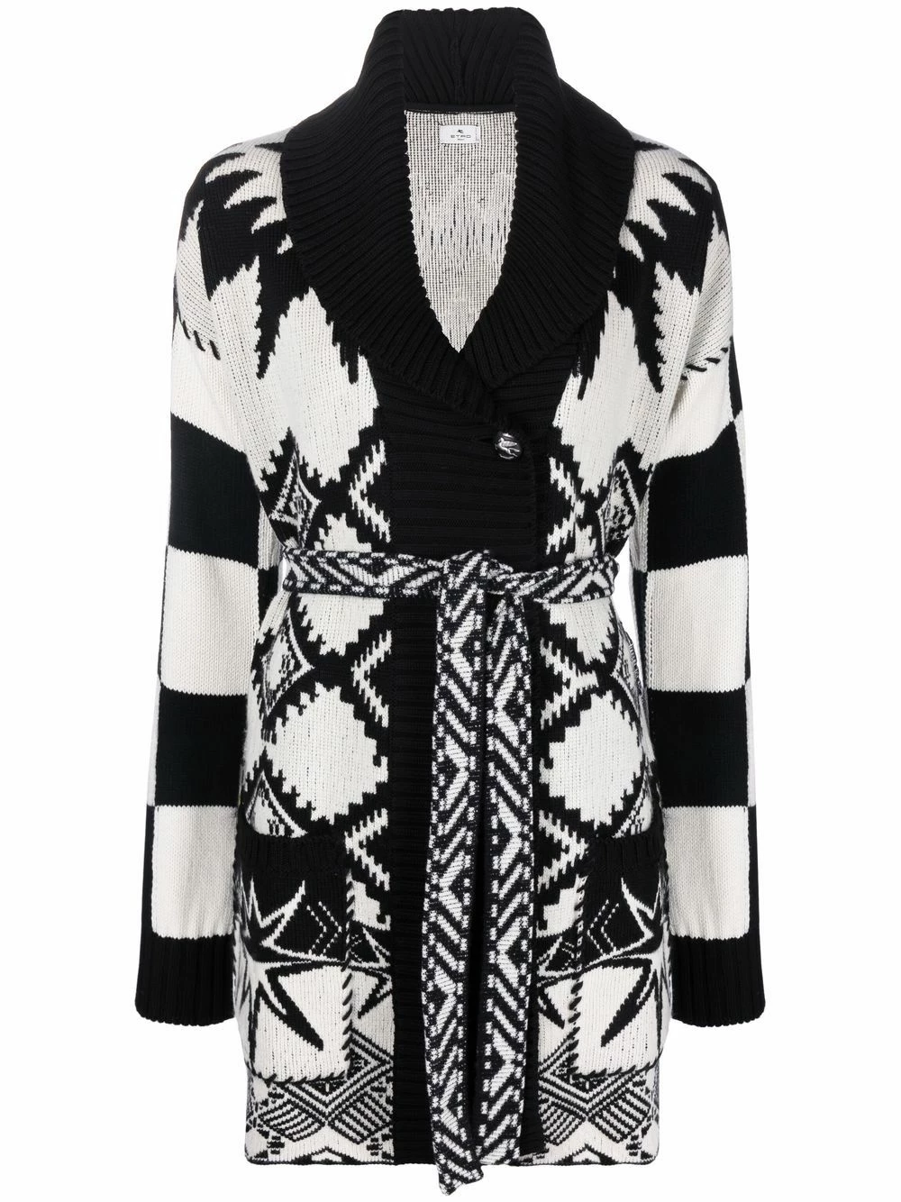 Maille intarsia, col v, boutonnière décalée sur le devant, taille ceinturée, manches longues, finitions nervurées, coupe courte, deux poches plaquées avant.