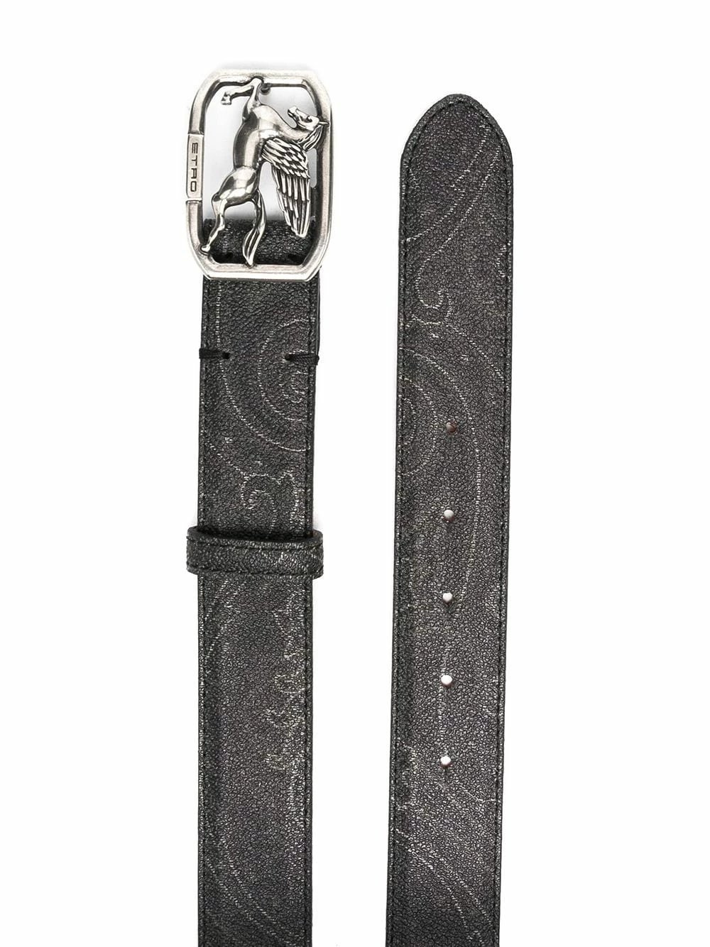 Motif cachemire, fermeture à boucle logo, taille ajustable. Matière : cuir de veau.