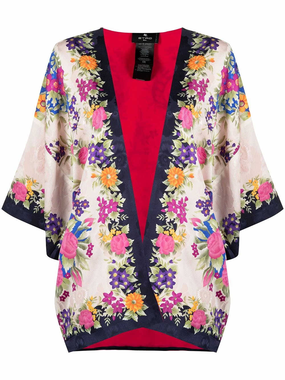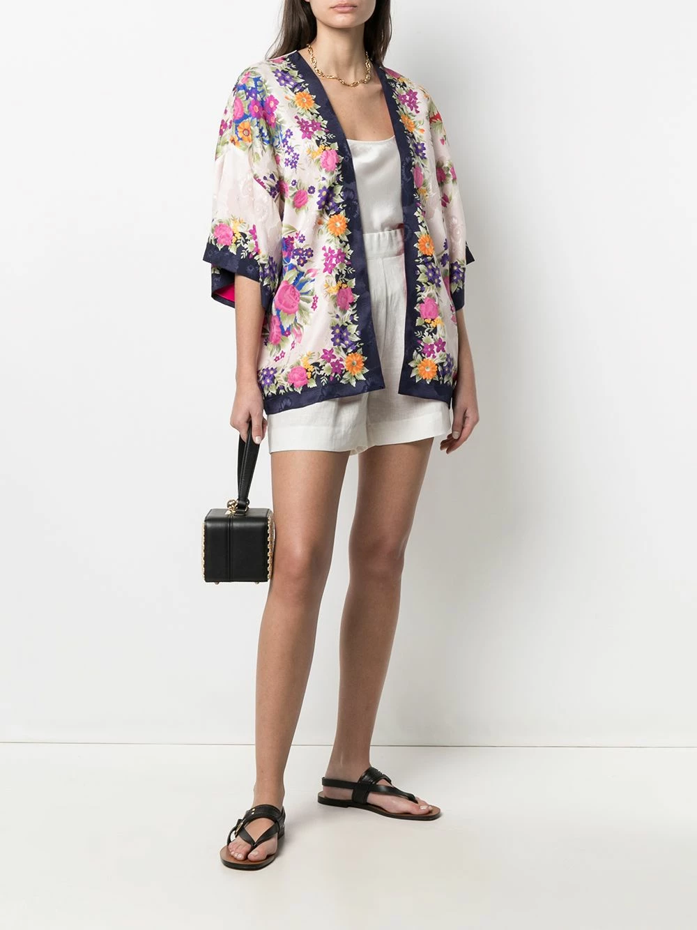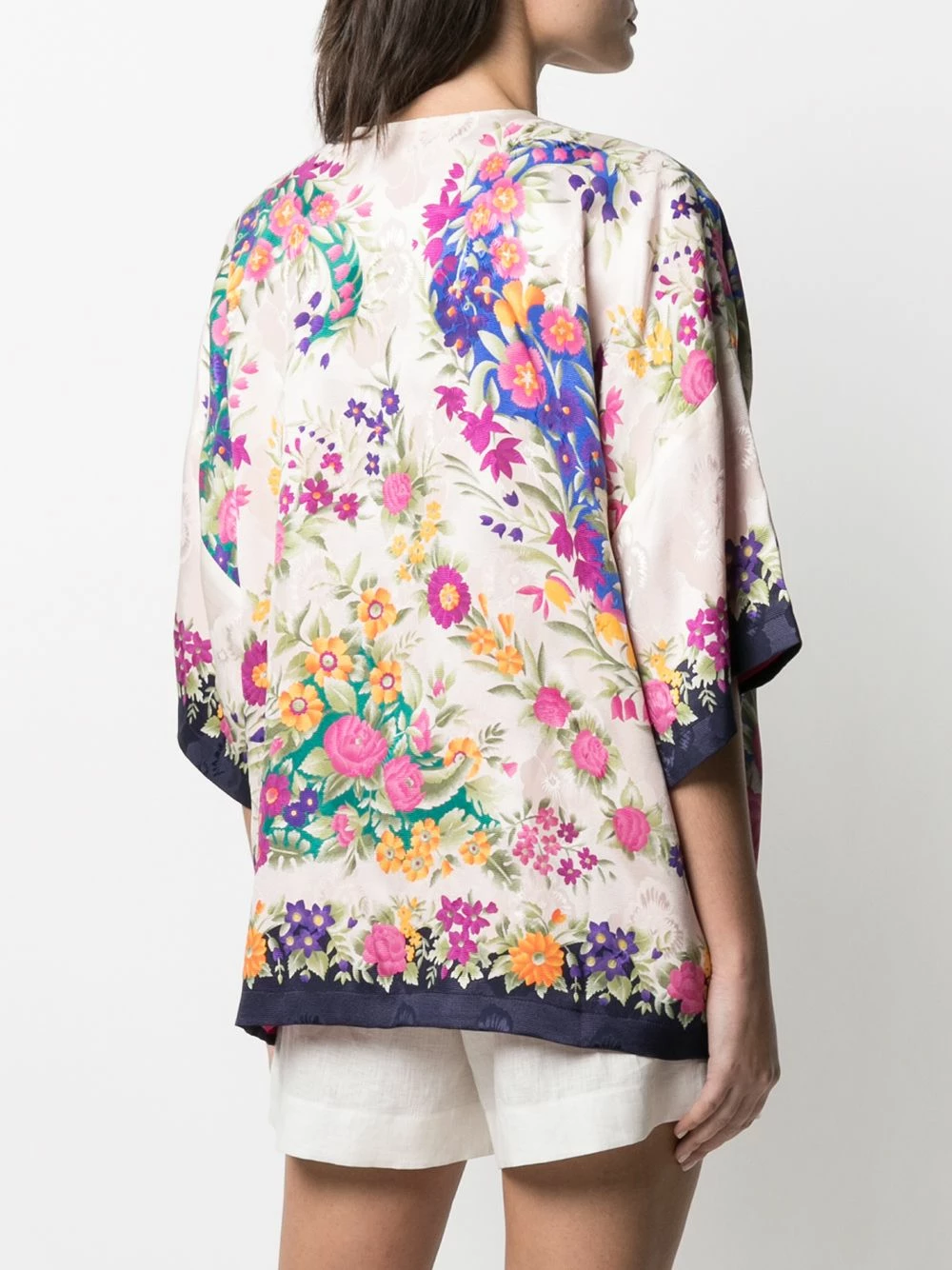 Motif de fleurs, design drapé, manches courtes. Couleur : Tons neutres. Matière : soie.