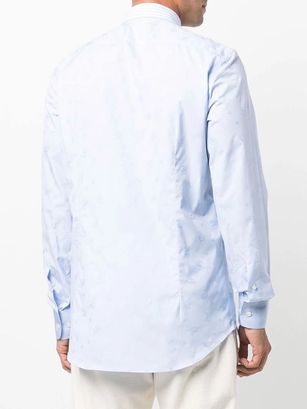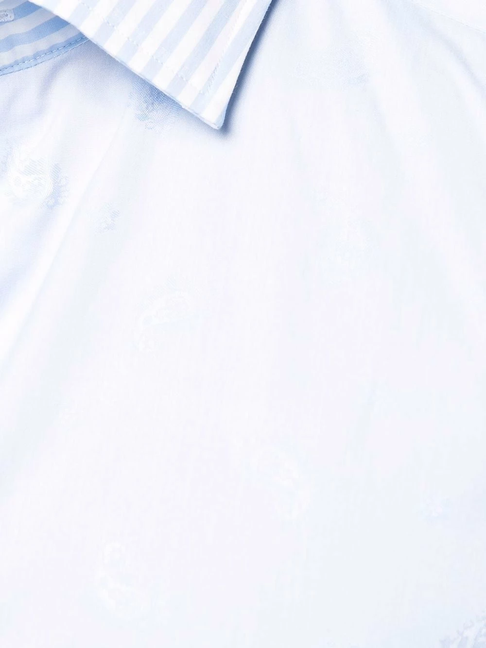 Col contrastant, boutonnière sur le devant, manches longues, ourlet incurvé. Couleur : bleu. Matière : coton.