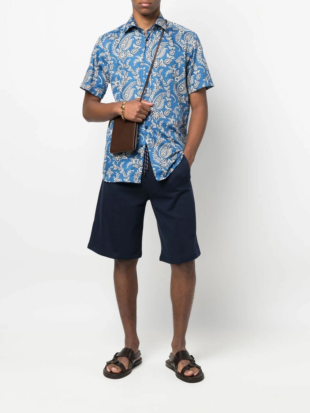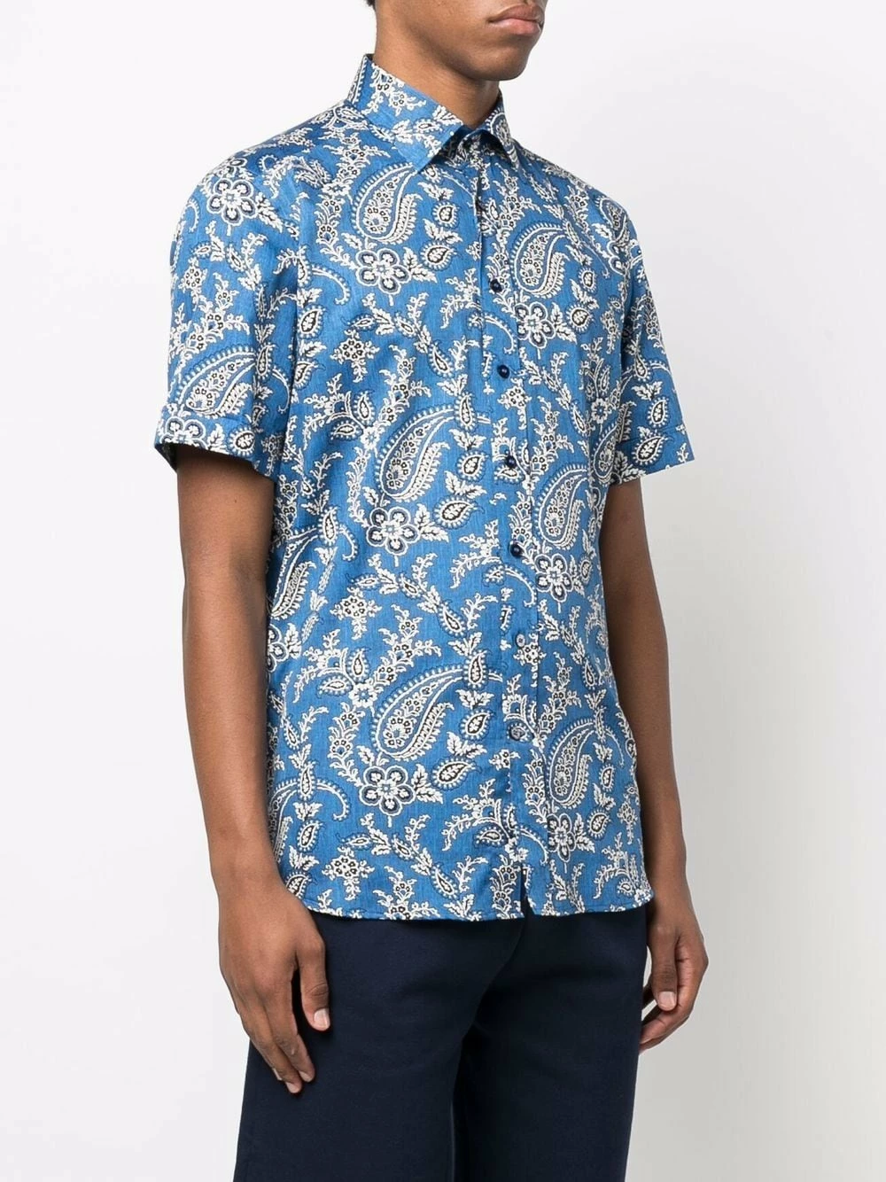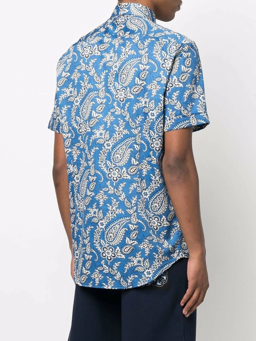 Motif cachemire, col classique, boutonnière sur le devant, manches courtes, ourlet incurvé. Couleur : bleu. Matière : coton.