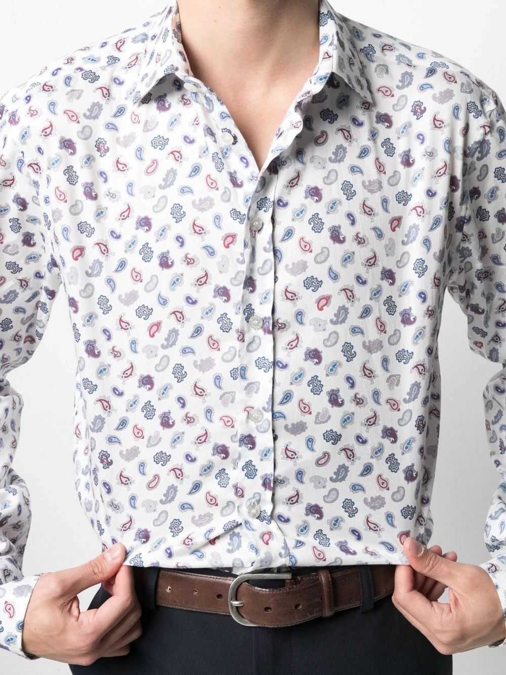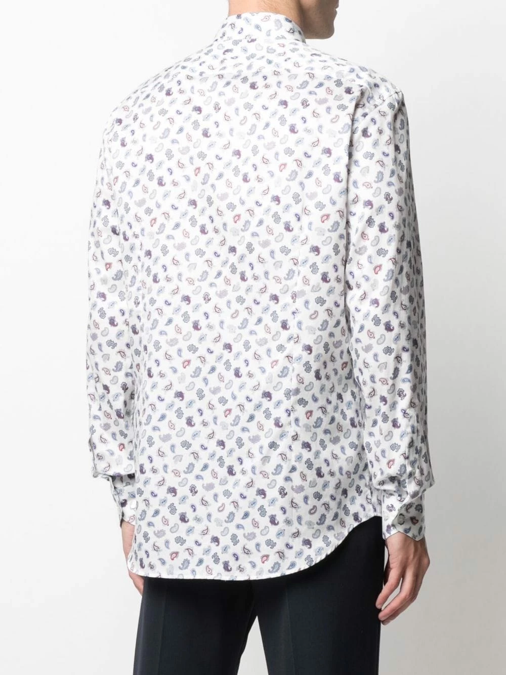 Motif cachemire, col italien, boutonnière sur le devant, manches longues, poignets boutonnés, ourlet incurvé. Couleur : blanc. Matière : coton.