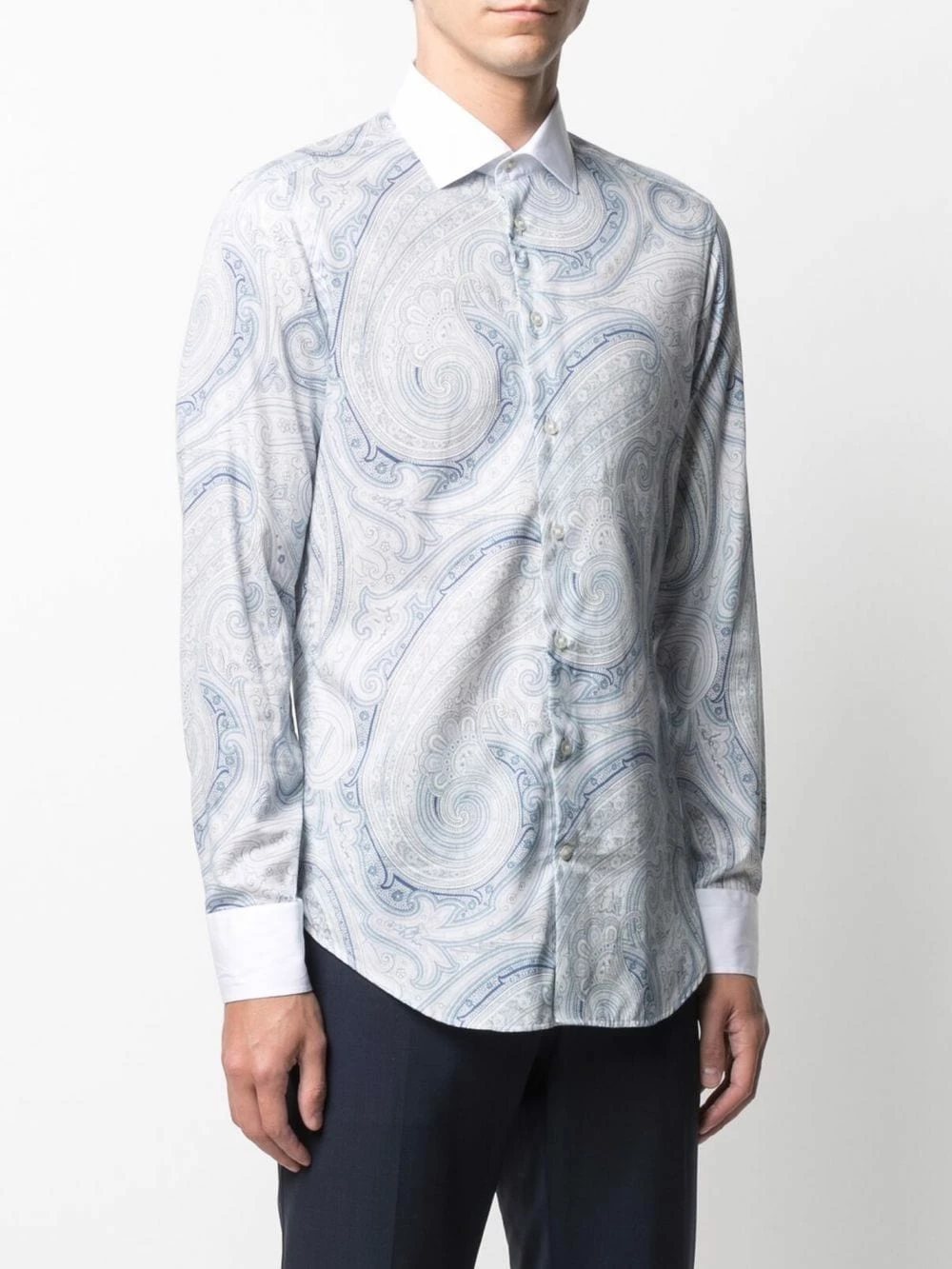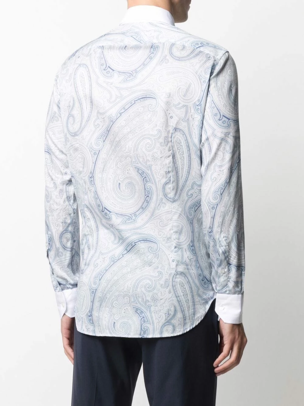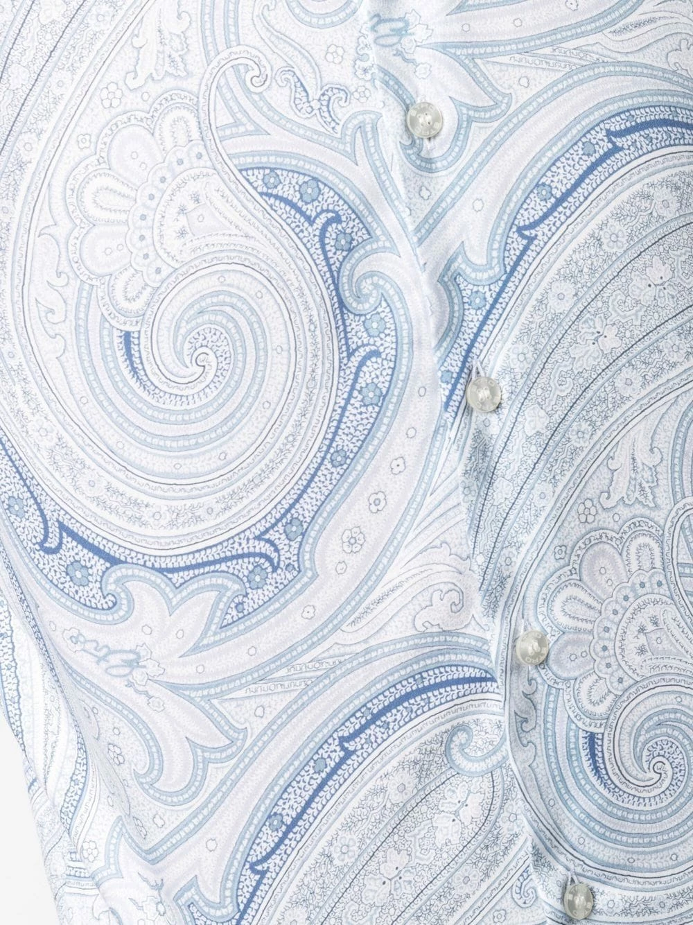 Motif cachemire, col classique, boutonnière sur le devant, manches longues, ourlet droit. Couleur : bleu. Matière : coton.