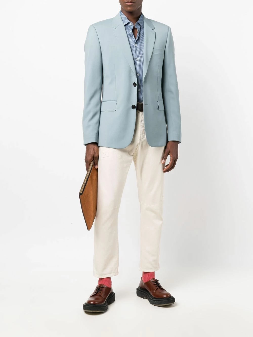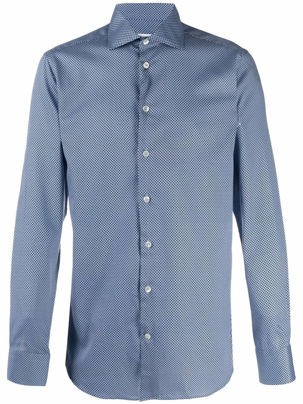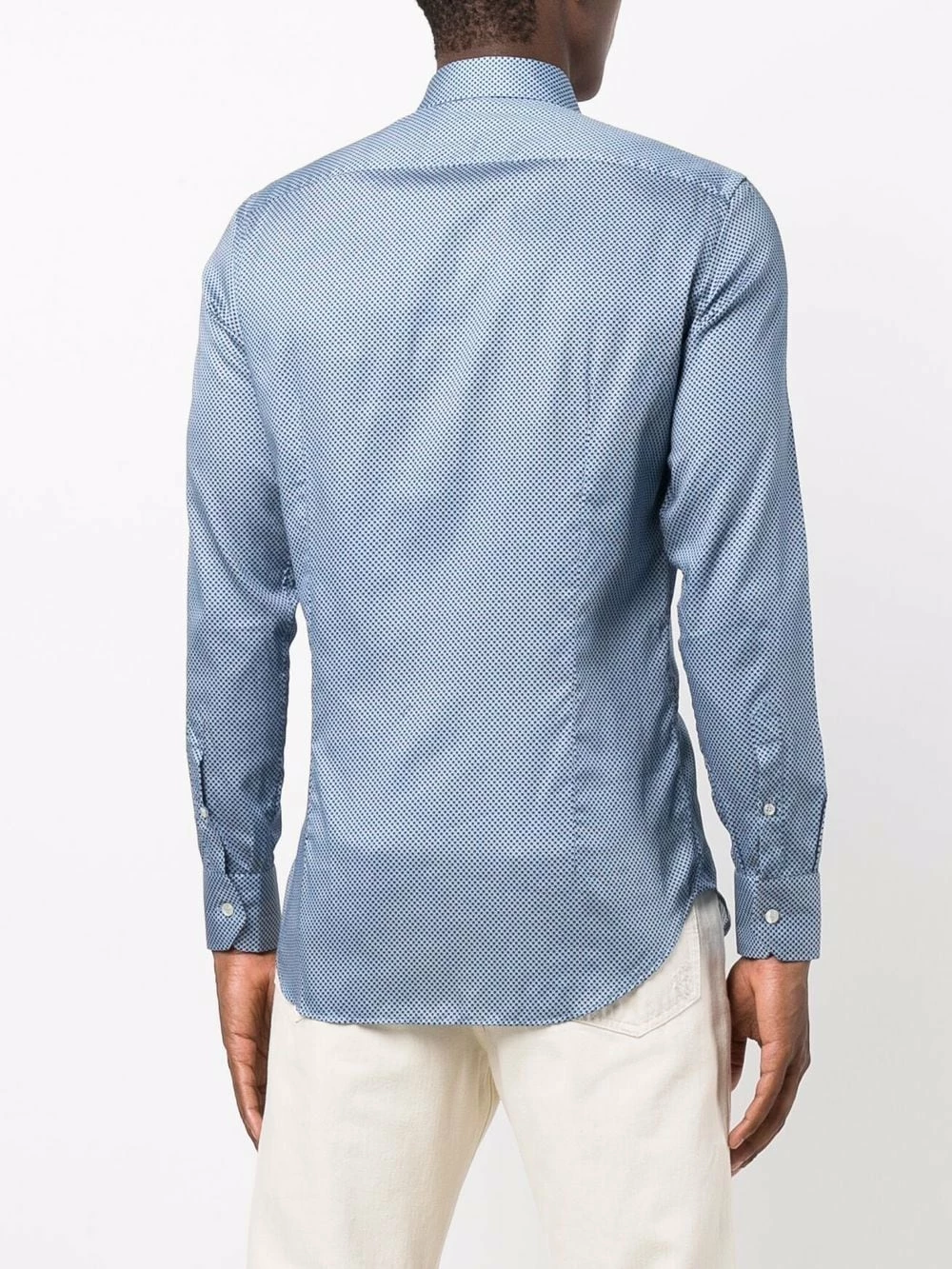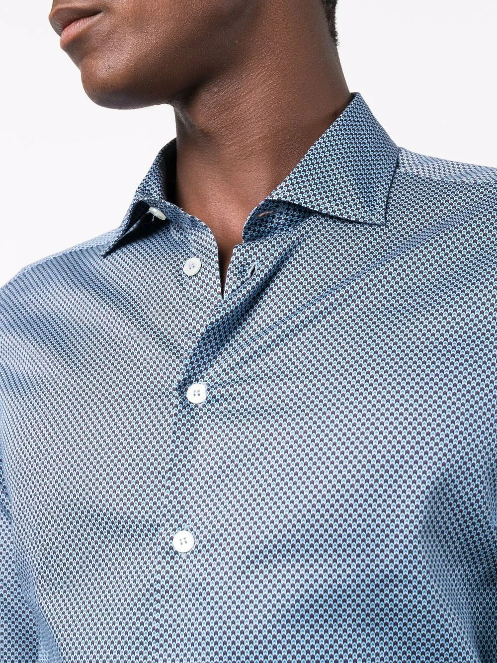 Motif géométrique, col classique, boutonnière sur le devant, manches longues, poignets boutonnés, ourlet incurvé. Couleur : bleu. Matière : coton.
