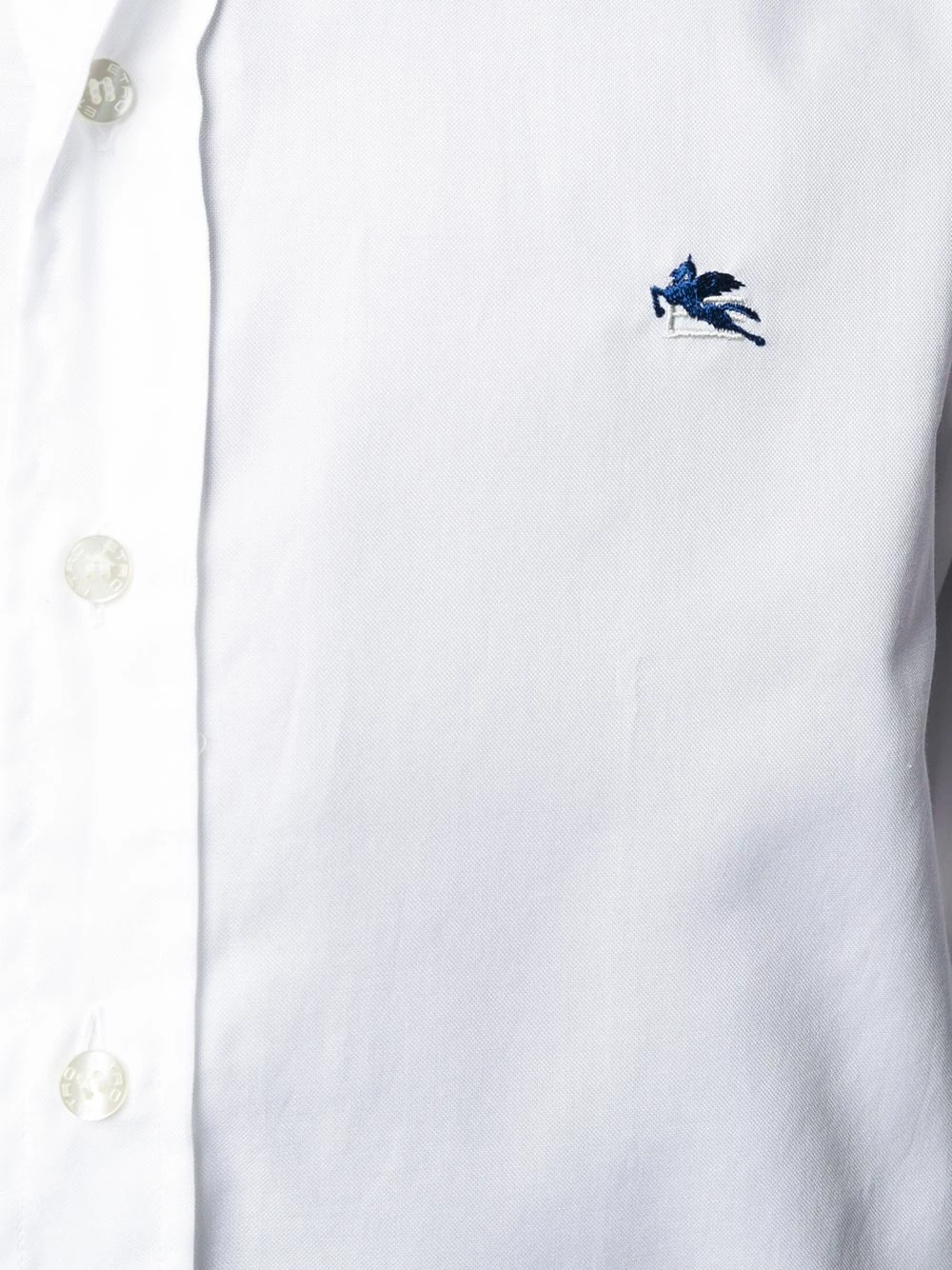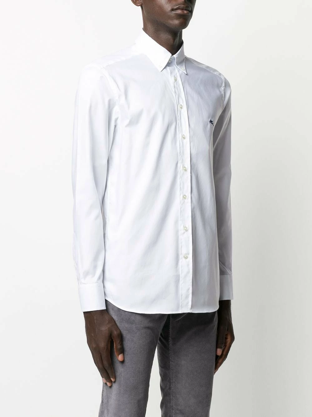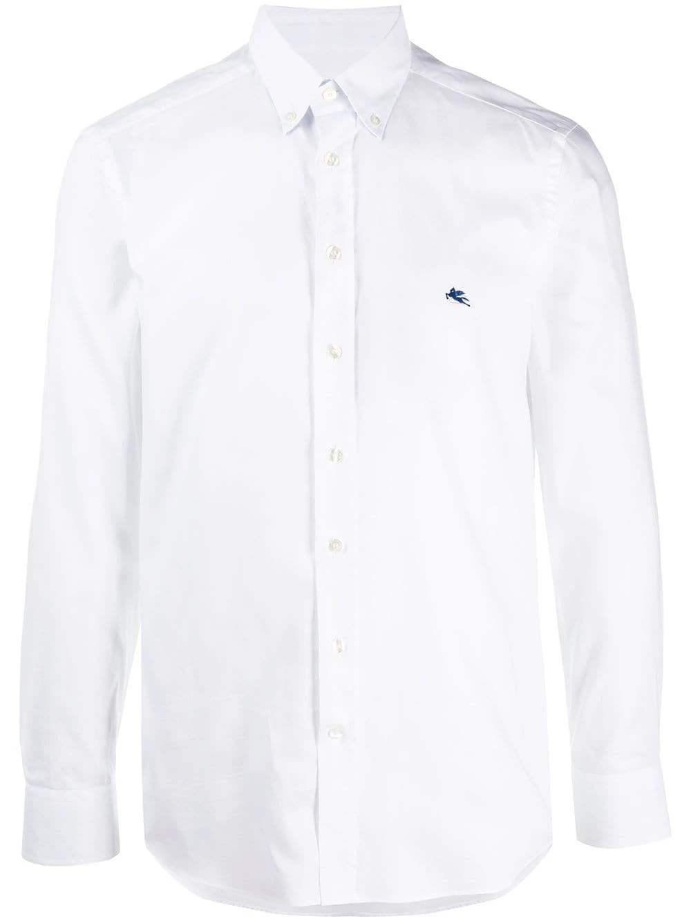 Logo brodée sur la poitrine, col pointu, manches à poignets boutonnés, ourlet incurvé, boutonnière sur le devant. Couleur : blanc. Matière : coton.