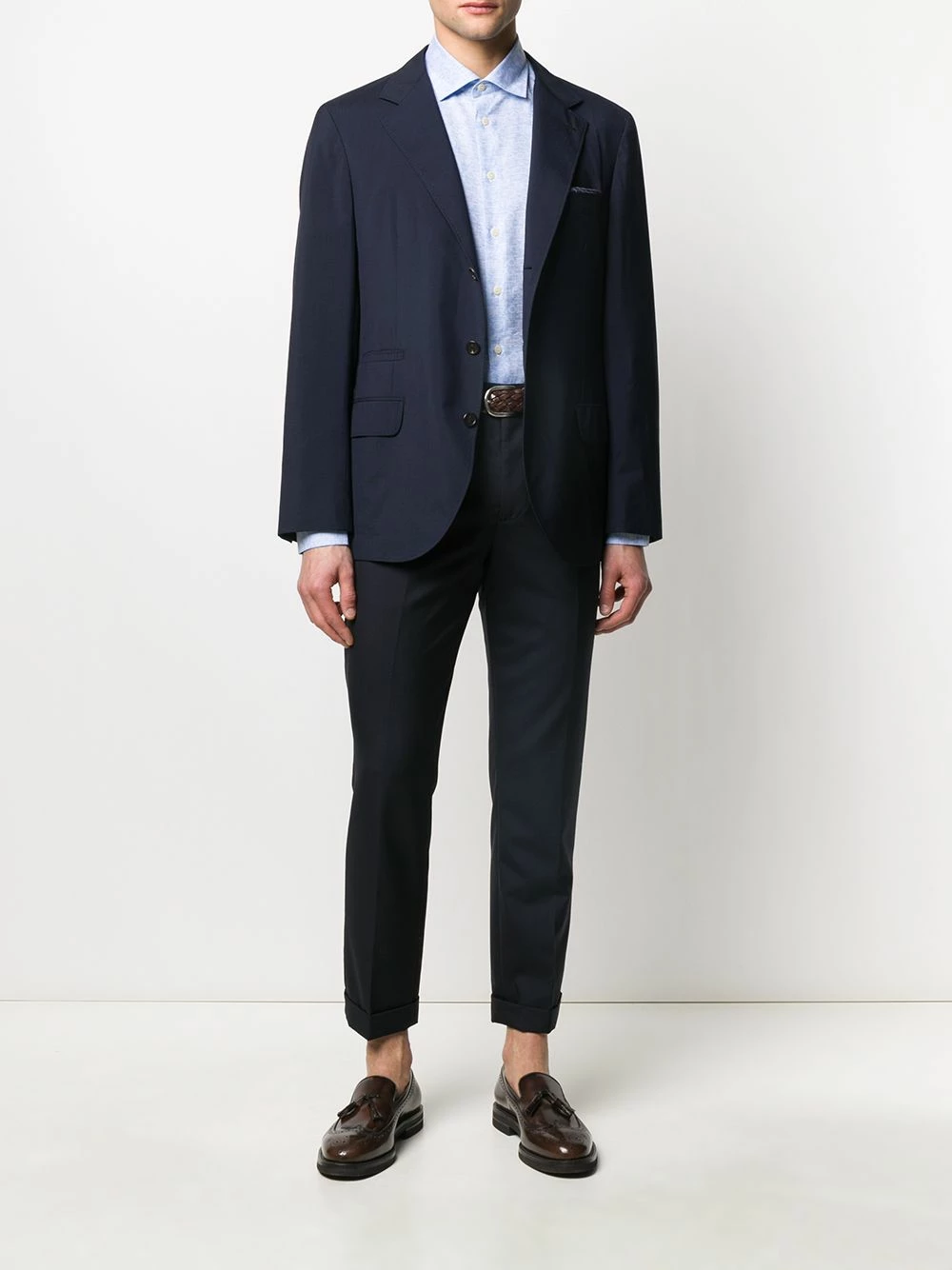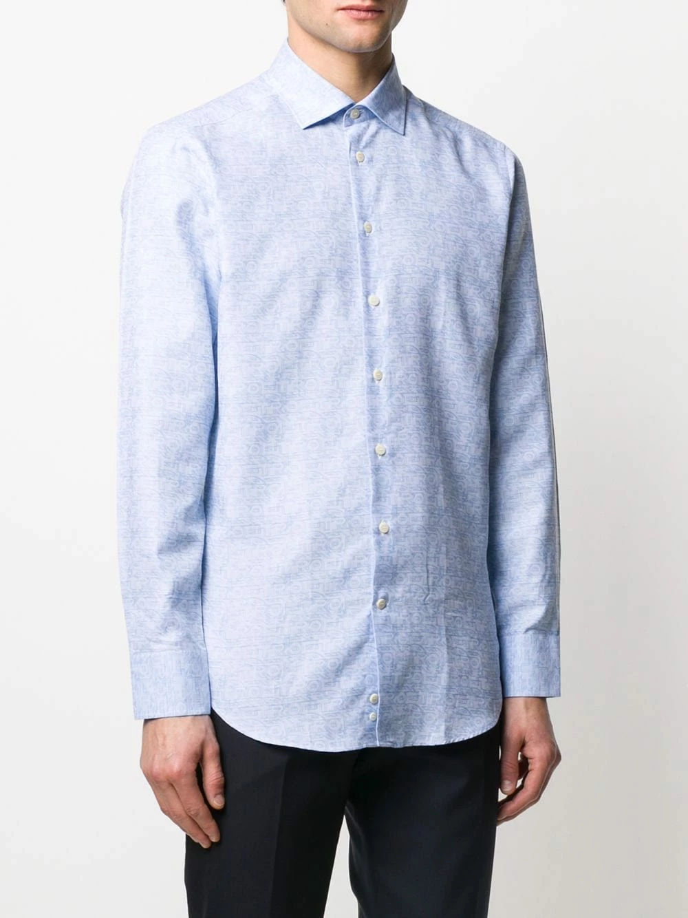 Chemise à logo imprimé Etro avec col pointu, boutonnière sur le devant, manches longues, poignets boutonnés et ourlet incurvé. Couleur : bleu.