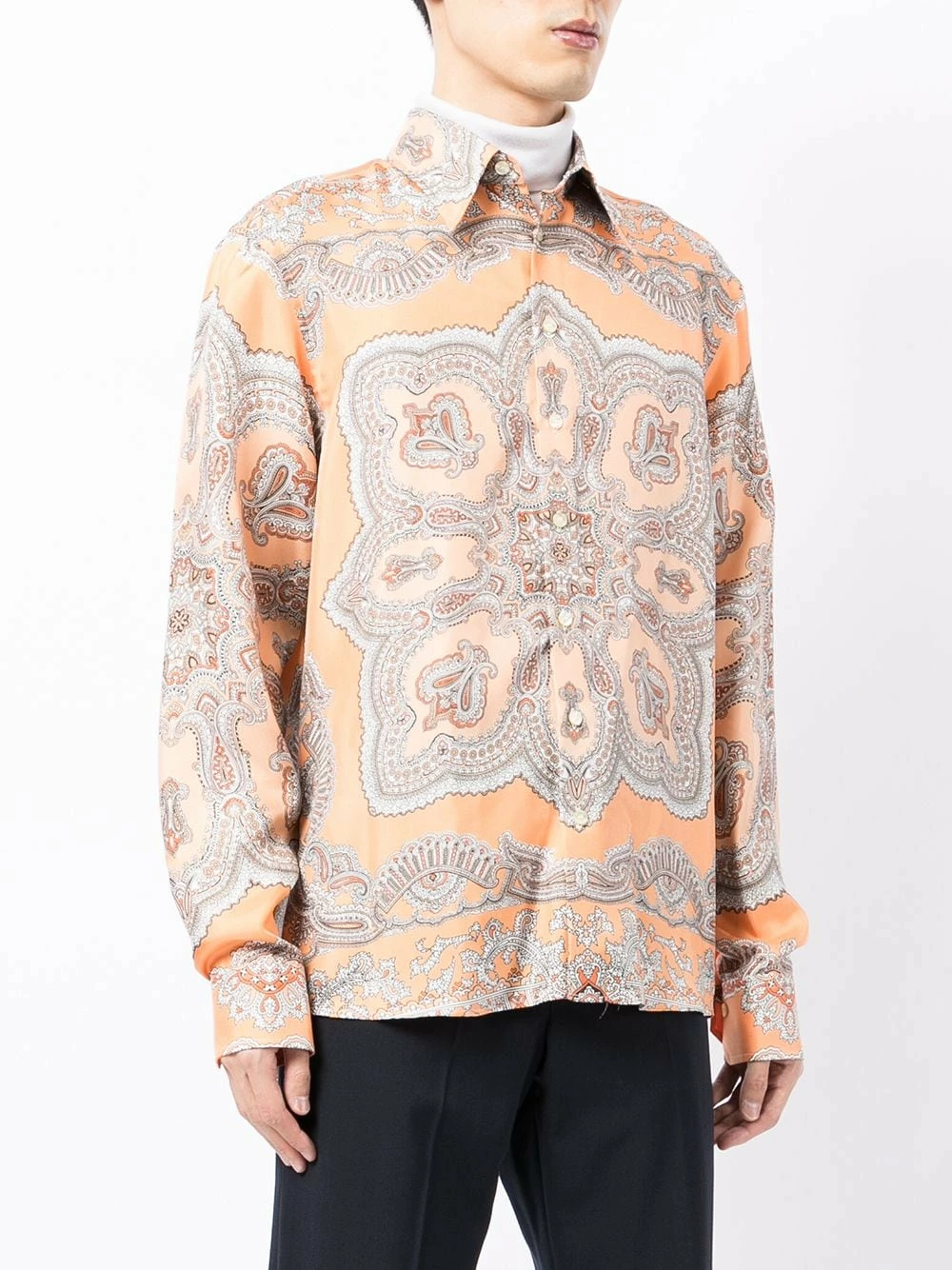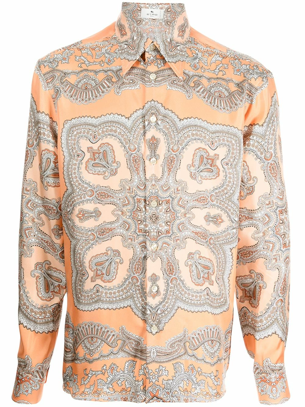 Motif cachemire, col oversize à bouts pointus, manches longues, ourlet droit. Couleur : orange. Matière : soie.
